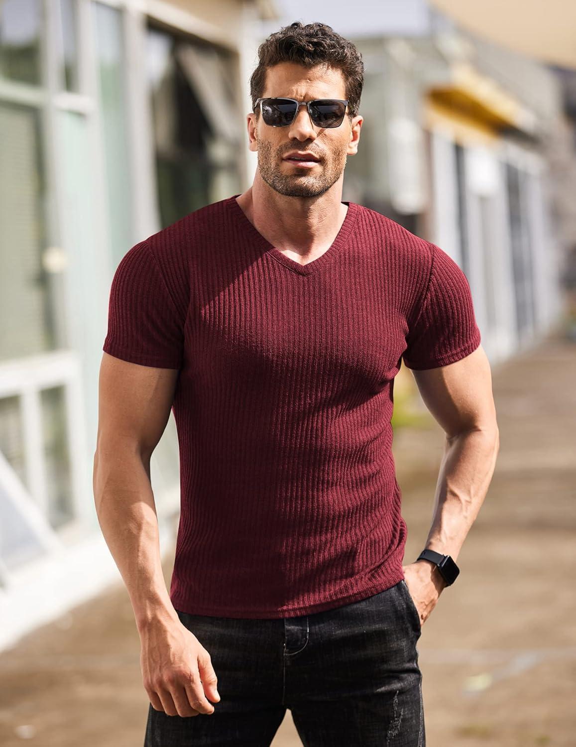 COOFANDY Men's Muscle T Shirts Stretch Short Sleeve V Neck Bodybuilding Workout Tee Shirts Ribbed Knit Shirt(Wine Red)