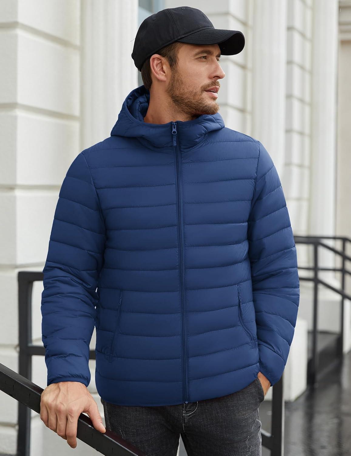COOFANDY Mens Packable Puffer Jacket Lightweight Hooded Insulated Winter Coat Windproof Zipper Down Jacket(Denim Blue)