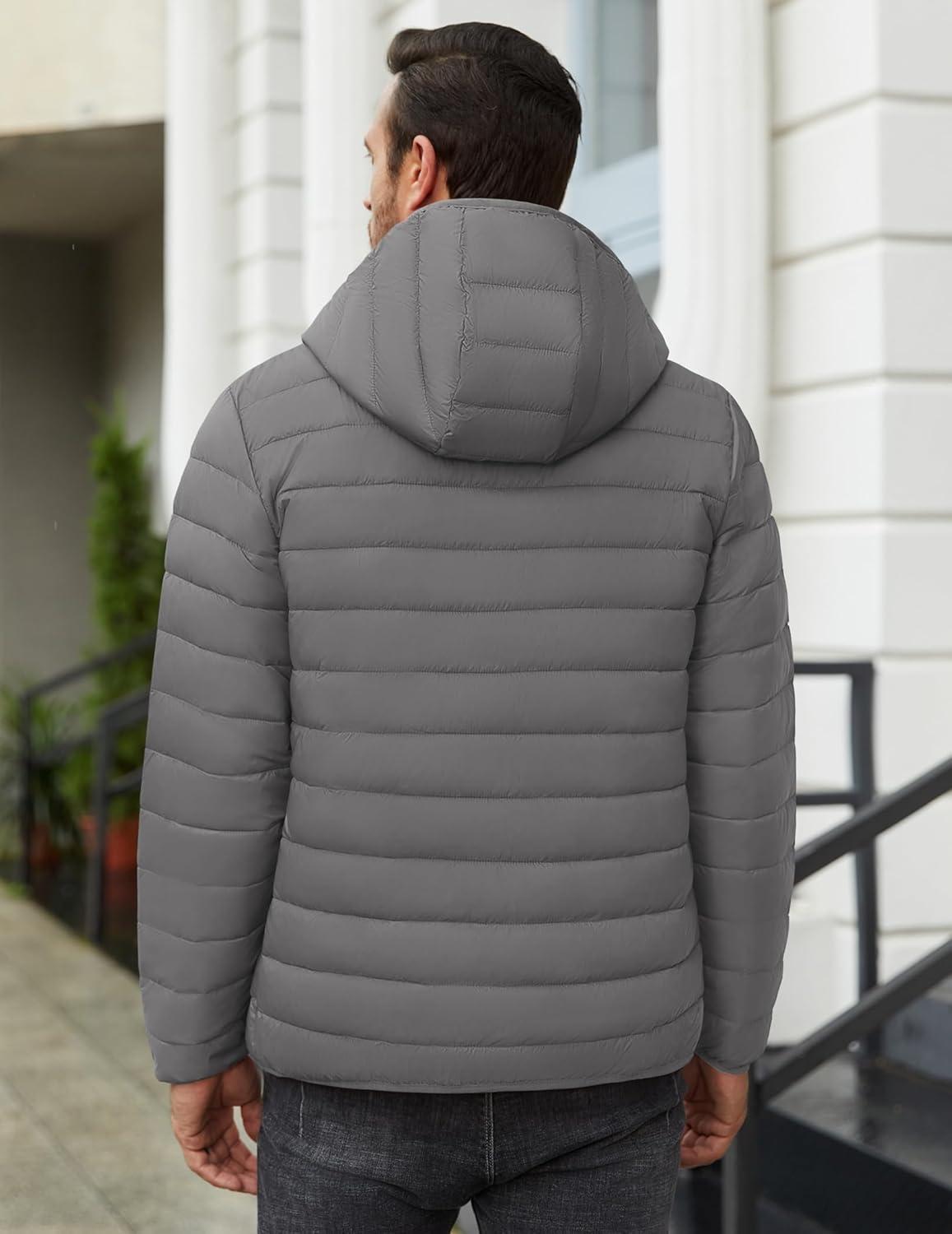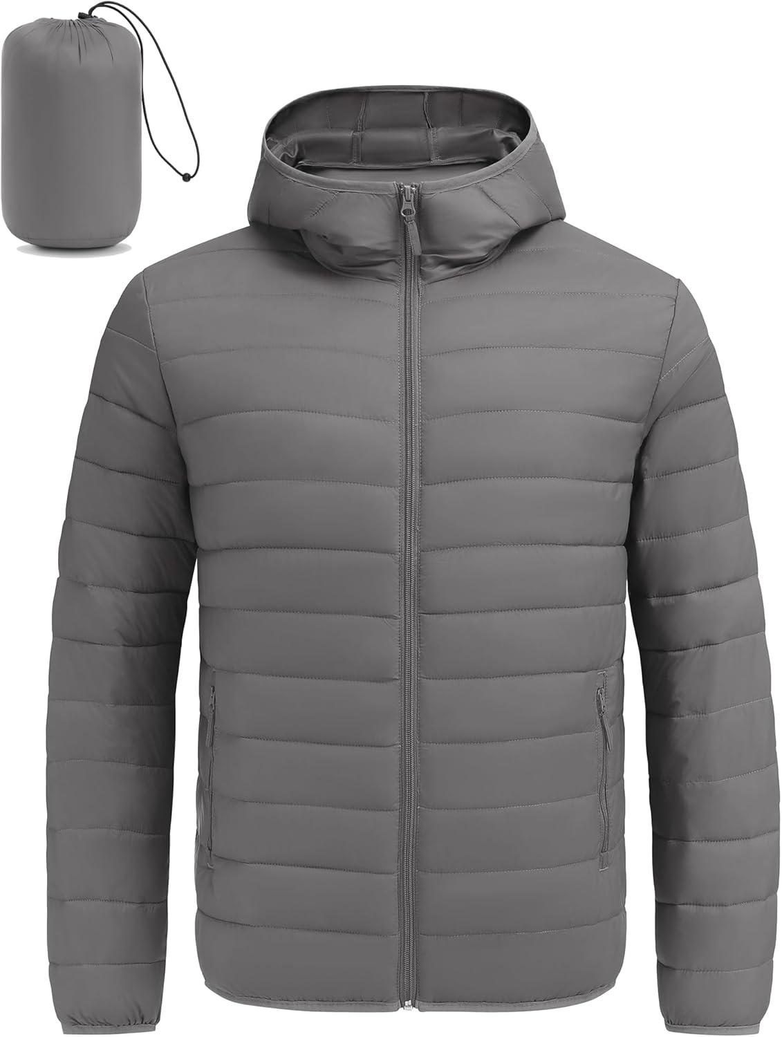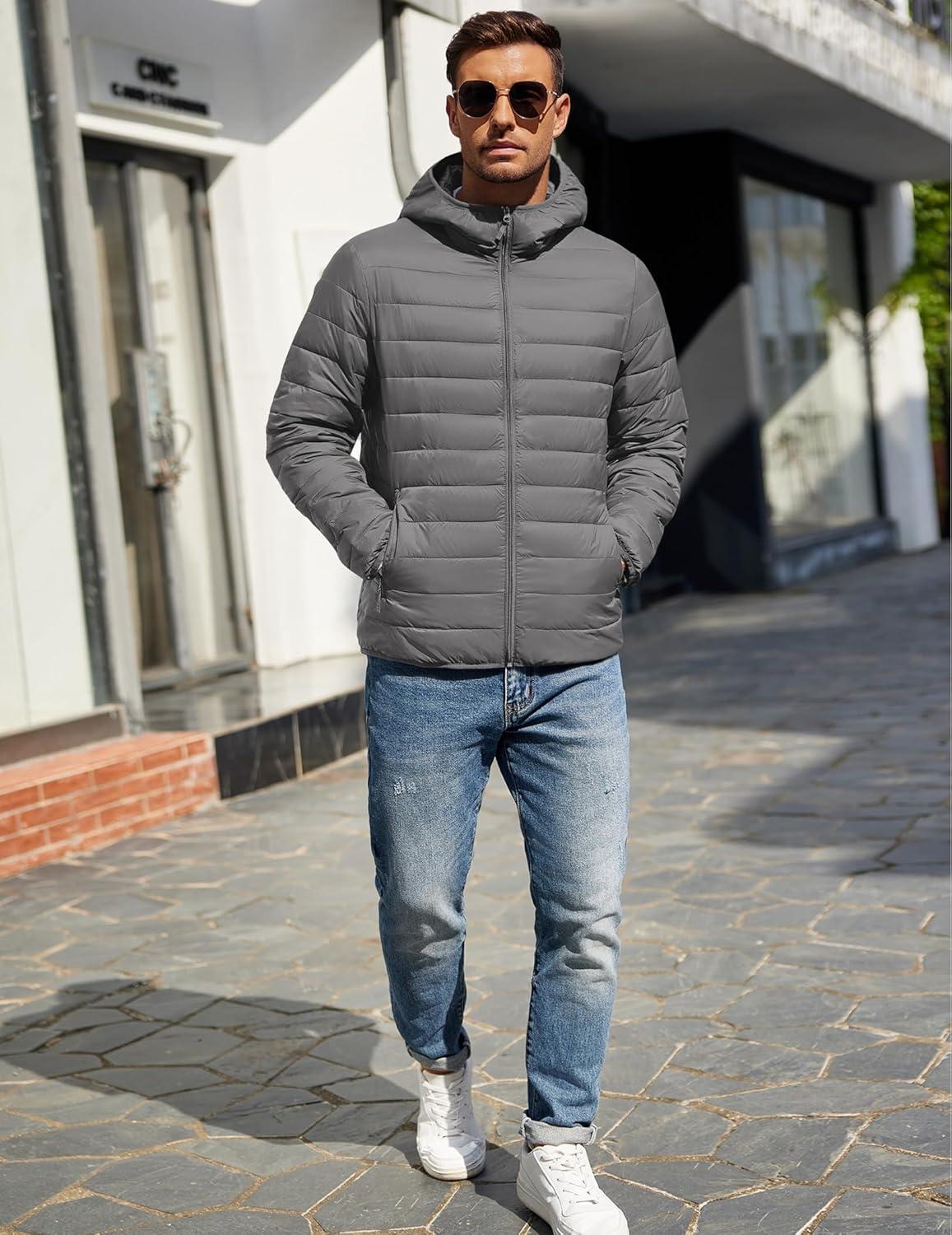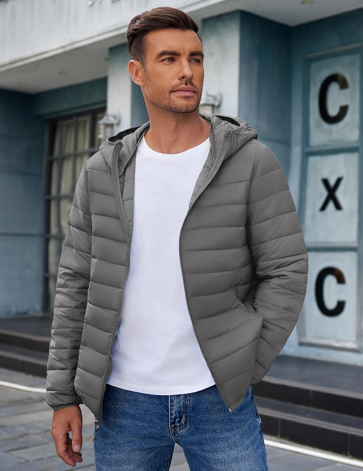 COOFANDY Mens Packable Puffer Jacket Lightweight Hooded Insulated Winter Coat Windproof Zipper Down Jacket(Gray)