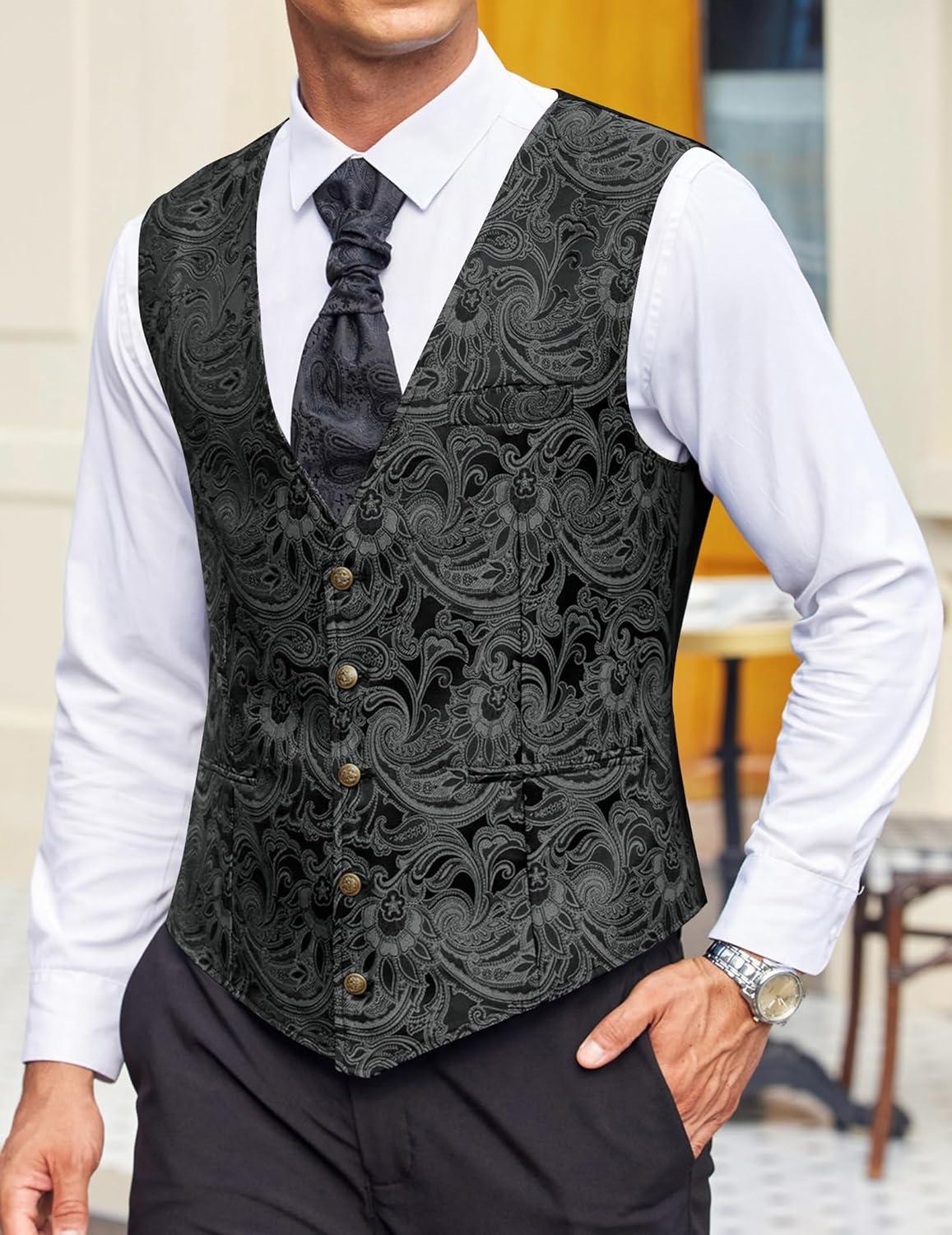 COOFANDY Mens Paisley Tuxedo Vest Victorian Steampunk Gothic Suit Vest Slim Fit V-Neck Waistcoat(Black Filigree)