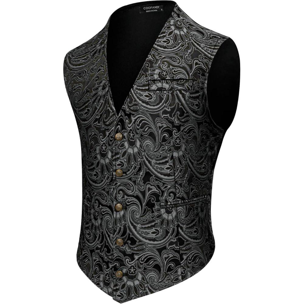 COOFANDY Mens Paisley Tuxedo Vest Victorian Steampunk Gothic Suit Vest Slim Fit V-Neck Waistcoat(Silver)