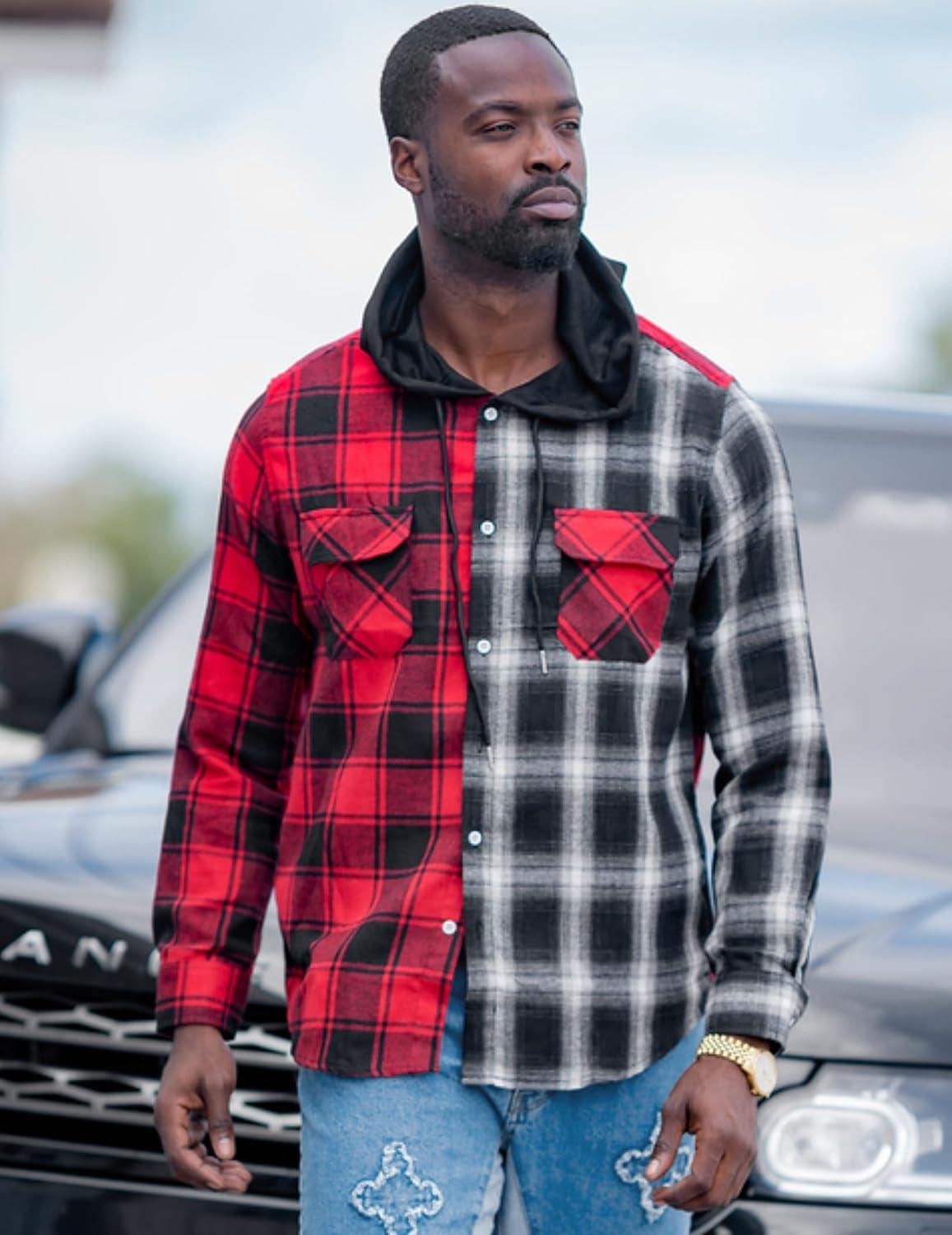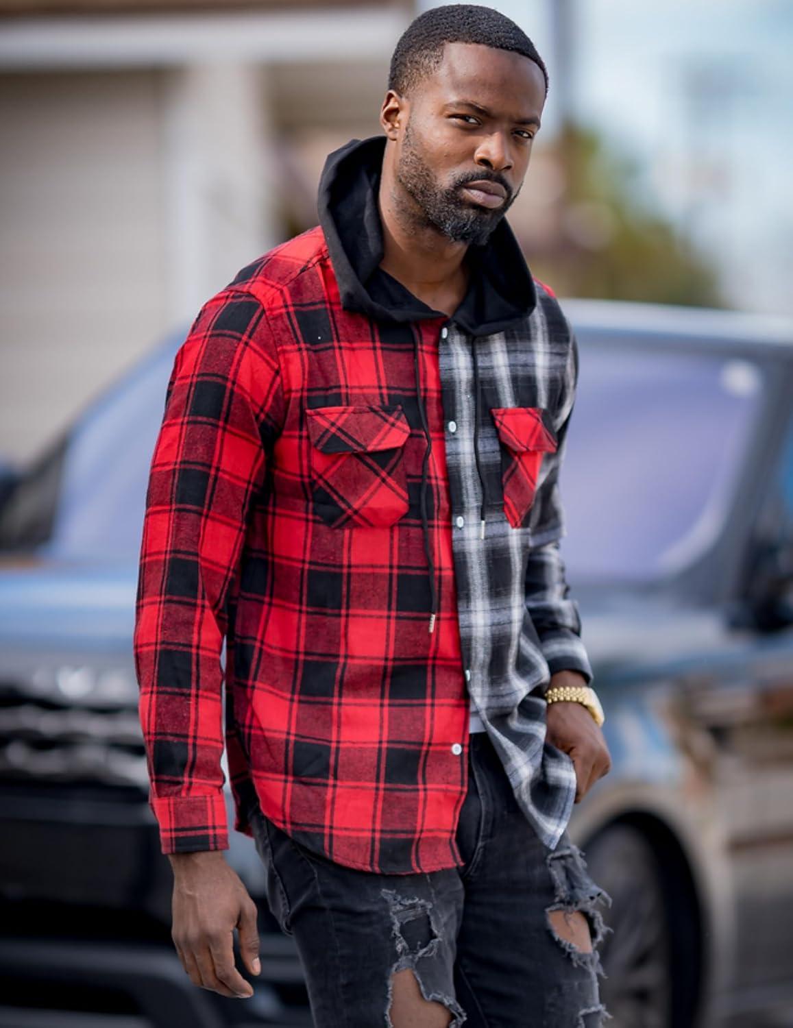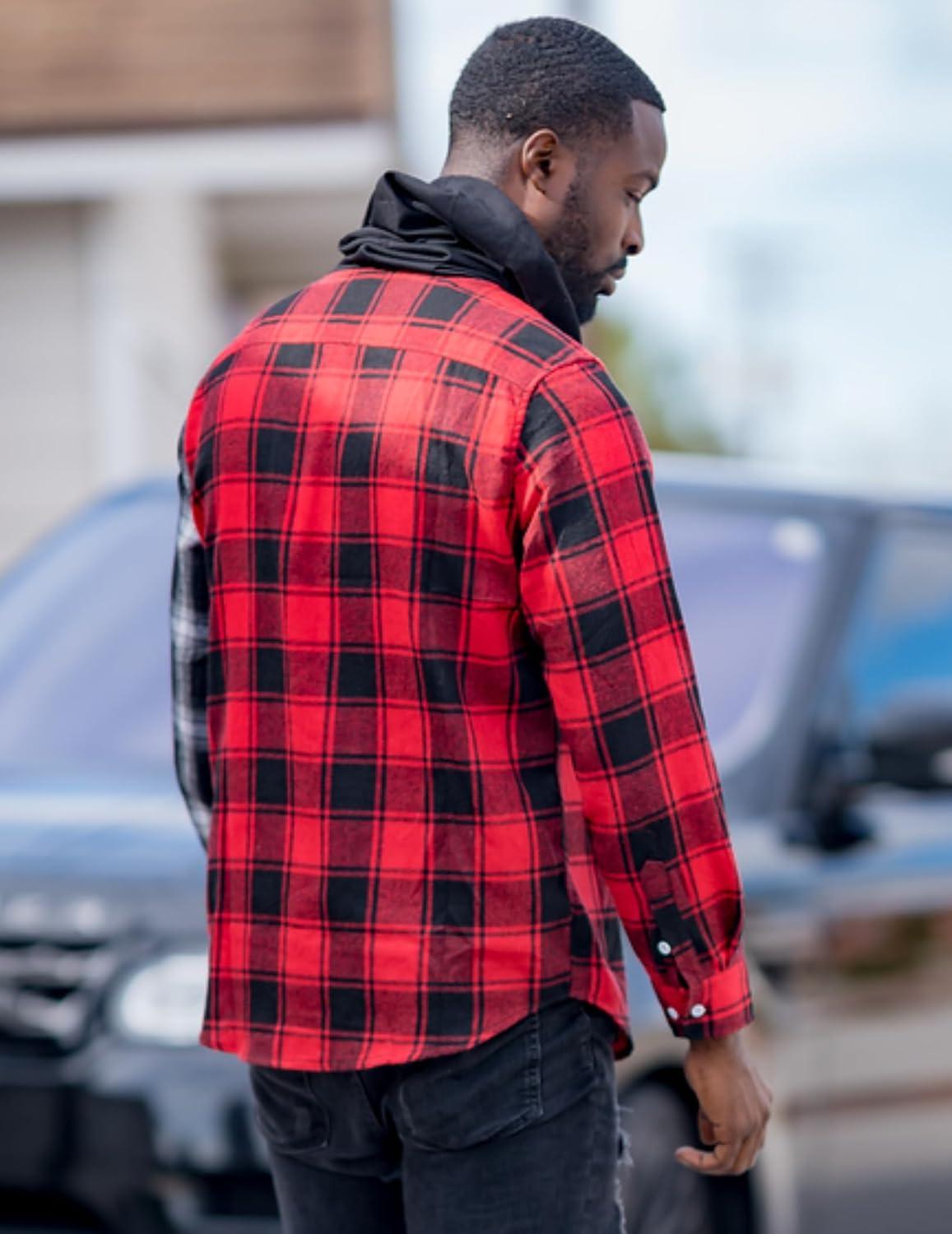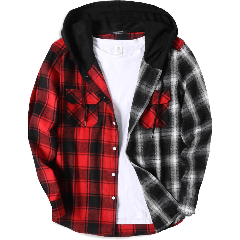COOFANDY Men's Plaid Hoodie Flannel Shirt Jacket Long Sleeve Casual Fashion Button Shirts(Black 1 & Red)