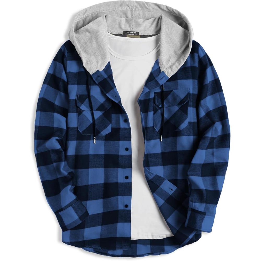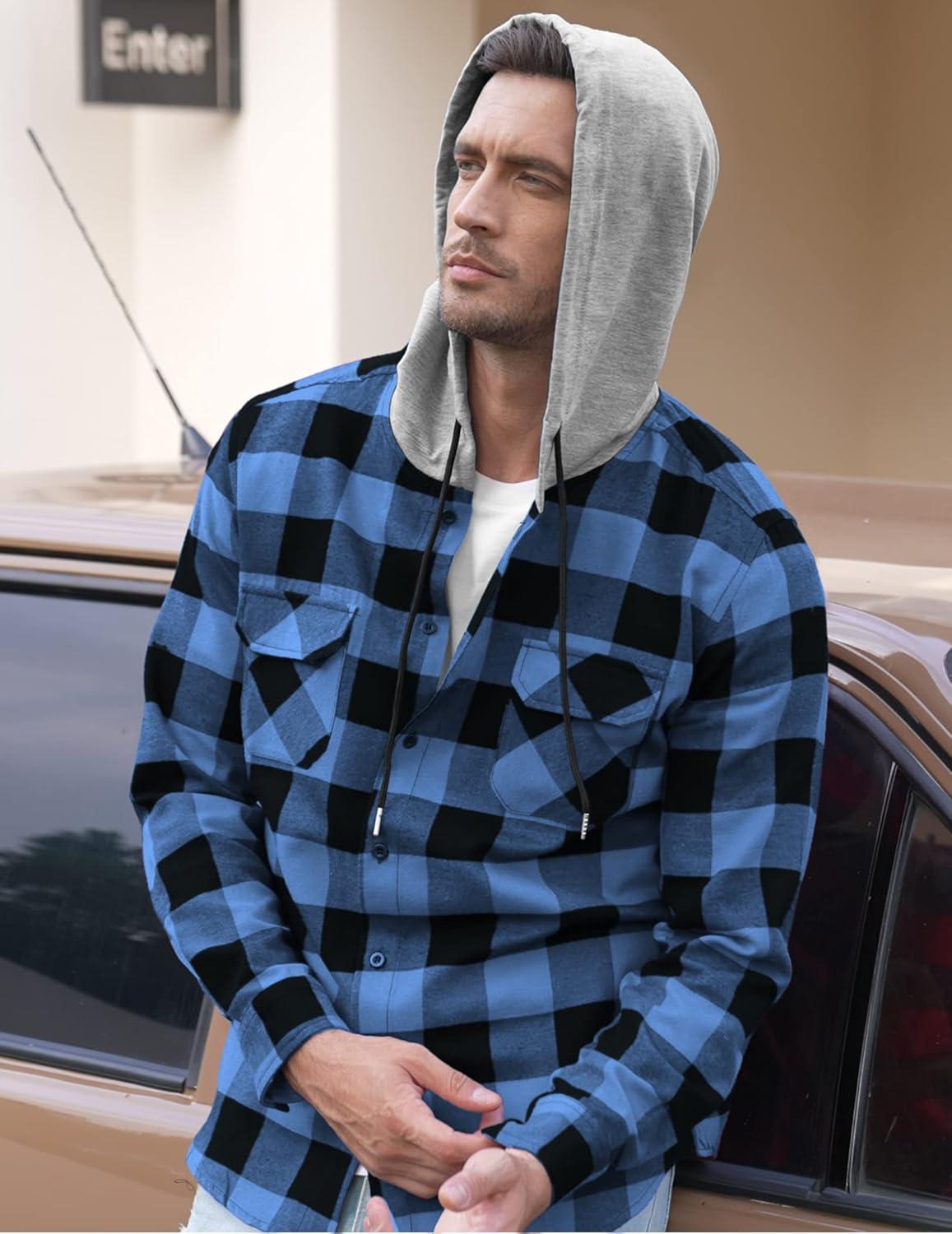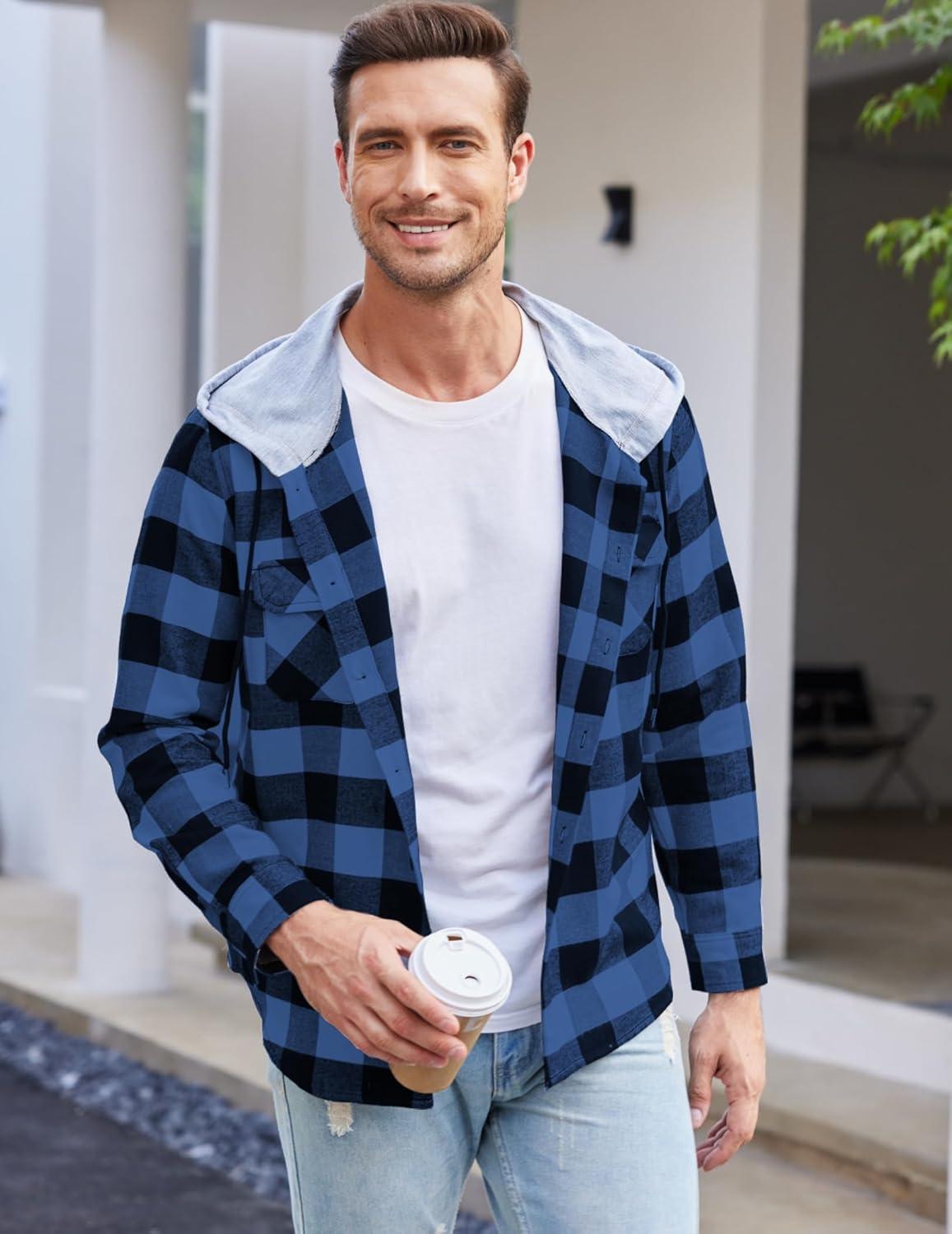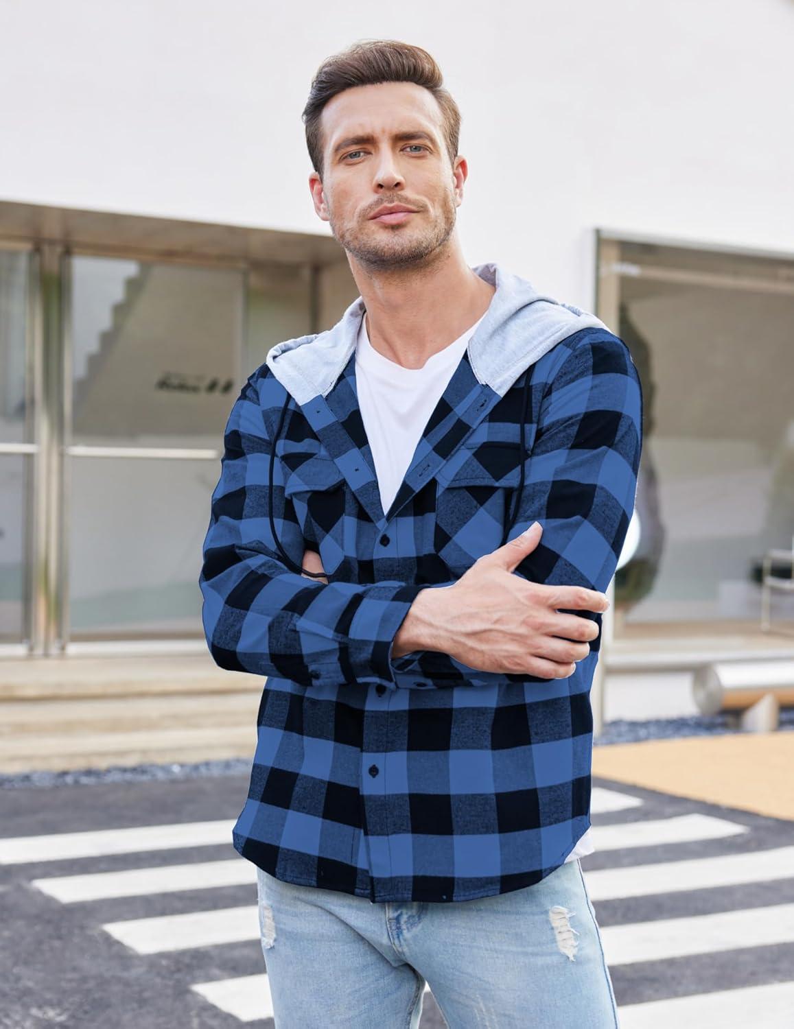 COOFANDY Men’s Plaid Hoodie Flannel Shirt Jacket Long Sleeve Casual Fashion Button Shirts(Blue)