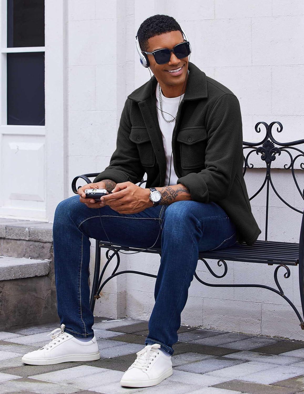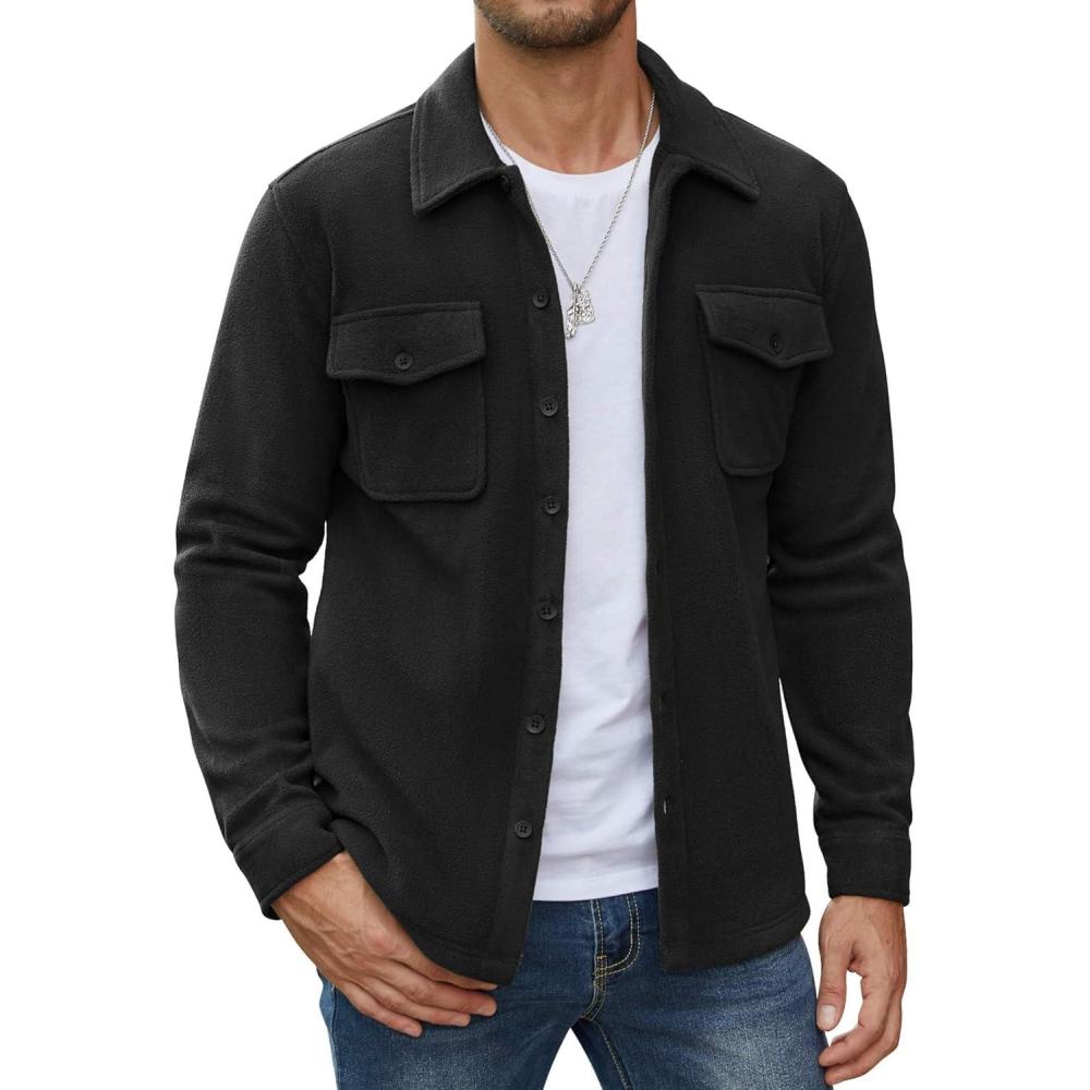 COOFANDY Men's Polar Fleece Shirt Jacket Long Sleeve Casual Button Down Shirts Shacket with Pockets(Black)