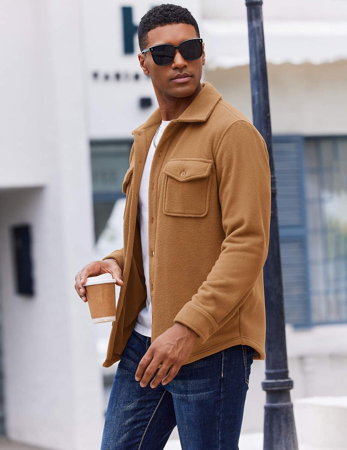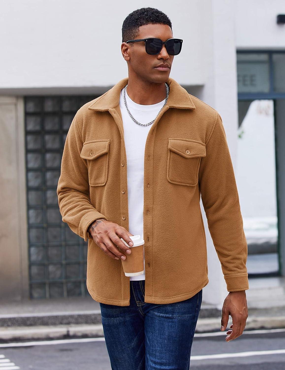 COOFANDY Men’s Polar Fleece Shirt Jacket Long Sleeve Casual Button Down Shirts Shacket with Pockets(Light Brown)