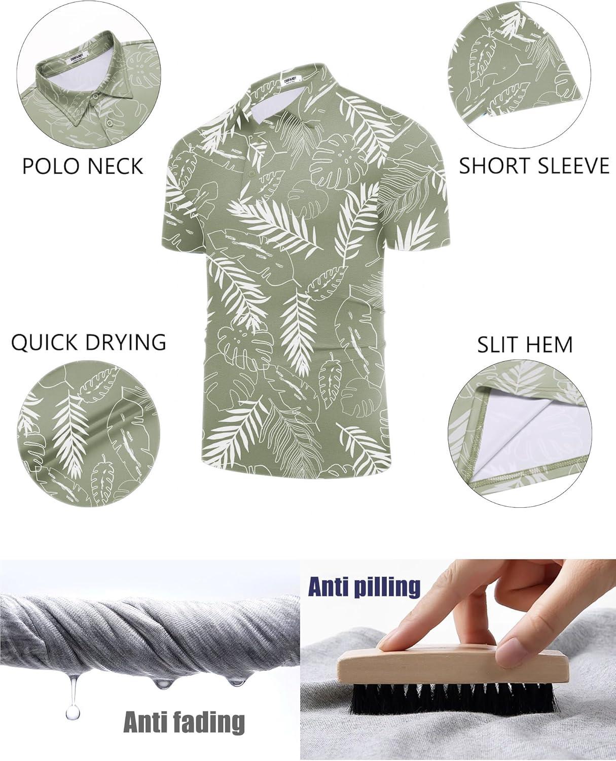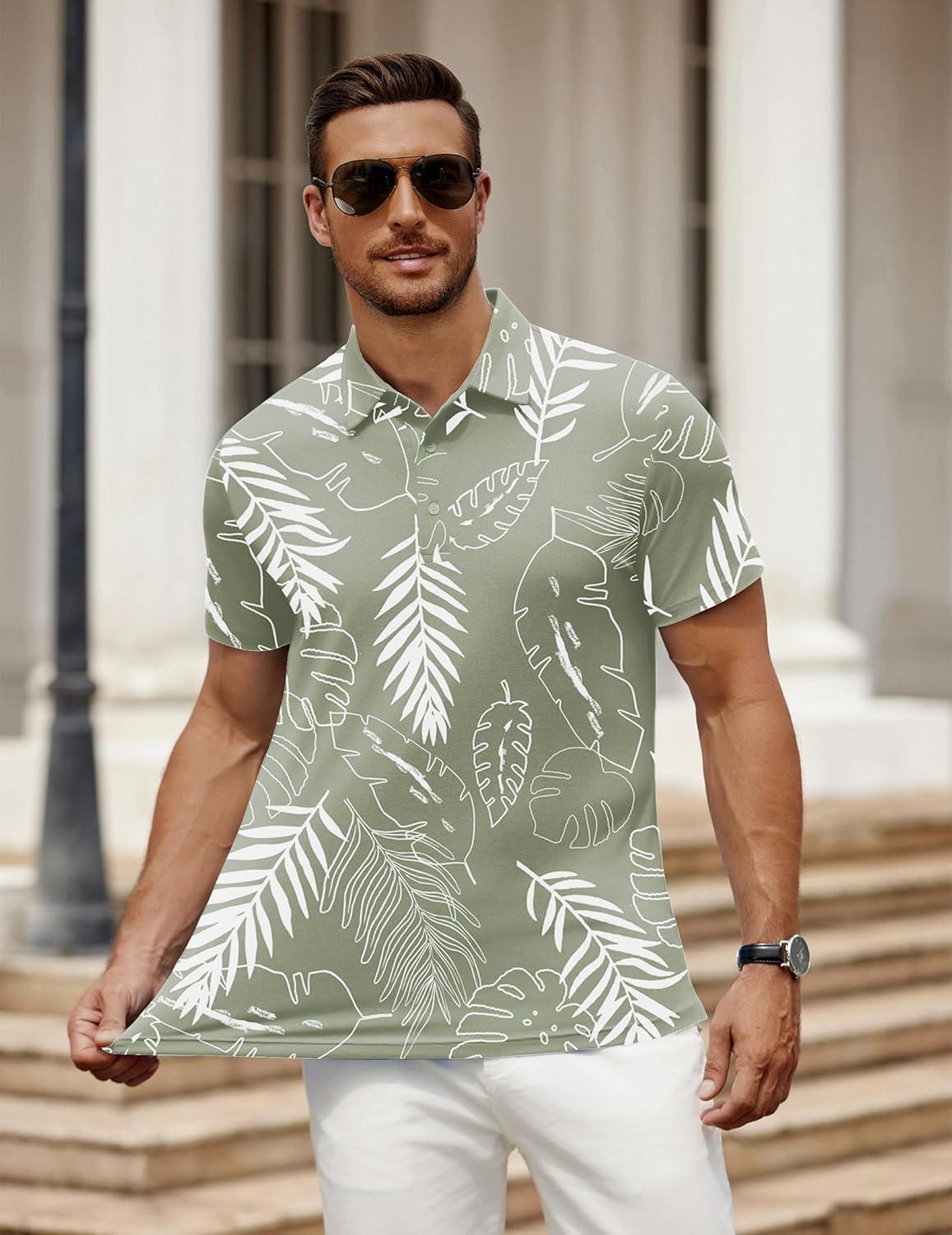 COOFANDY Men’s Polo Shirt Golf Quick Dry Performance Short Sleeve Moisture Wicking Athletic Polo Collared Tennis T-Shirt(Green Palm Leaves)