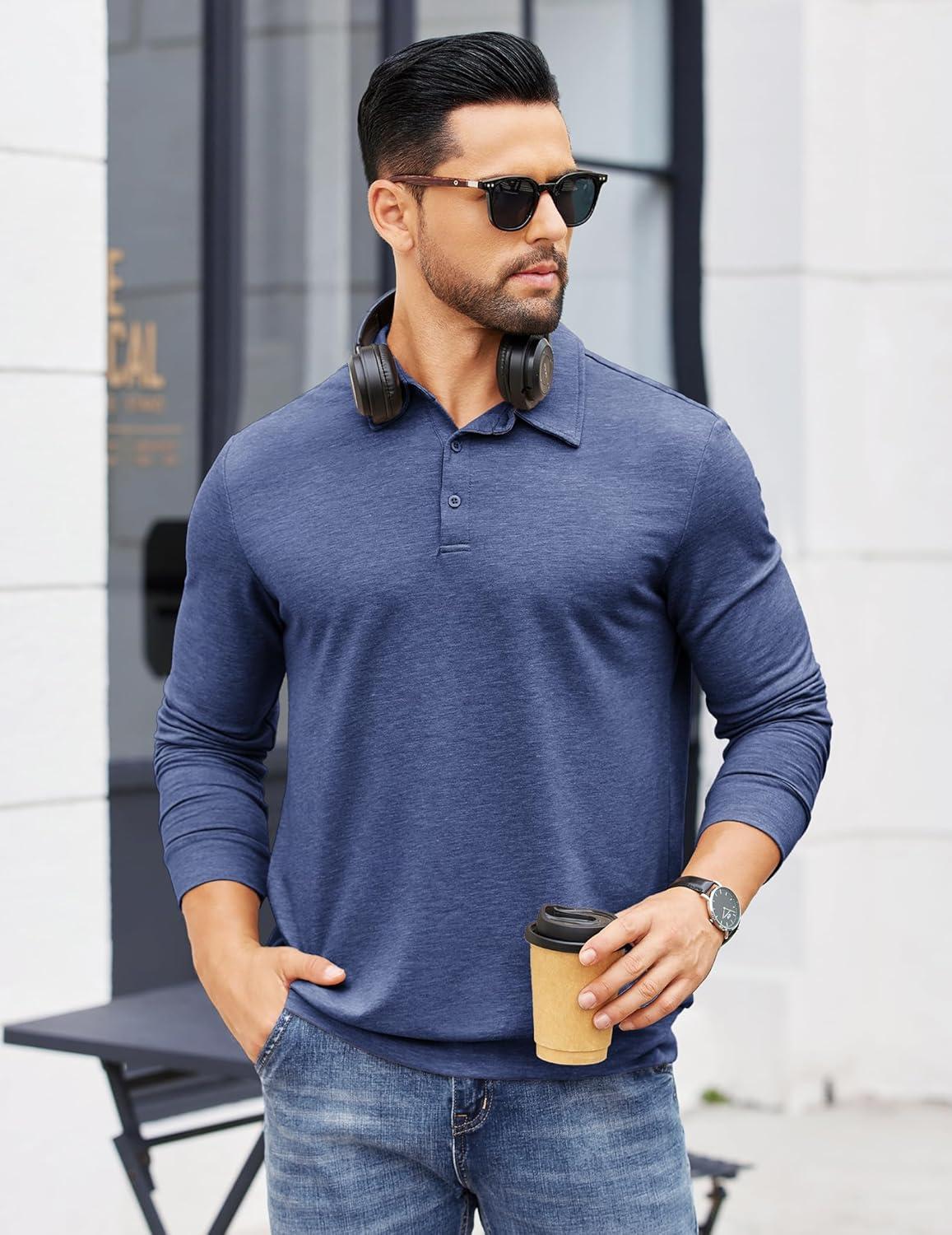COOFANDY Mens Polo Shirts Long Sleeve Casual Lightweigt Golf Polos Button Collared Tshirt(Navy Blue)