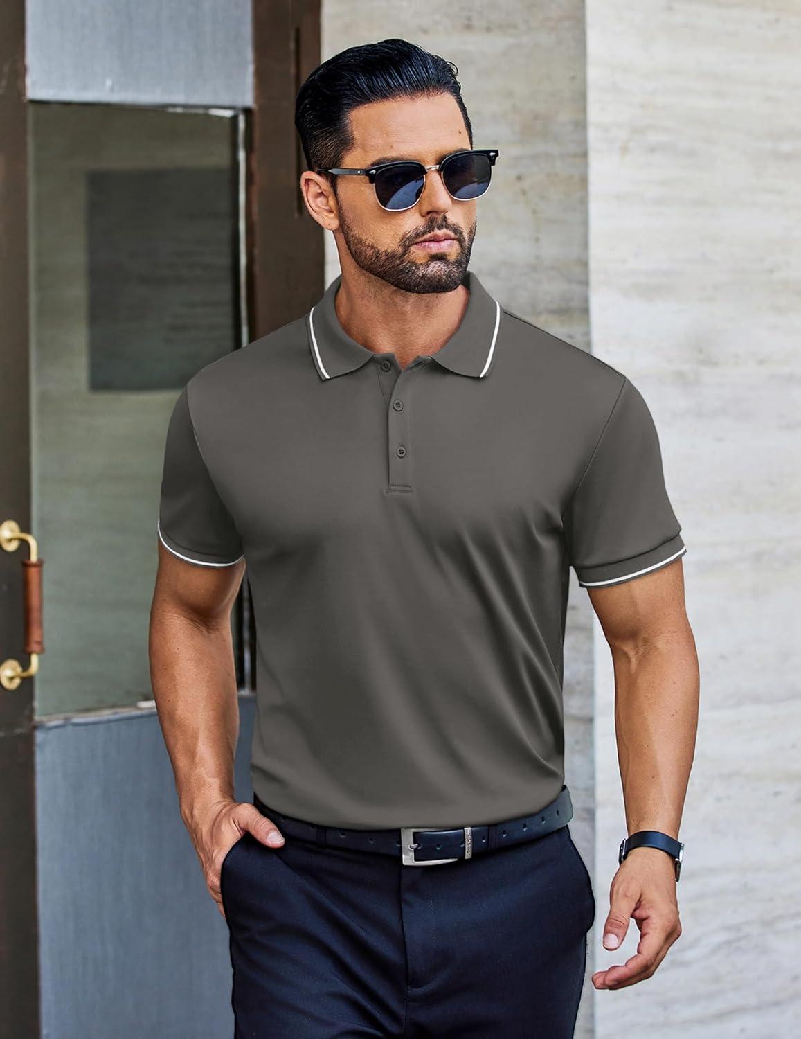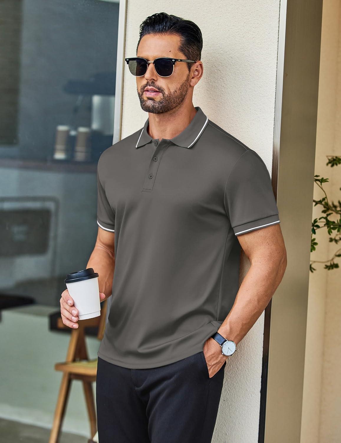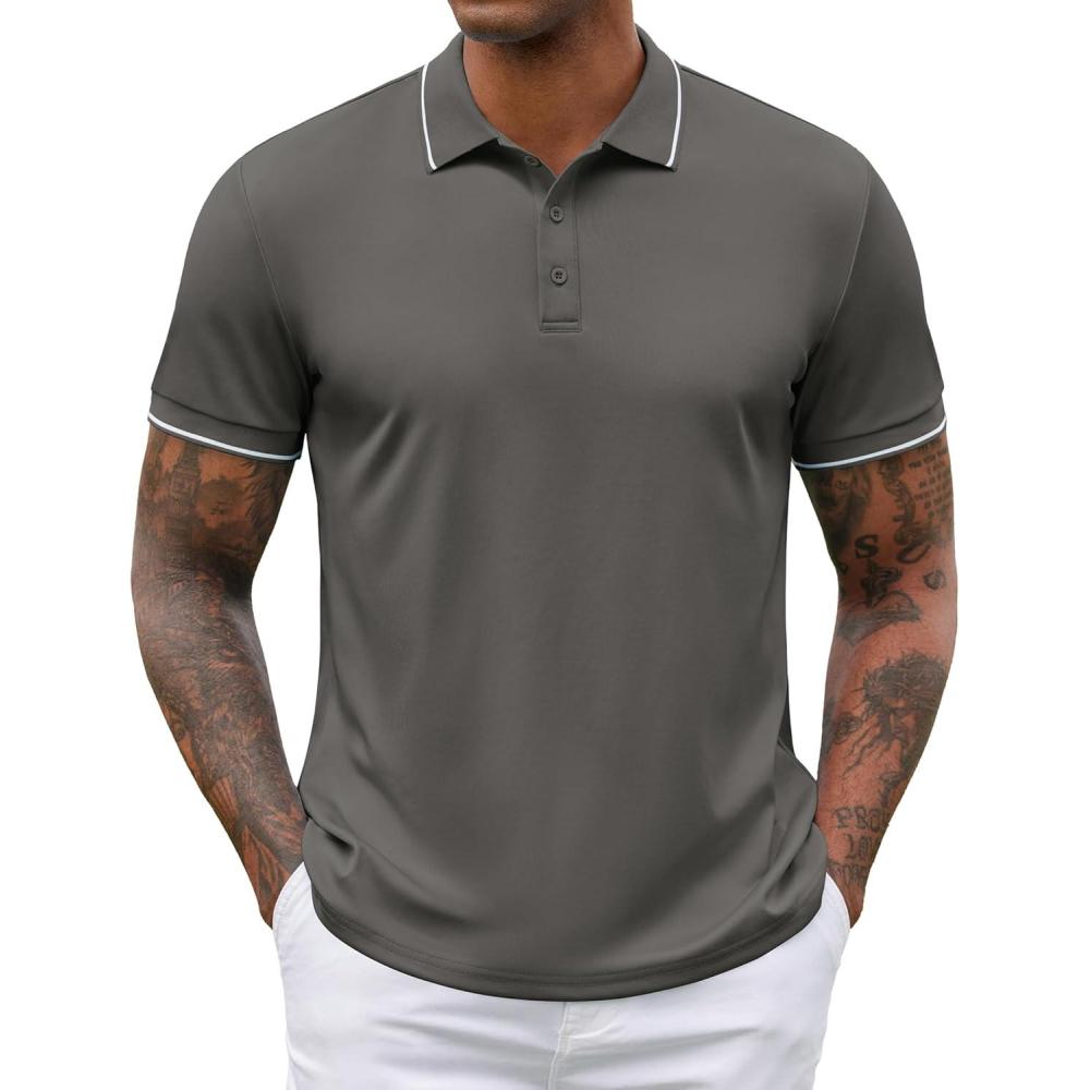 COOFANDY Mens Polo Shirts Short Sleeve Golf Polo Button Pullover Casual Contrast Color Basic T Shirt Ribbed Collar(Deep Gray)