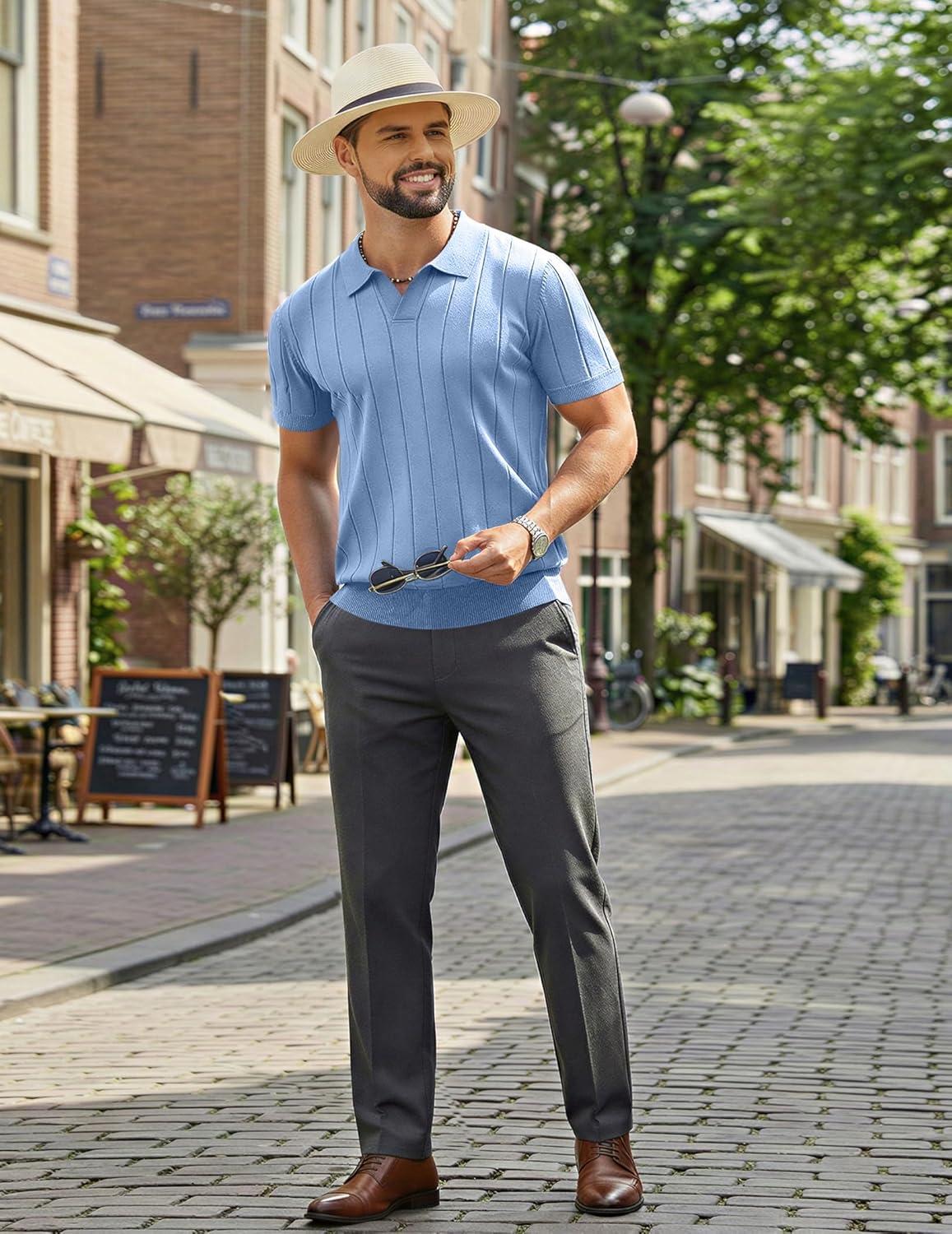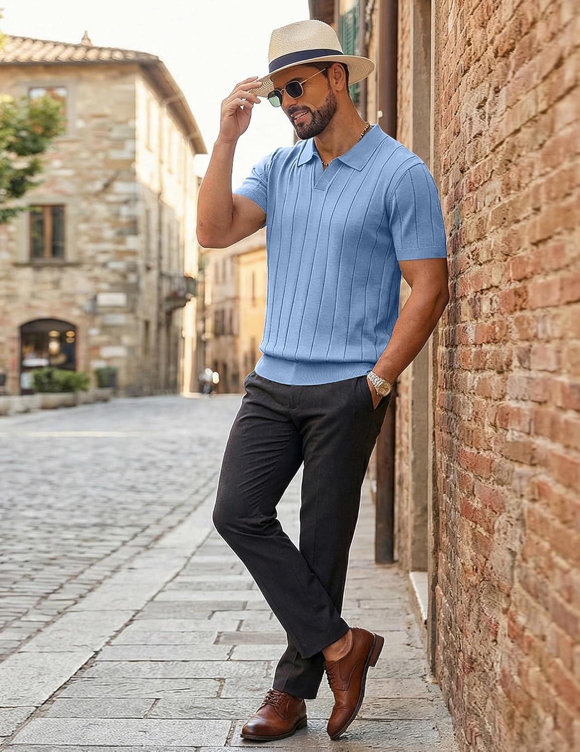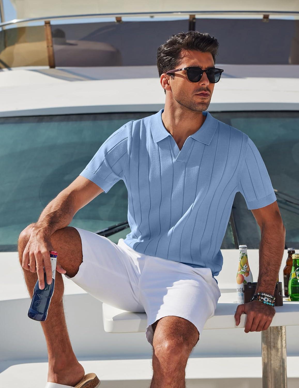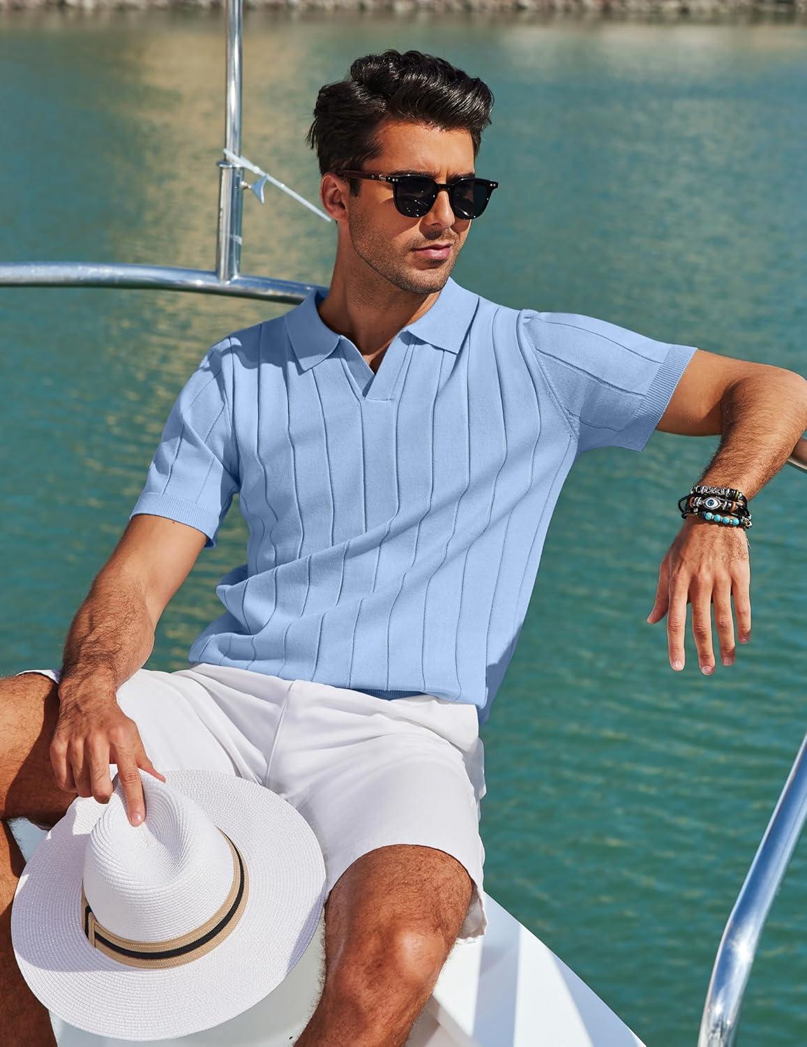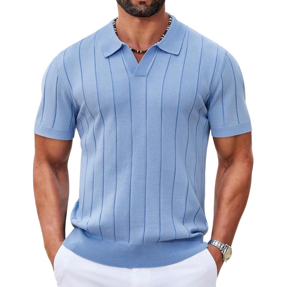 COOFANDY Mens Polo Shirts Short Sleeve V Neck Knit Shirts for Men Casual Old Money Clothes Mens Golf Shirt(Ligjht Blue)