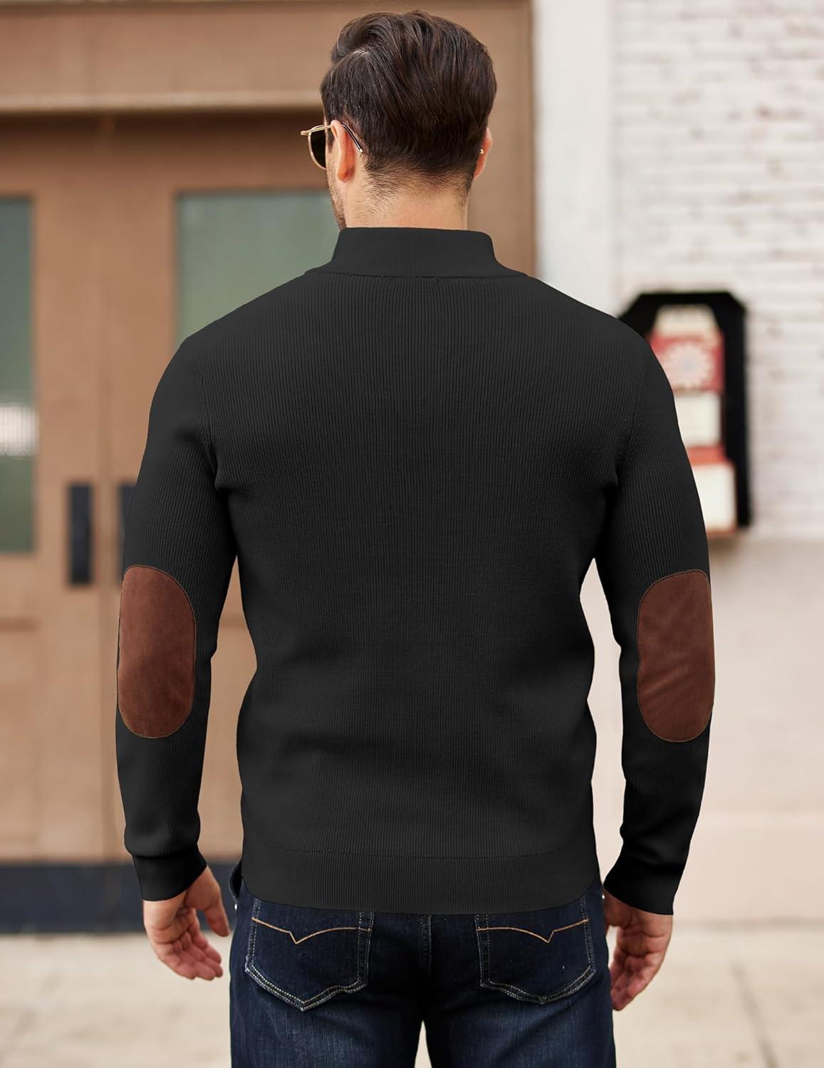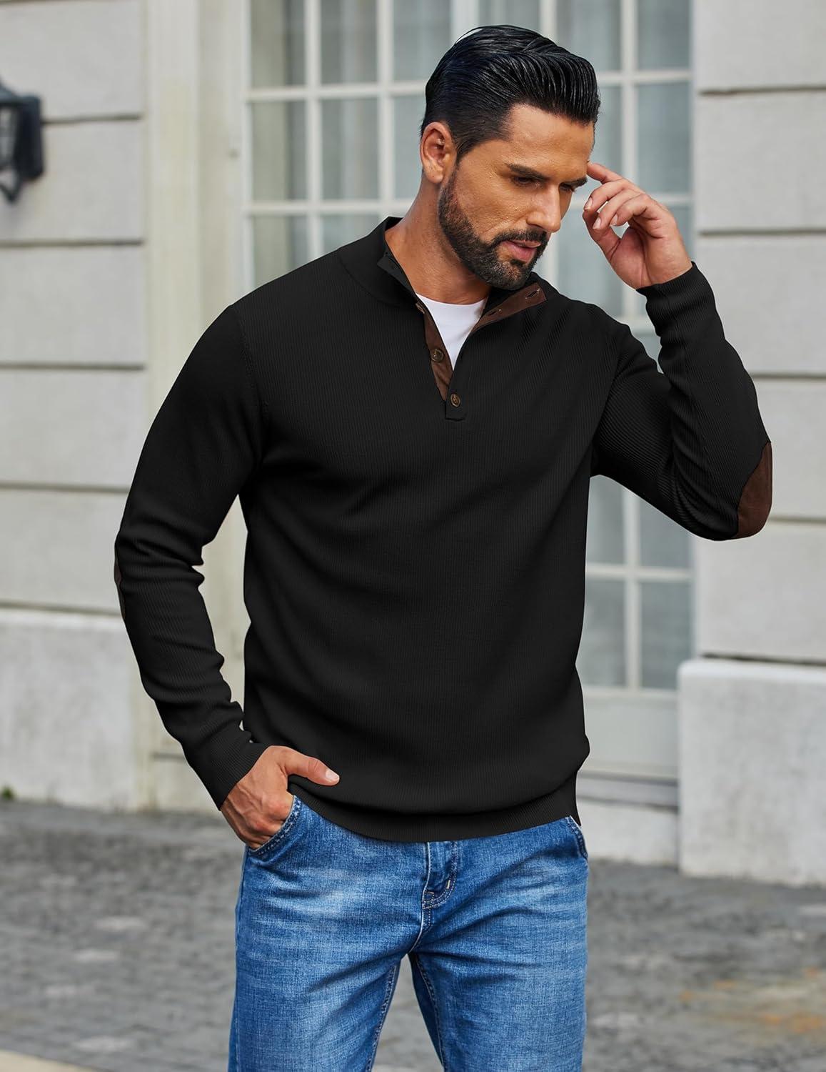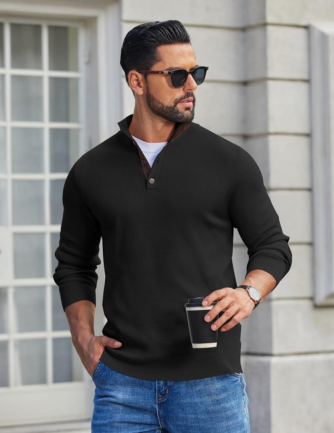 COOFANDY Mens Pullover Sweaters Long Sleeve Knit Quarter Button Sweater Mock Neck Casual Henley Sweater(Black)