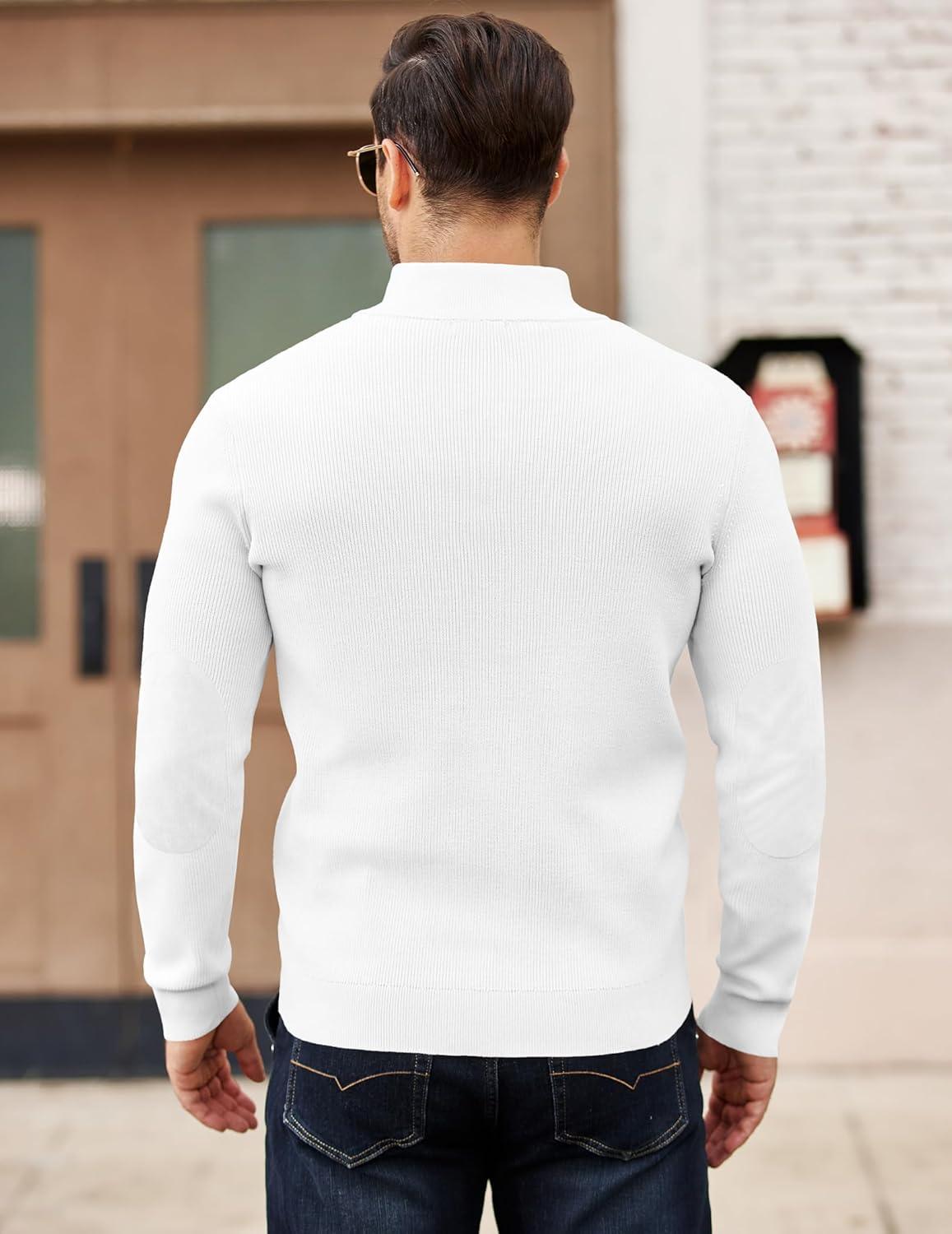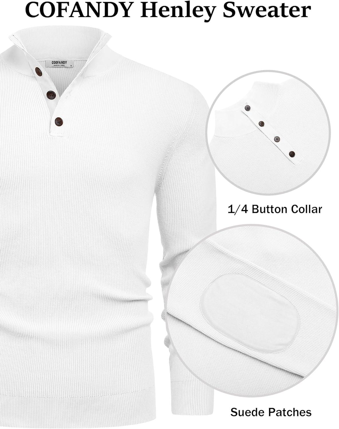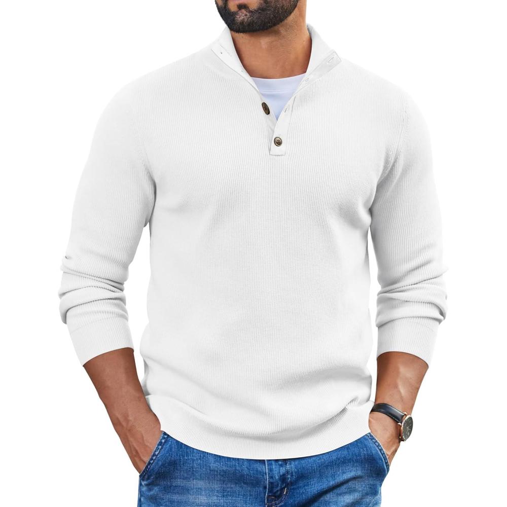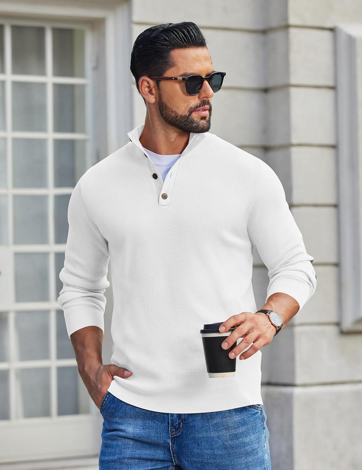 COOFANDY Mens Pullover Sweaters Long Sleeve Knit Quarter Button Sweater Mock Neck Casual Henley Sweater(White)