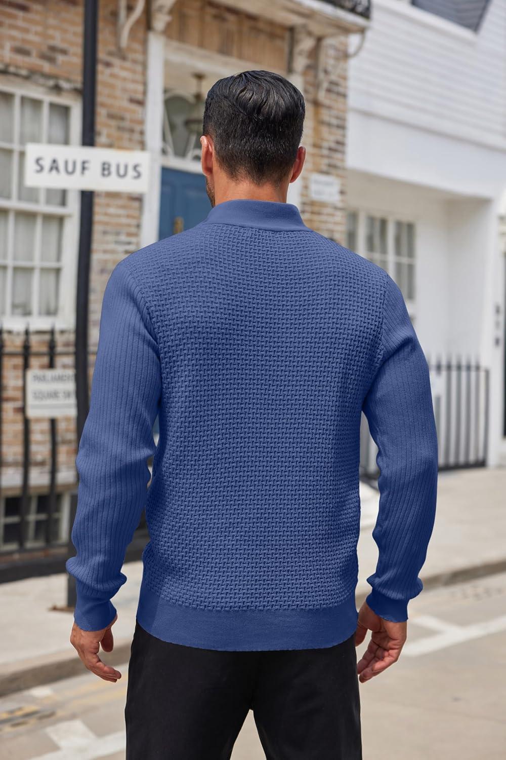 COOFANDY Men’s Quarter Button Sweater Lightweight Mock Neck Pullover Sweater Fashion Casual Knitted Waffle Henley Sweater(Blue)