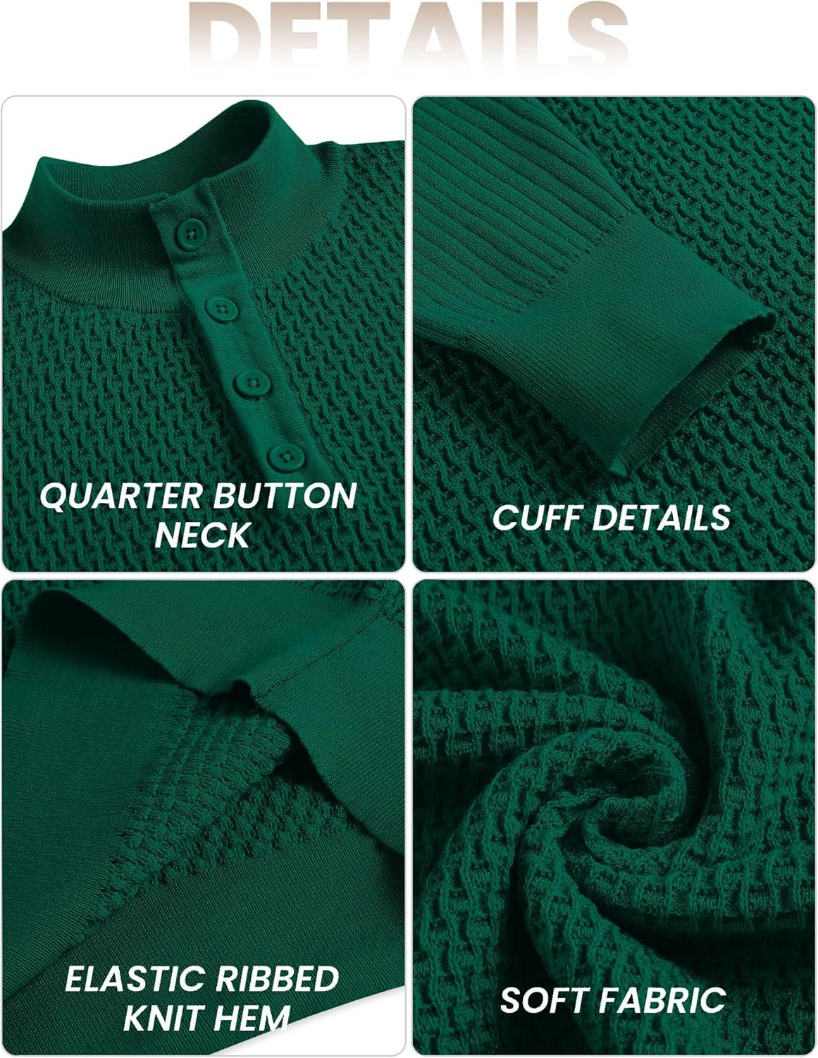 COOFANDY Men's Quarter Button Sweater Lightweight Mock Neck Pullover Sweater Fashion Casual Knitted Waffle Henley Sweater(Dark Green)