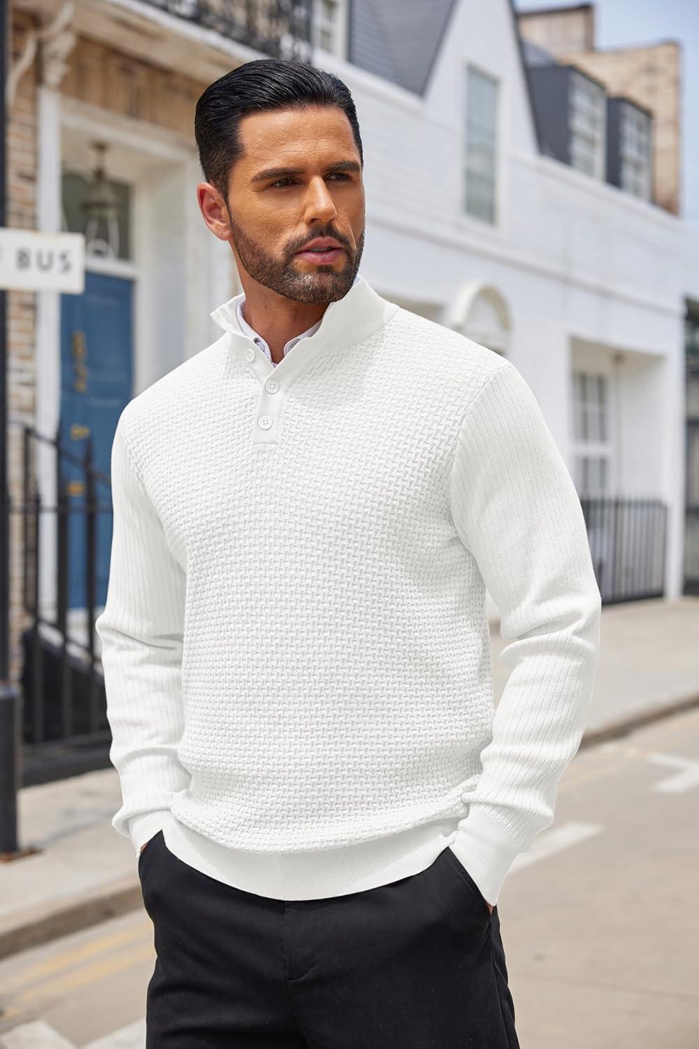 COOFANDY Men's Quarter Button Sweater Lightweight Mock Neck Pullover Sweater Fashion Casual Knitted Waffle Henley Sweater(White)