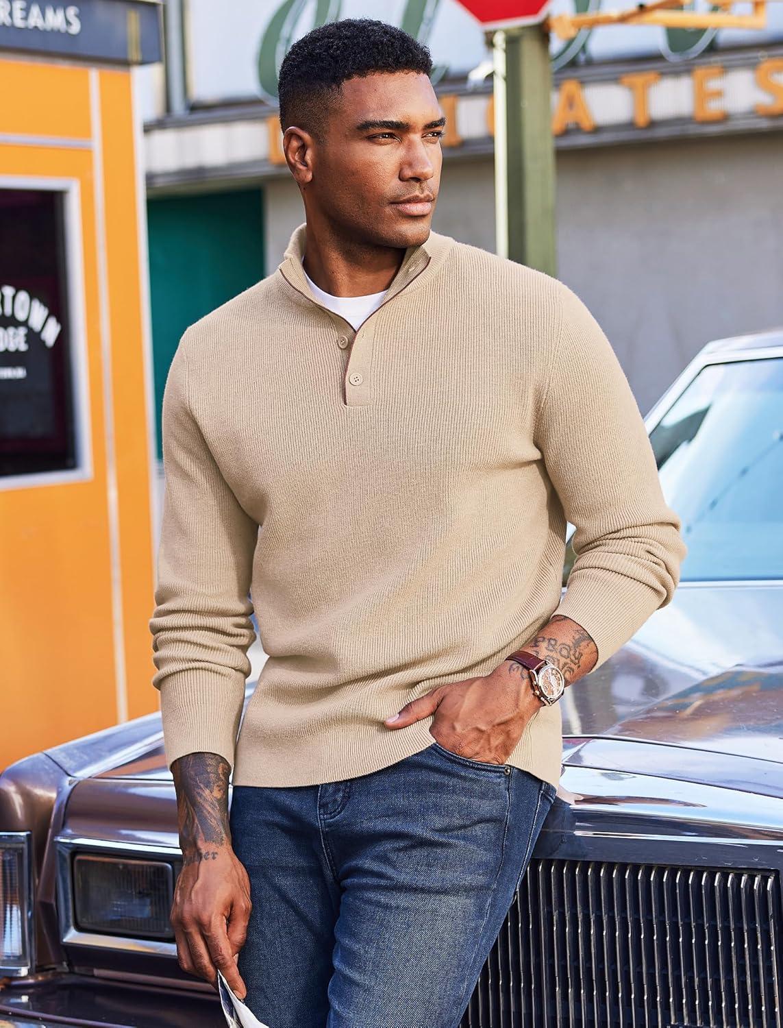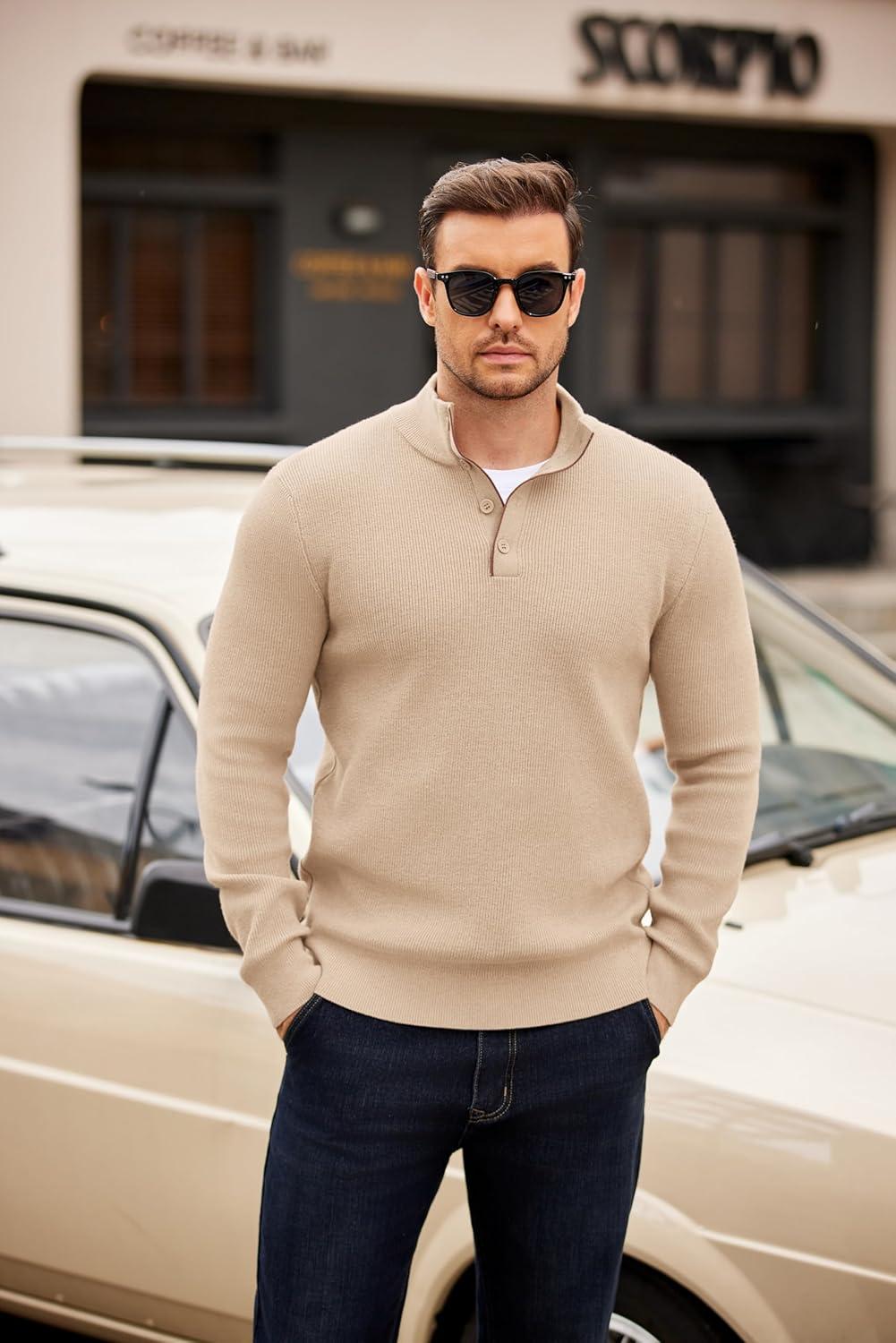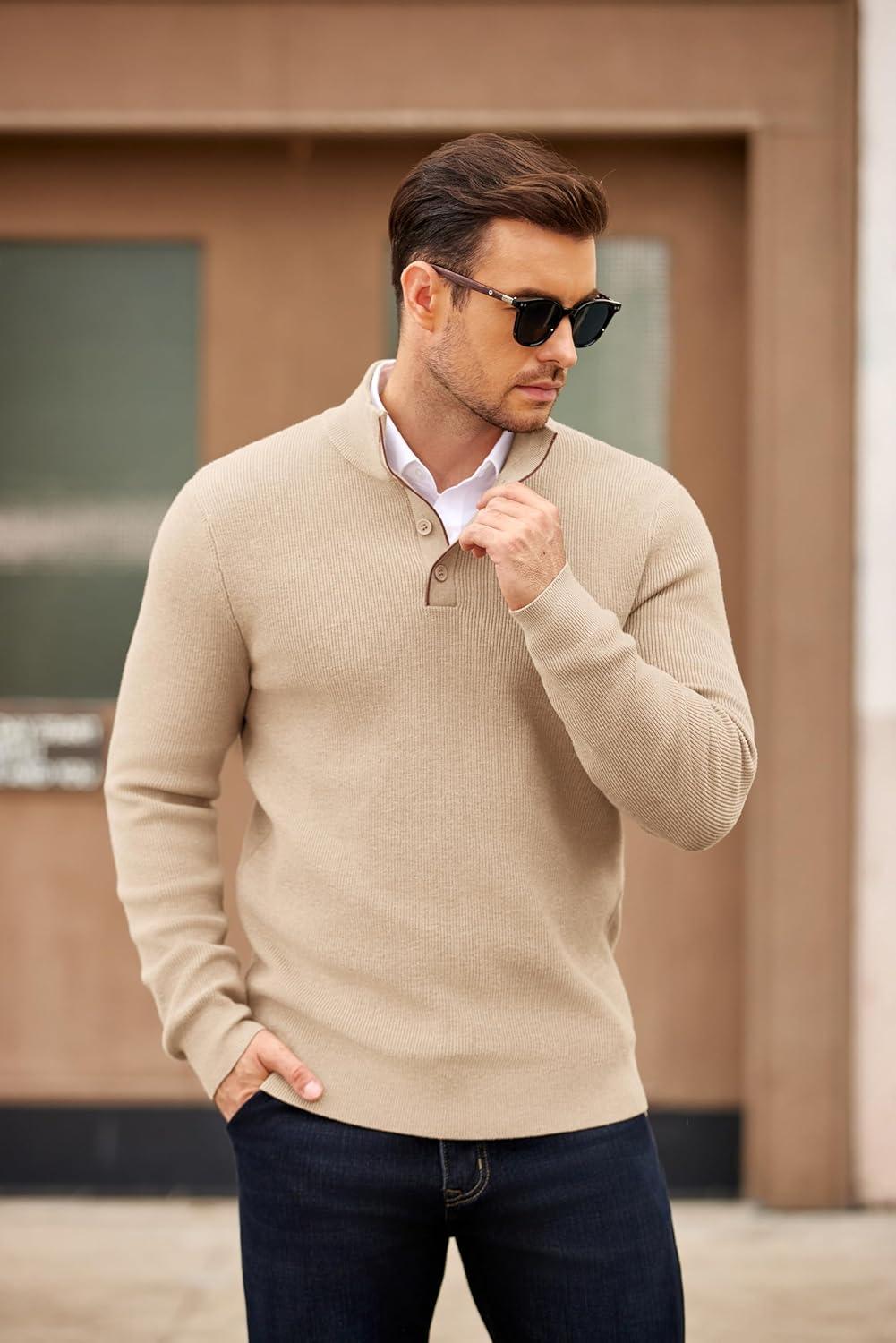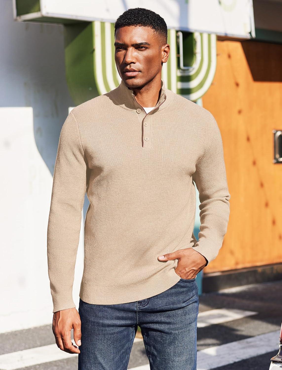 COOFANDY Men’s Quarter Button Sweater Mock Neck Textured Knitted Pullover(Beige)