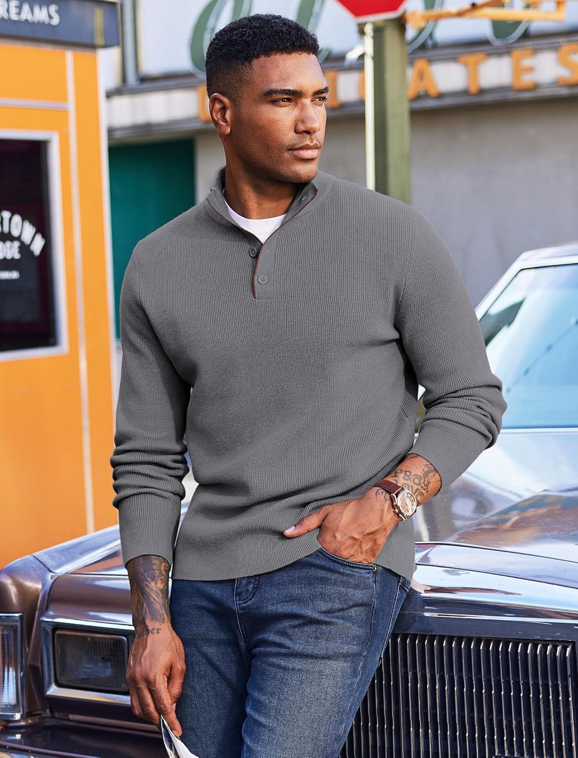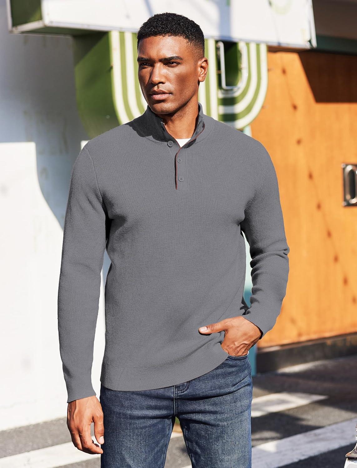 COOFANDY Men’s Quarter Button Sweater Mock Neck Textured Knitted Pullover(Medium Gray)