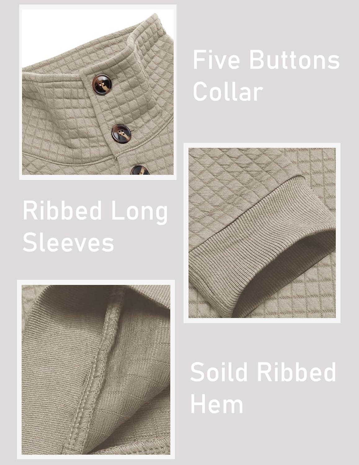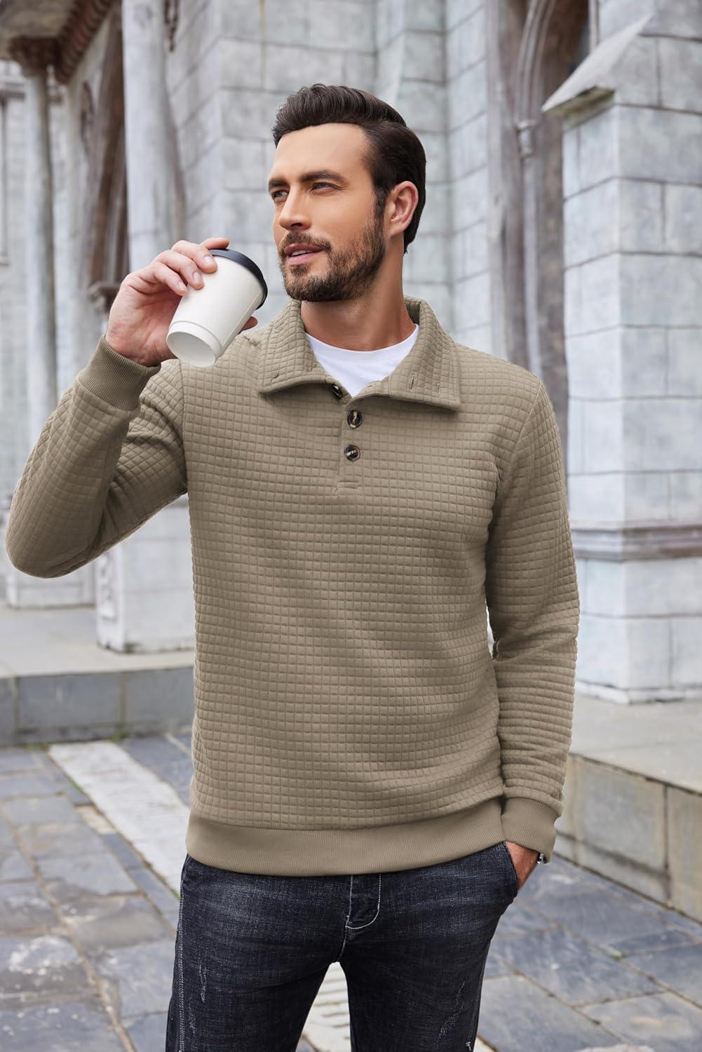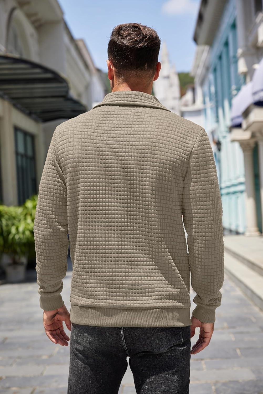 COOFANDY Mens Quarter Pullover Quilted Sweatshirt Casual Knit Long Sleeve Mock Neck Sweater Waffle Collared Pullover(Khaki)
