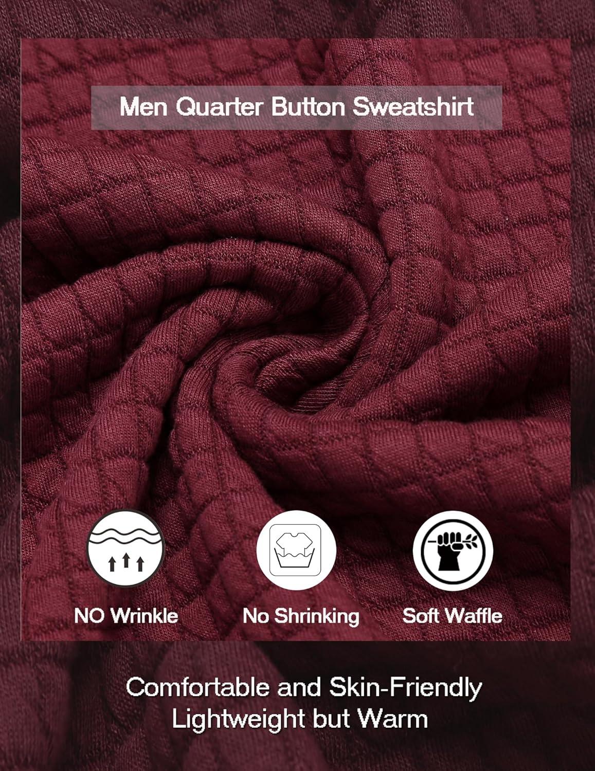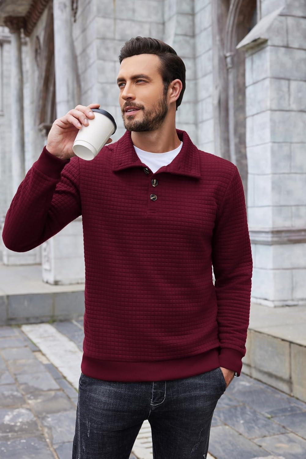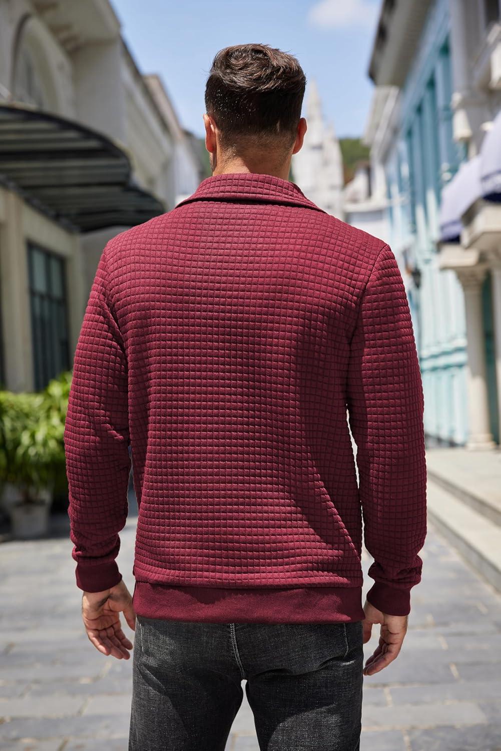 COOFANDY Mens Quarter Pullover Quilted Sweatshirt Casual Knit Long Sleeve Mock Neck Sweater Waffle Collared Pullover(Wine Red)