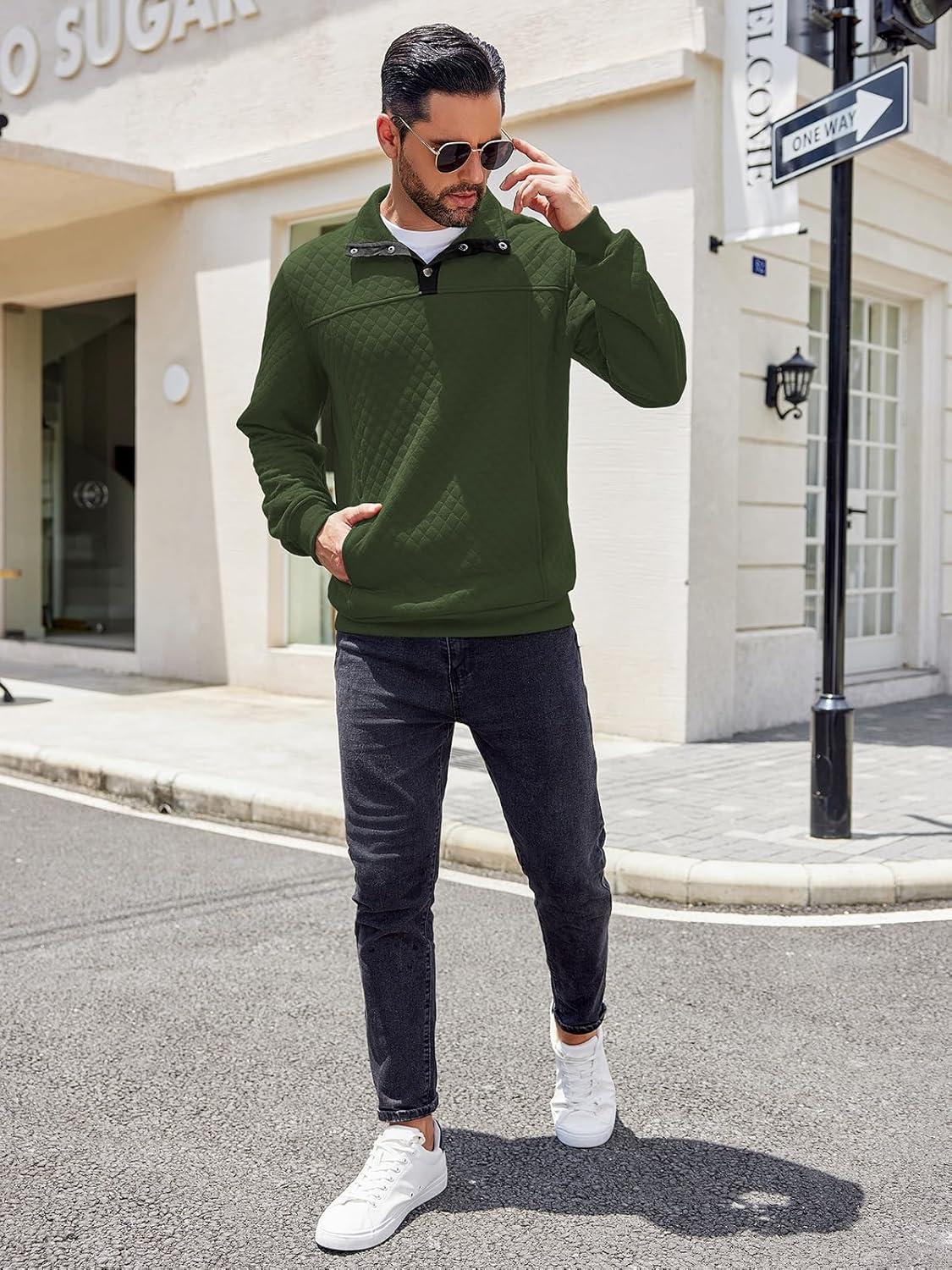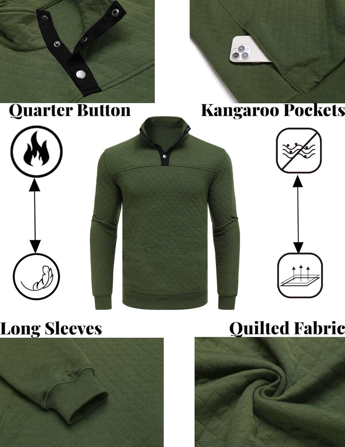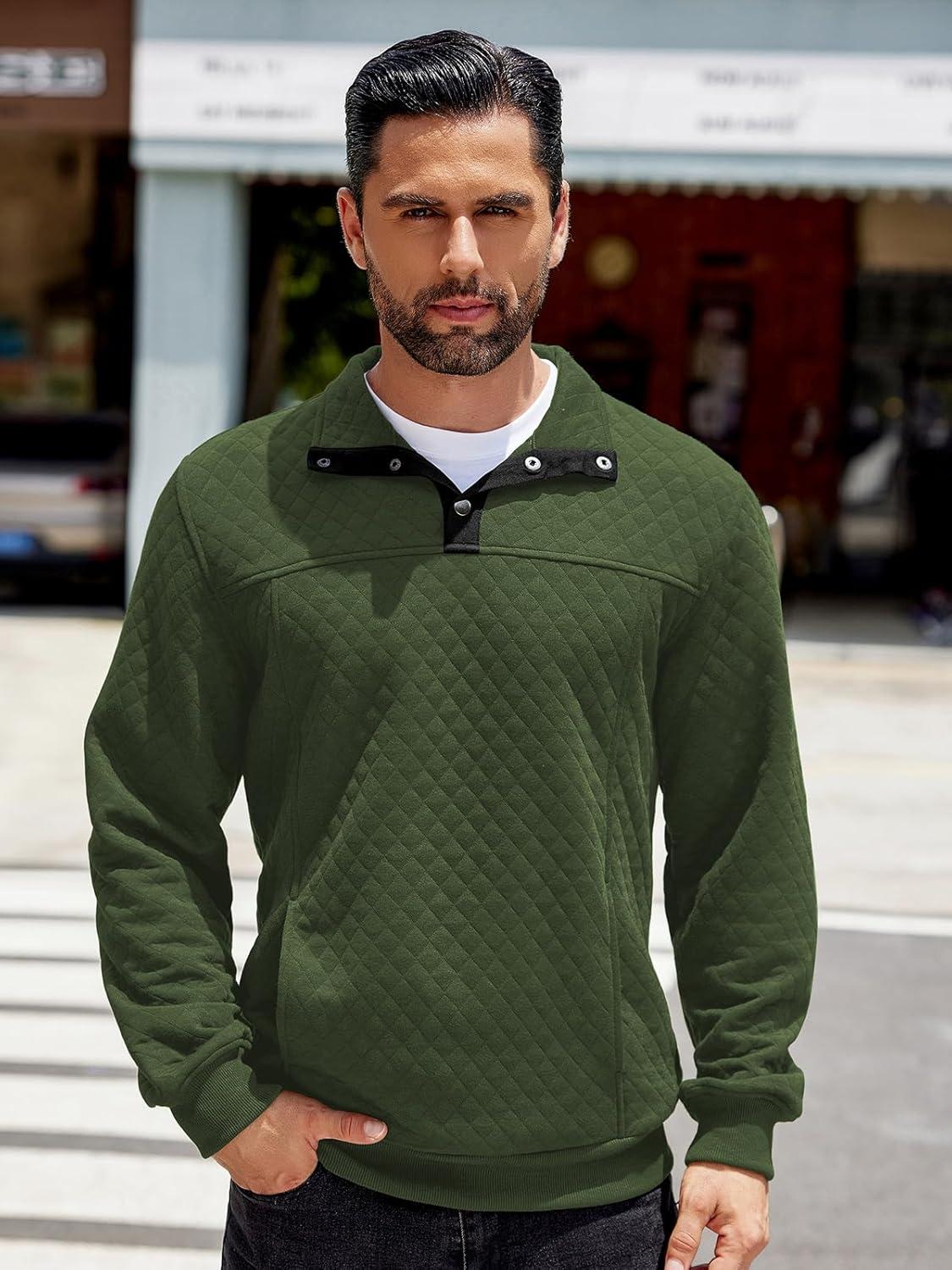 COOFANDY Mens Quarter Sweatshirt Quilted Long Sleeve Mock Neck Active Sweater Waffle Pullover Polo Shirts With Pockets(Army Green)