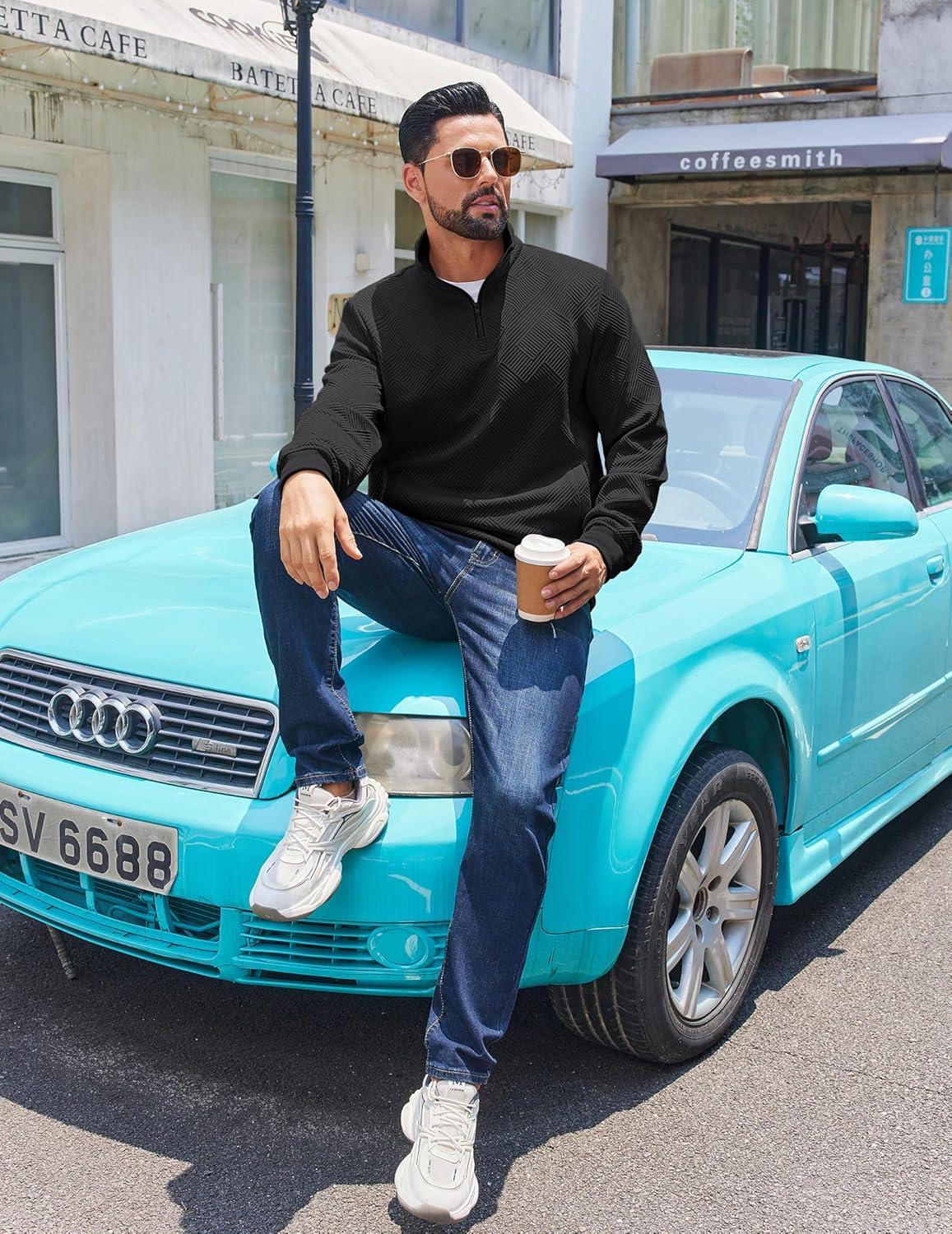 COOFANDY Mens Quarter Zip Pullover Casual Long Sleeve Quilted Sweatshirt Mock Neck Polo Sweater with Pocket(All Black)