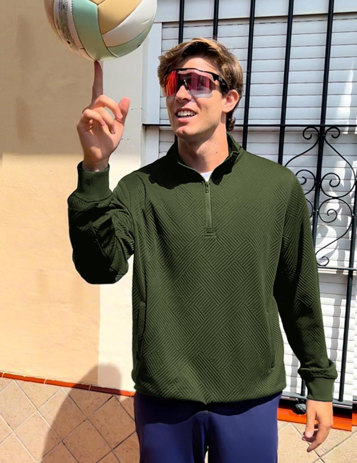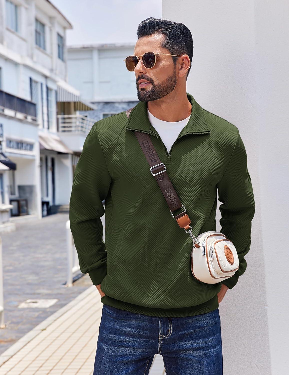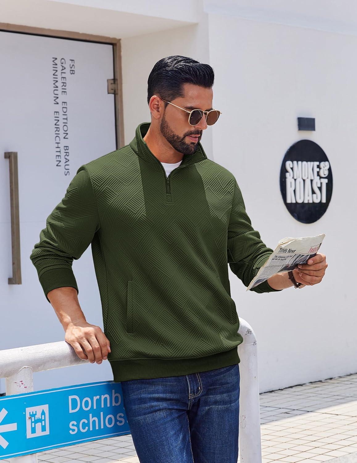COOFANDY Mens Quarter Zip Pullover Casual Long Sleeve Quilted Sweatshirt Mock Neck Polo Sweater with Pocket(Army Green)