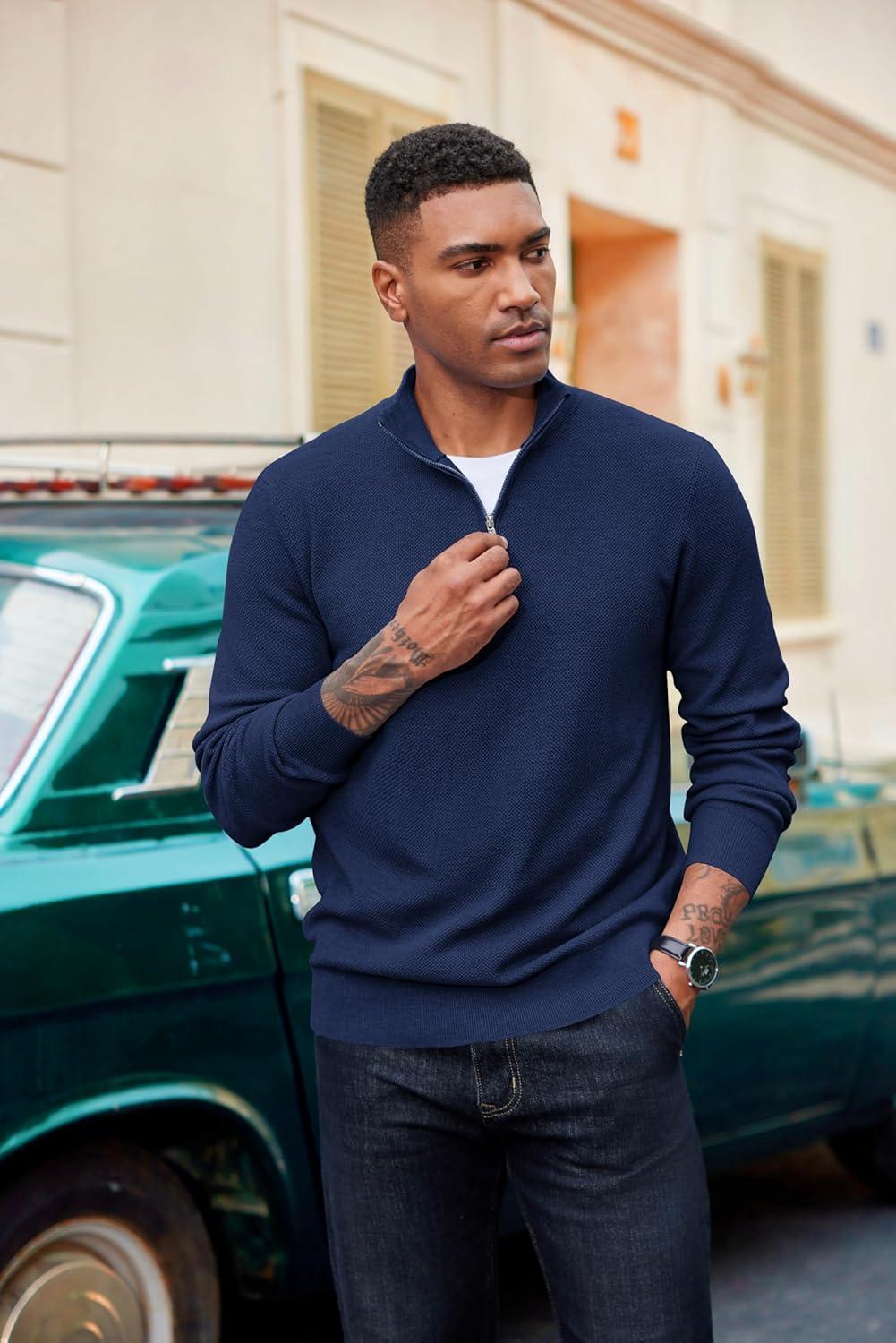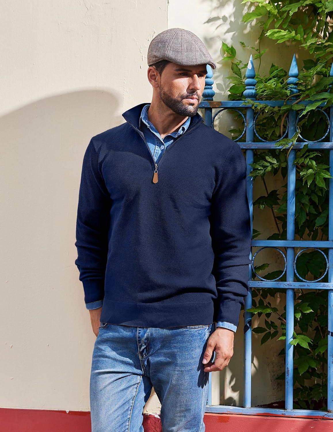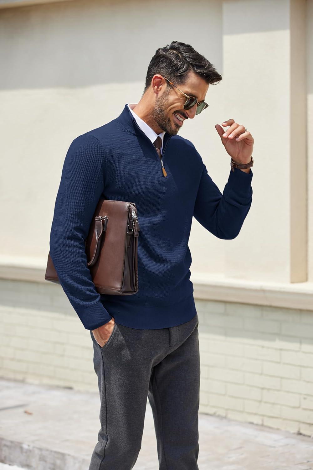 COOFANDY Men’s Quarter Zip Pullover Dress Slim Fit Sweater Mock Neck Sweaters Casual Long Sleeve Pullovers(Navy Blue)