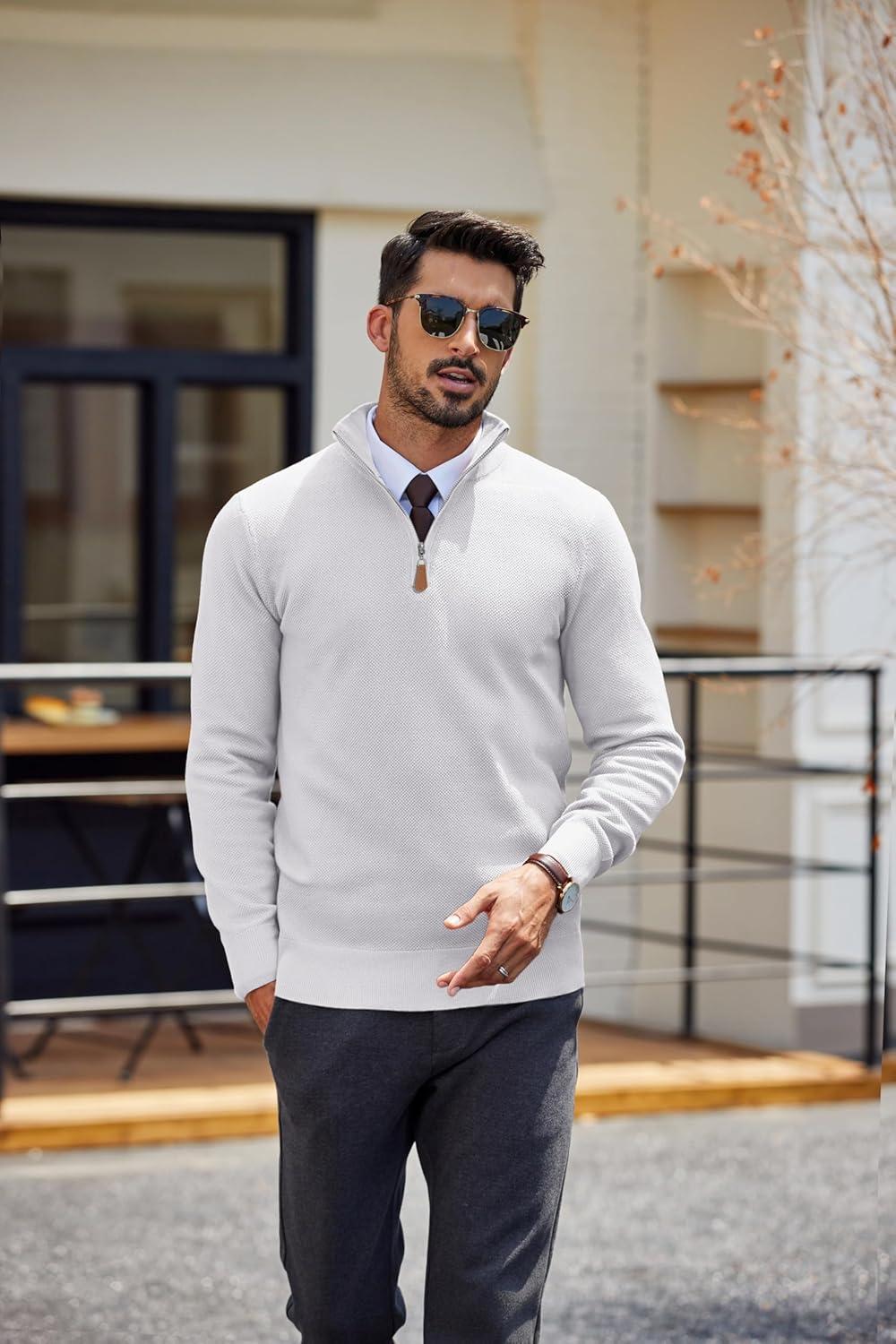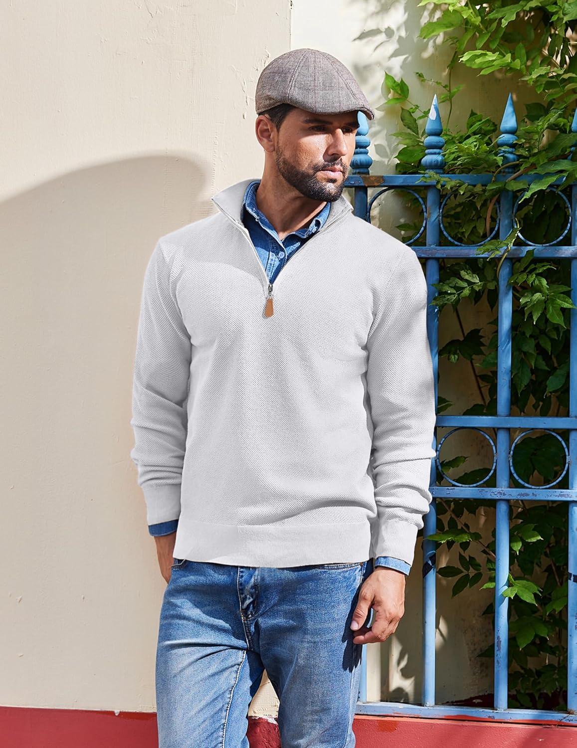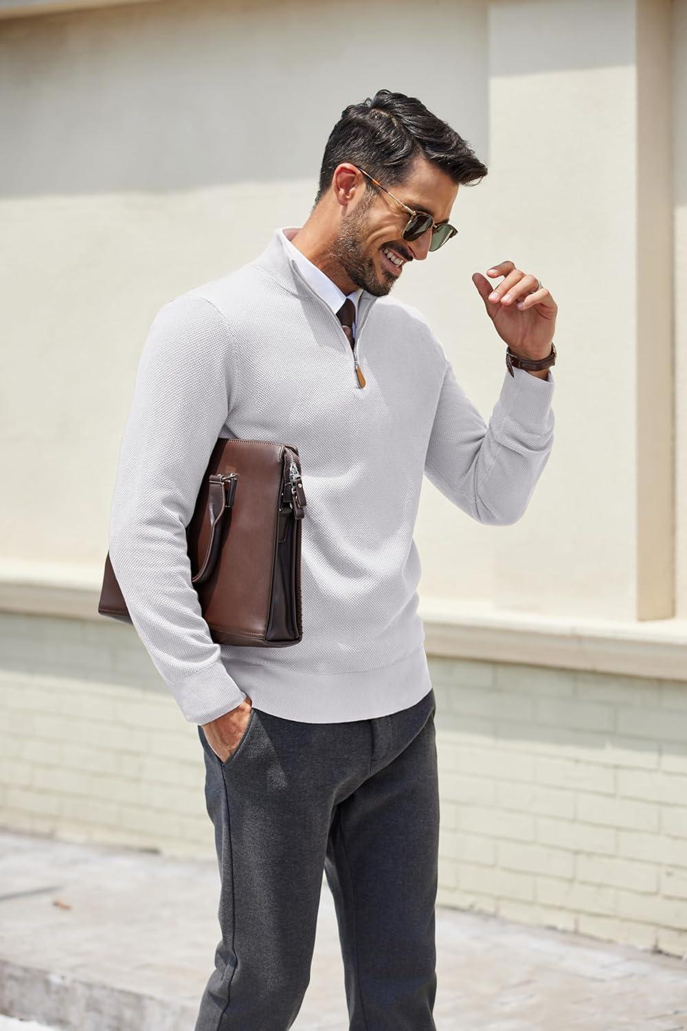 COOFANDY Men’s Quarter Zip Pullover Dress Slim Fit Sweater Mock Neck Sweaters Casual Long Sleeve Pullovers(White)