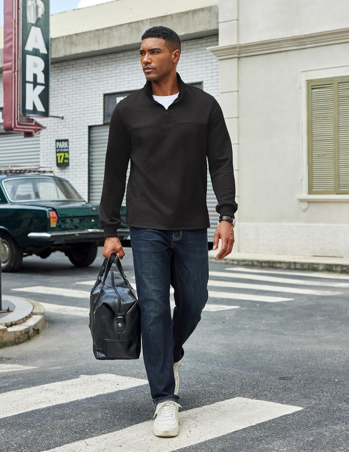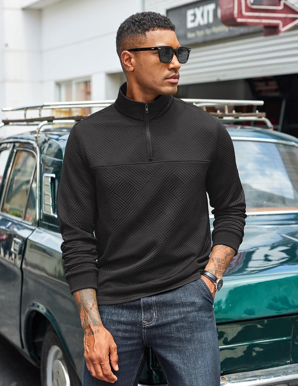Score big savings on COOFANDY Men’s Quarter Zip Pullover Lightweight Textured Sweatshirt Long Sleeve Casual Mock Neck Polo Shirts(All Black) during our back-to-school sale. Limited quantities available.