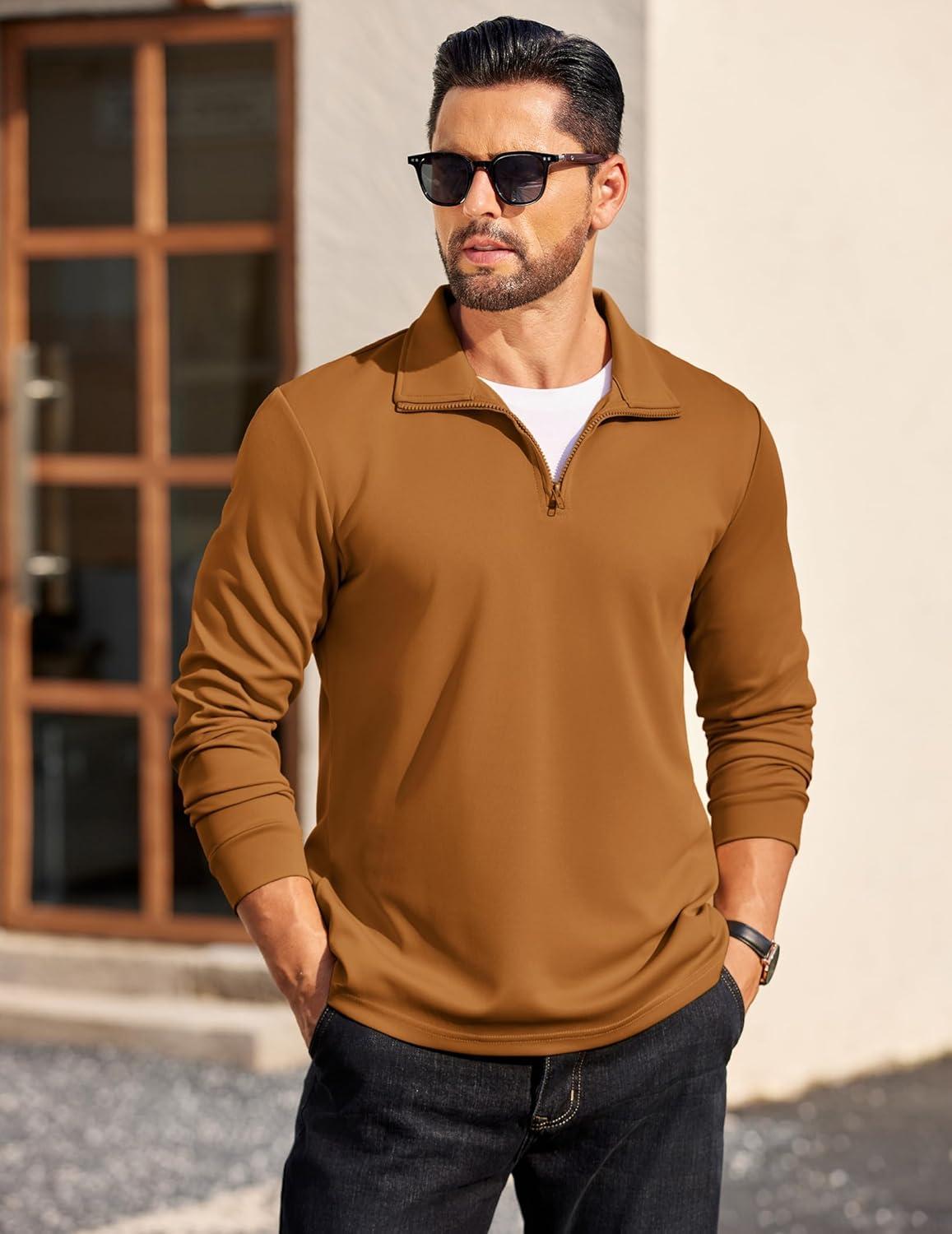 COOFANDY Mens Quarter Zip Pullover Long Sleeve Casual 1/4 Zip Sweatshirt Lightweight Solid Shirts Regular Fit(Light Brown)