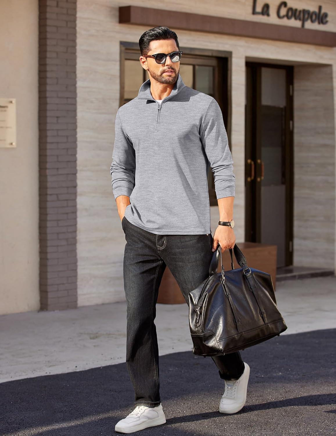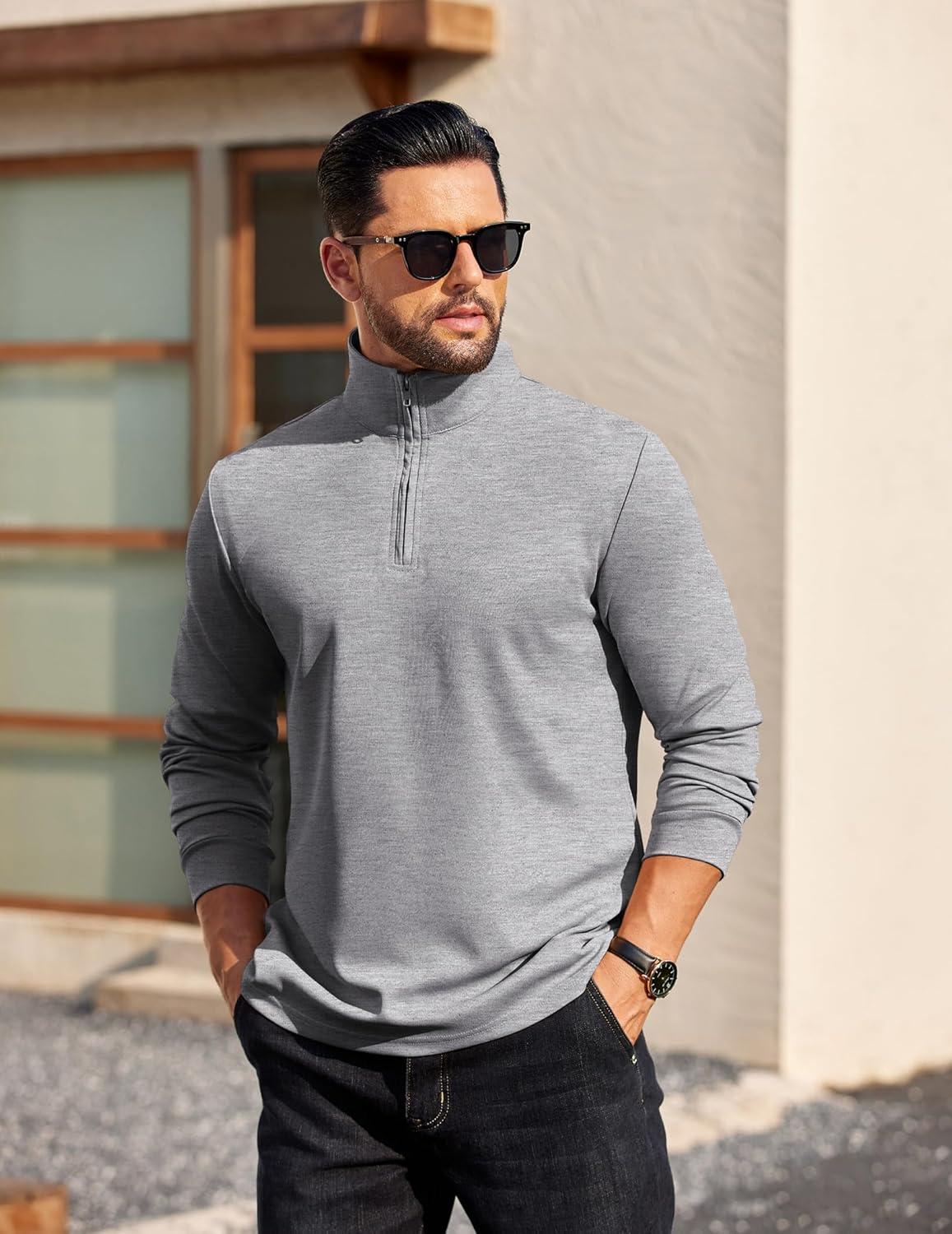 COOFANDY Mens Quarter Zip Pullover Long Sleeve Casual 1/4 Zip Sweatshirt Lightweight Solid Shirts Regular Fit(Light Grey (Heather))