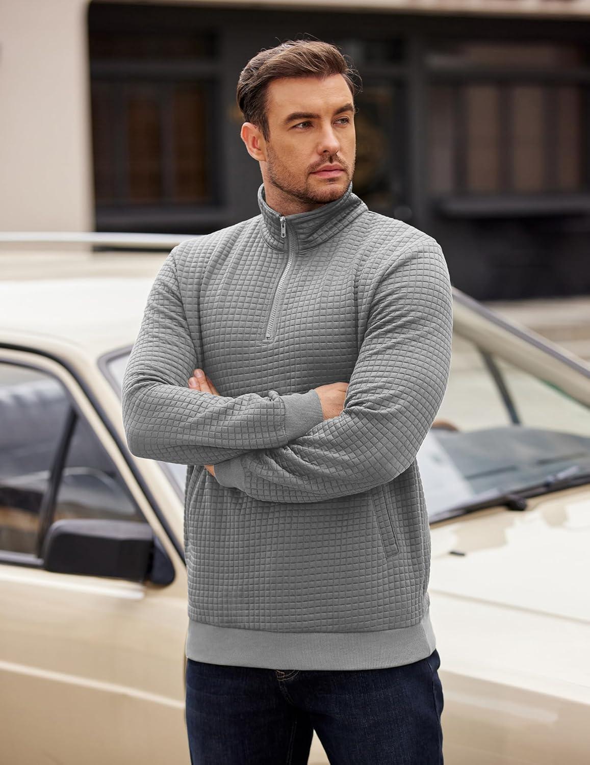 COOFANDY Mens Quarter Zip Pullover Long Sleeve Quilted Sweatshirt Casual Waffle Sweaters Polo with Pocket(Light Grey)