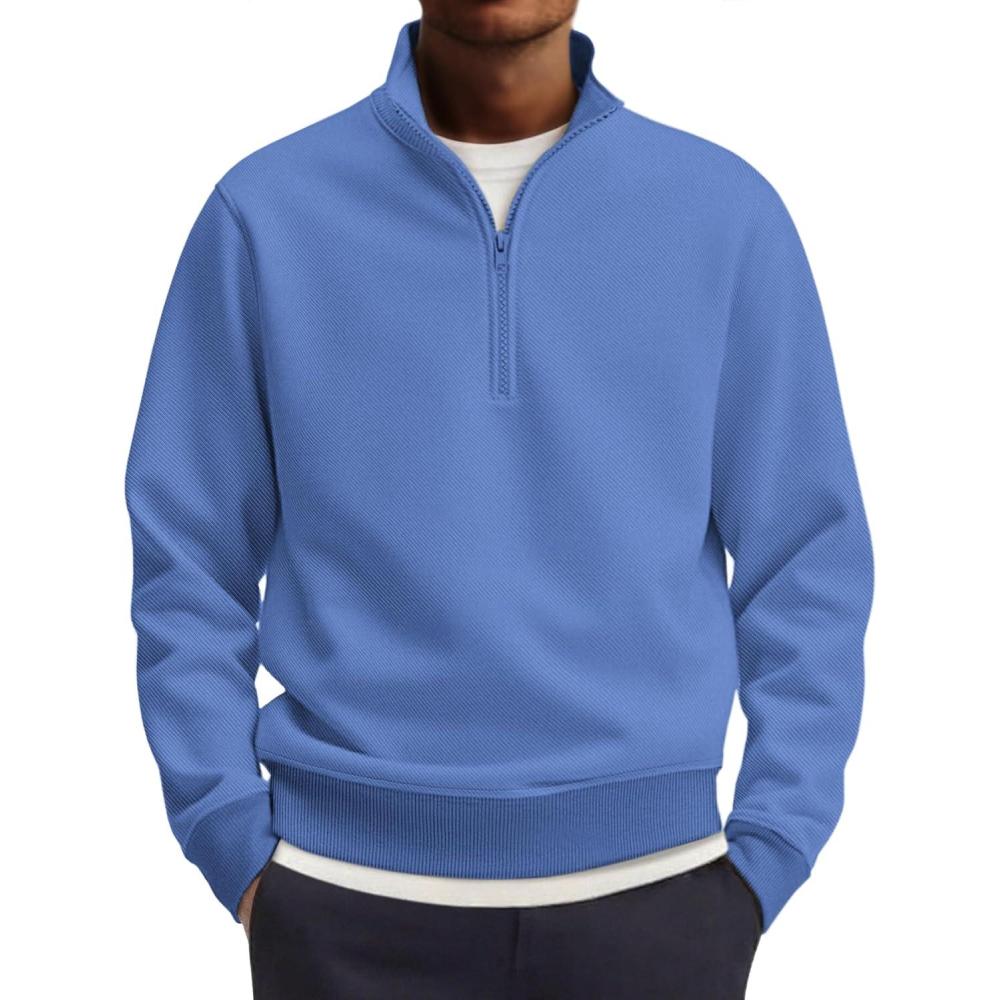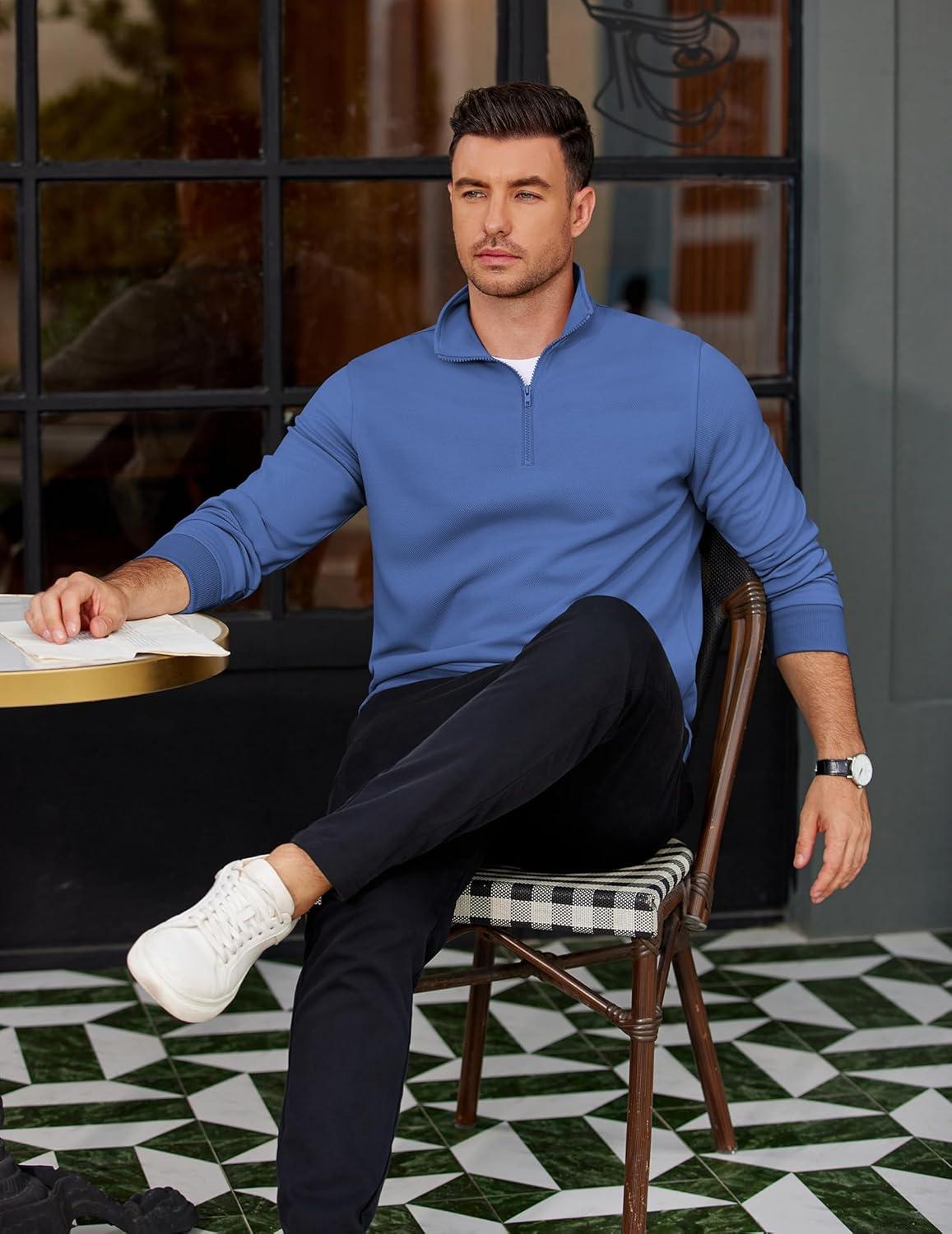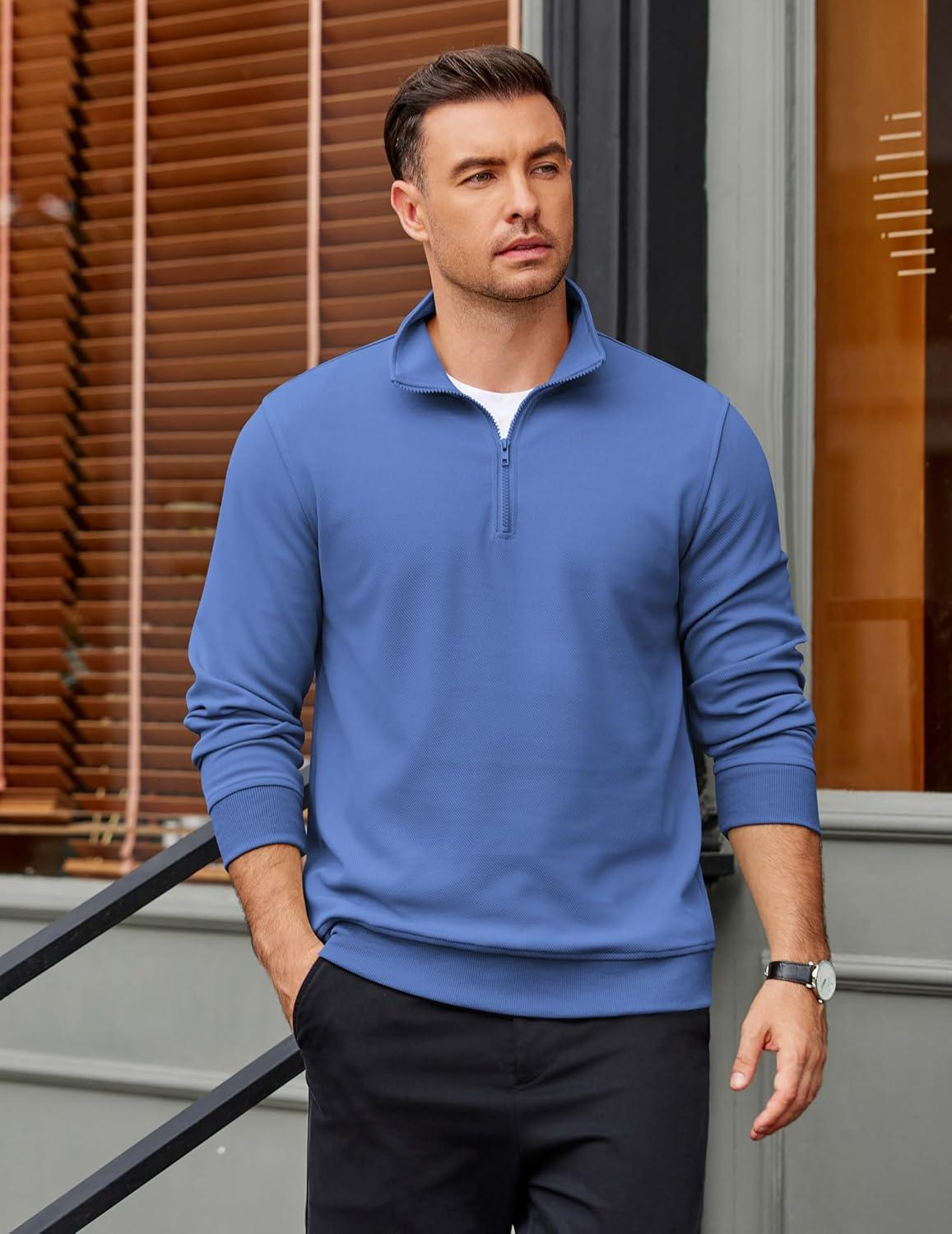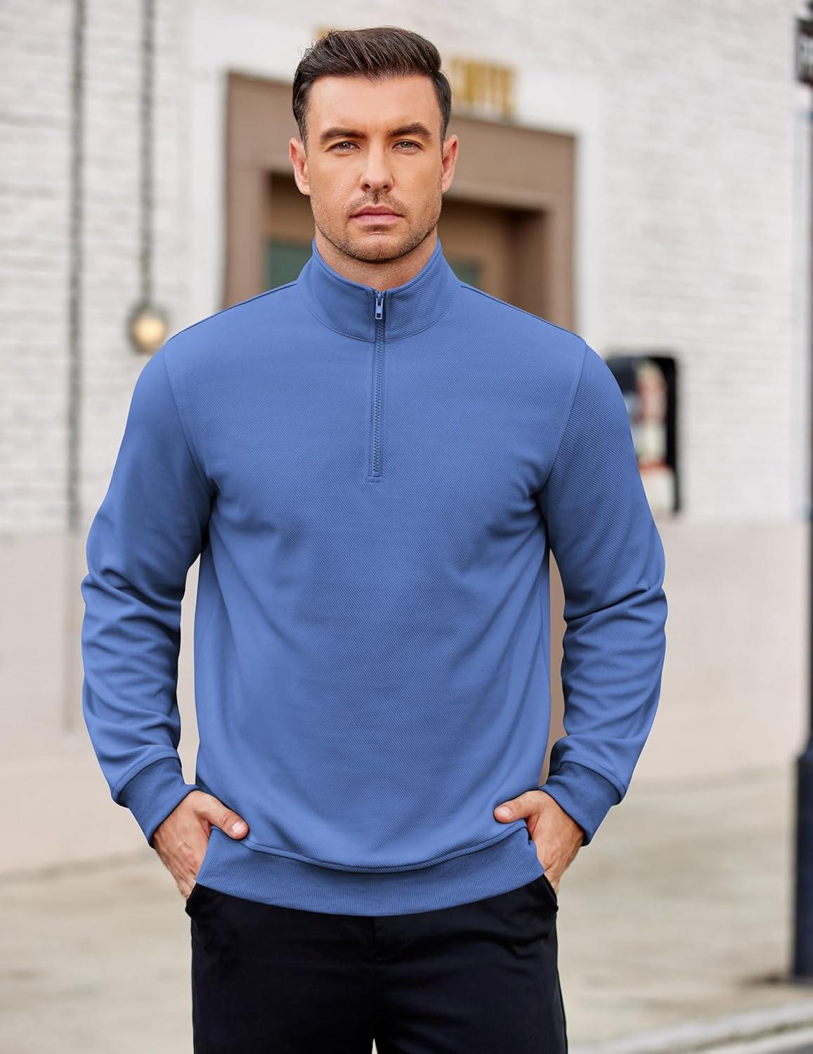 COOFANDY Men's Quarter Zip Pullover Mock Neck Lightweight Sweatshirt Long Sleeve Polo Shirt Business Casual Pullover Top(Blue)