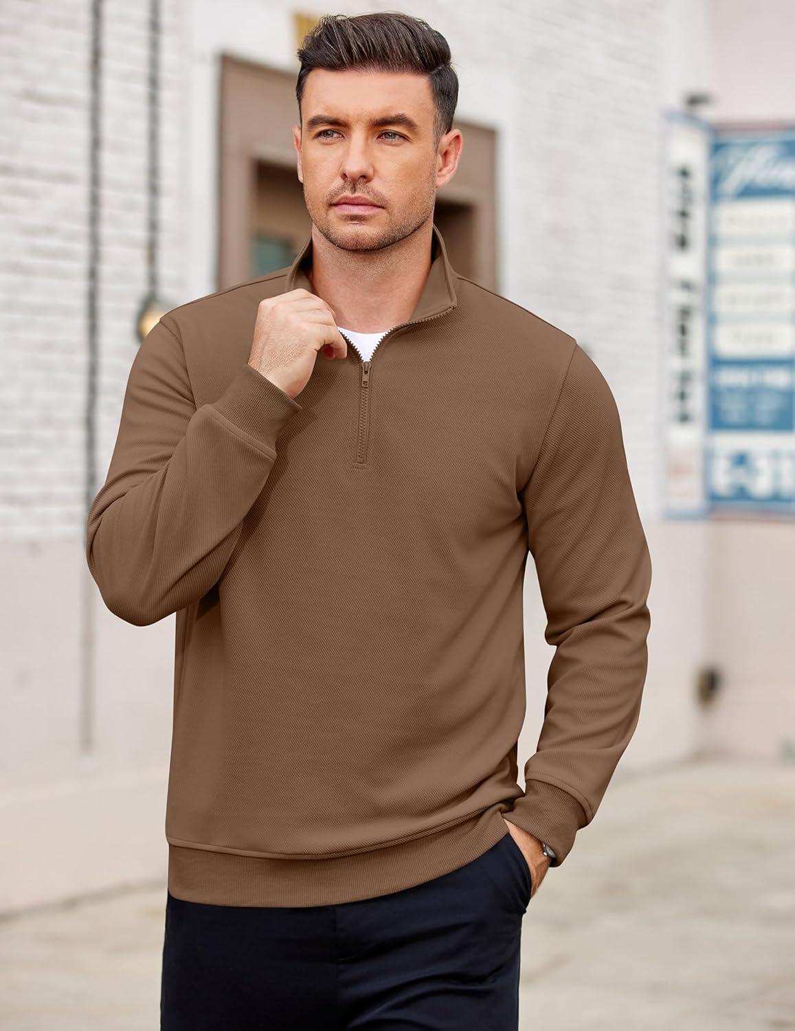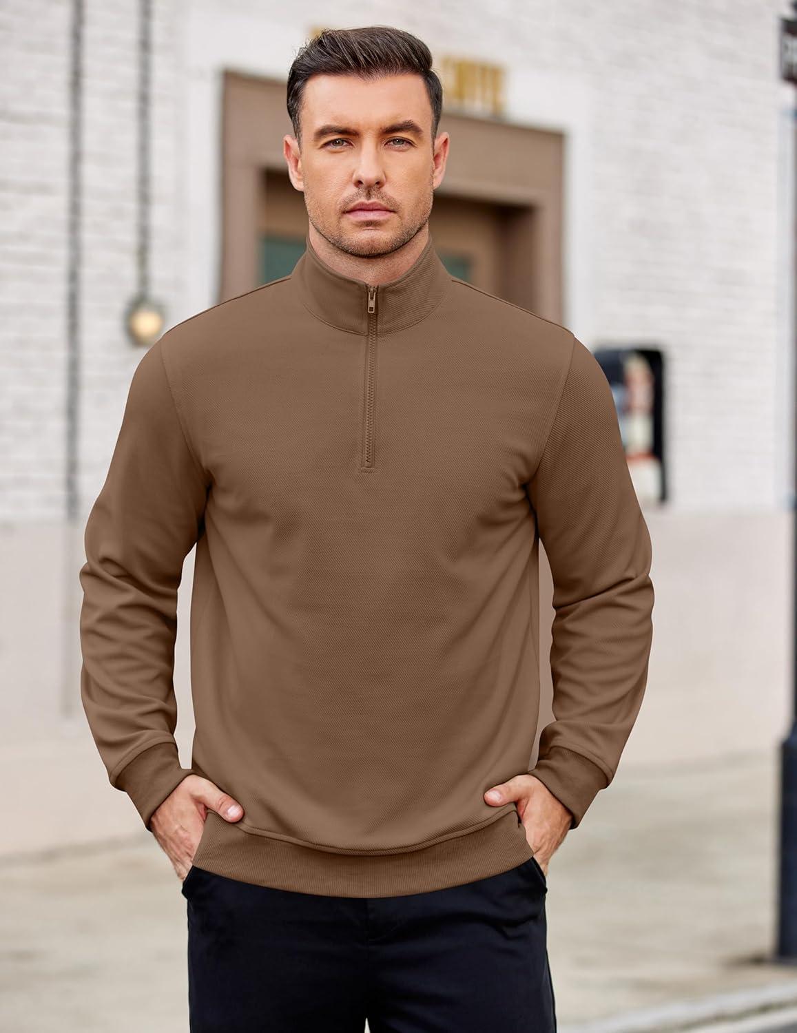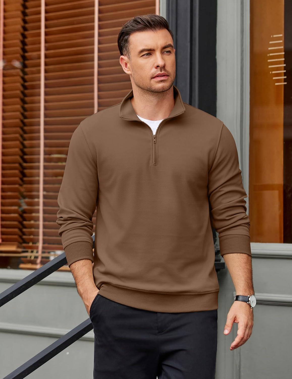 COOFANDY Men's Quarter Zip Pullover Mock Neck Lightweight Sweatshirt Long Sleeve Polo Shirt Business Casual Pullover Top(Brown)