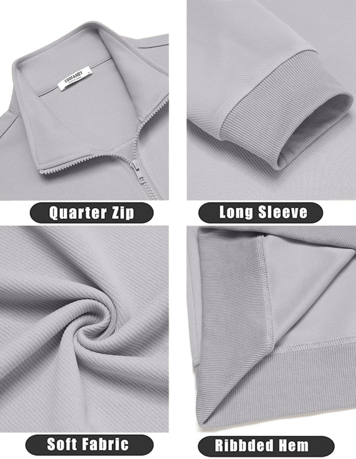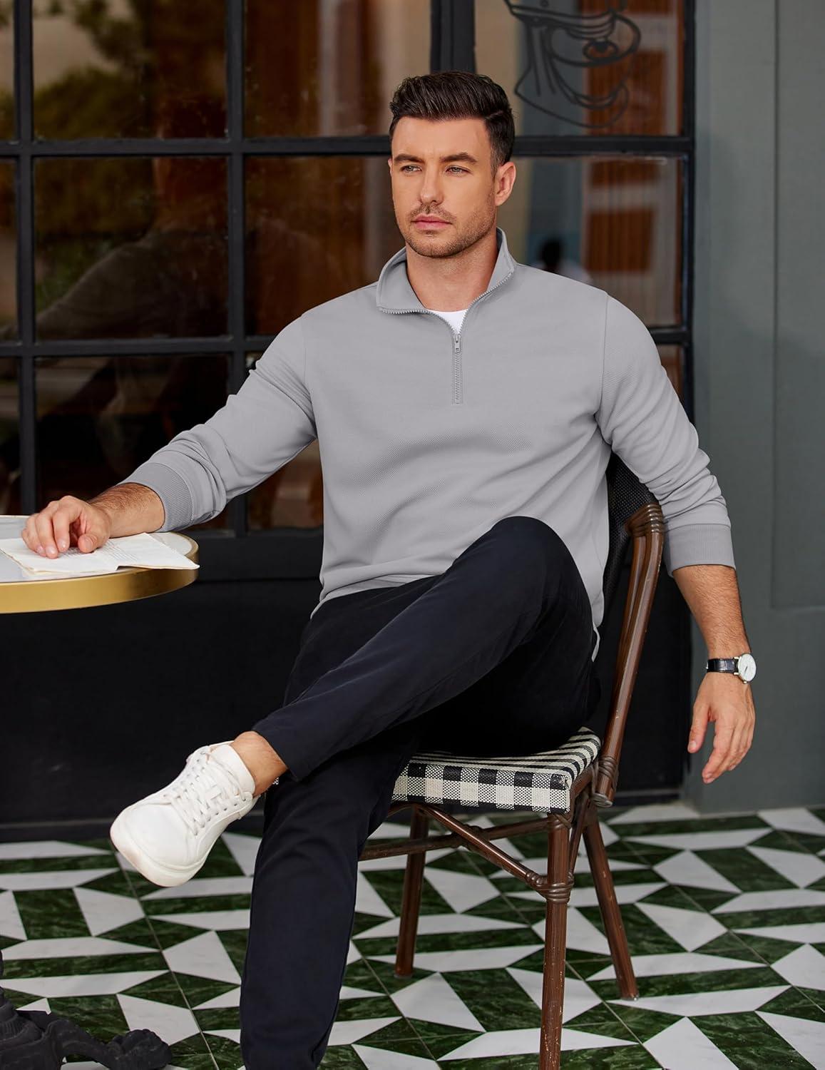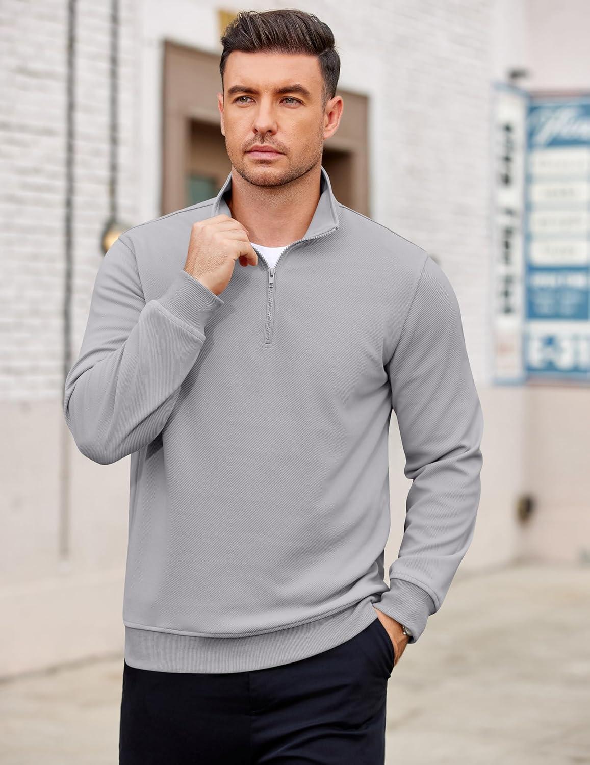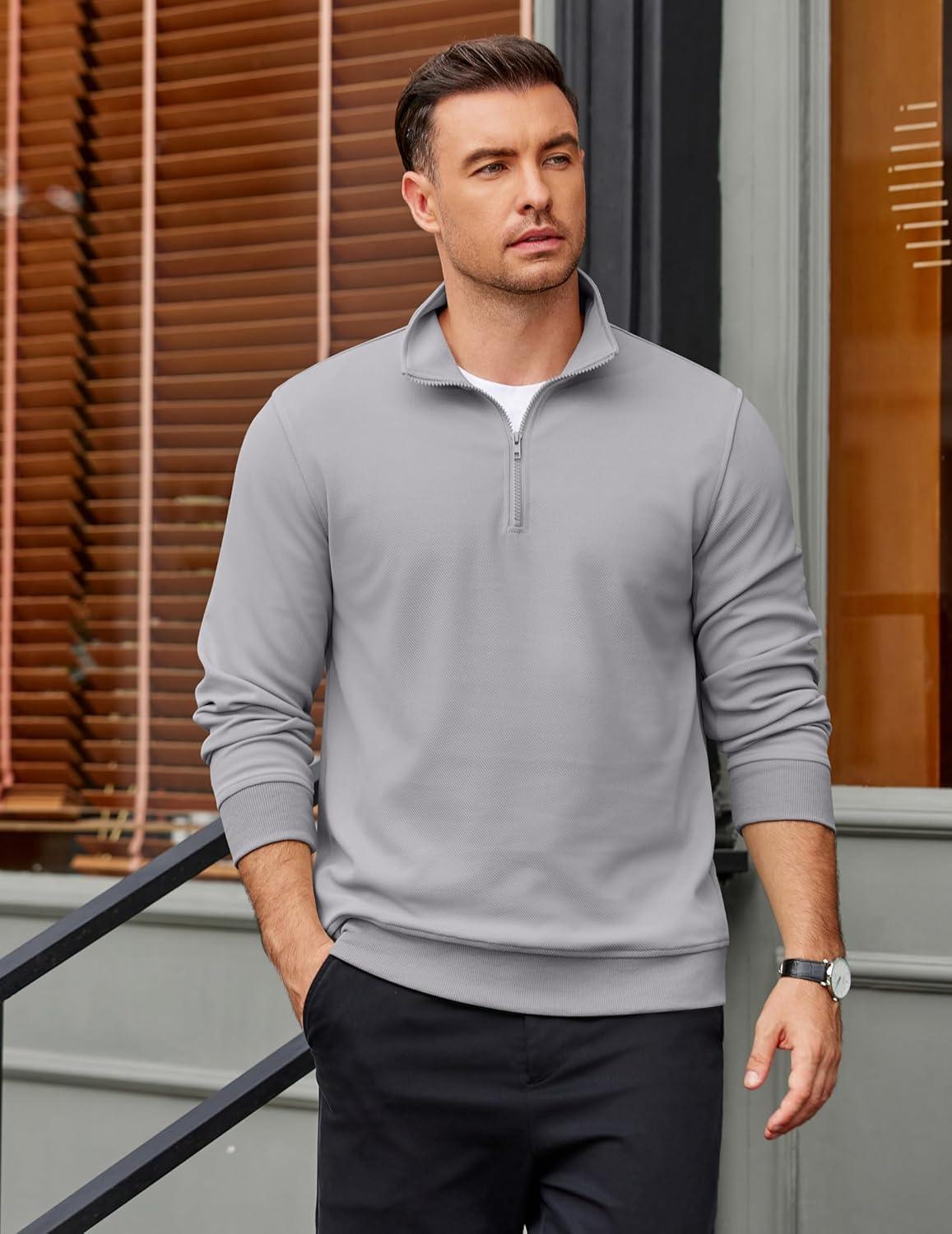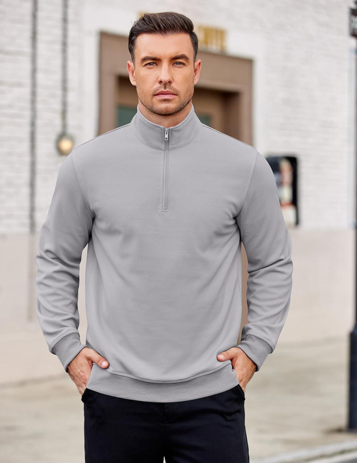 COOFANDY Men's Quarter Zip Pullover Mock Neck Lightweight Sweatshirt Long Sleeve Polo Shirt Business Casual Pullover Top(Light Gray)
