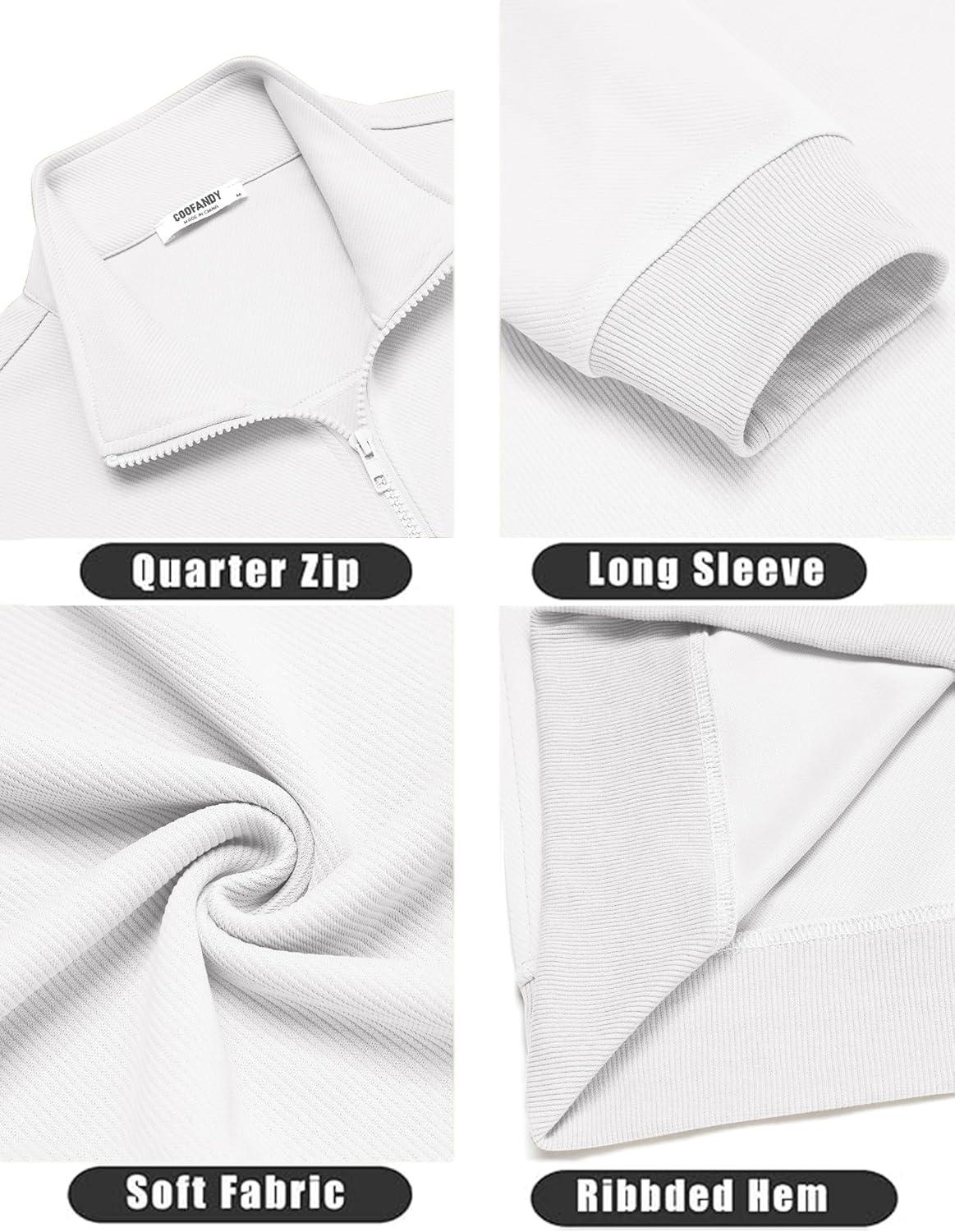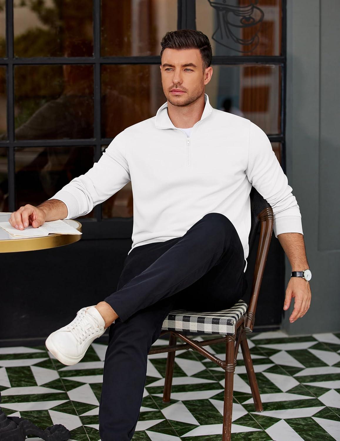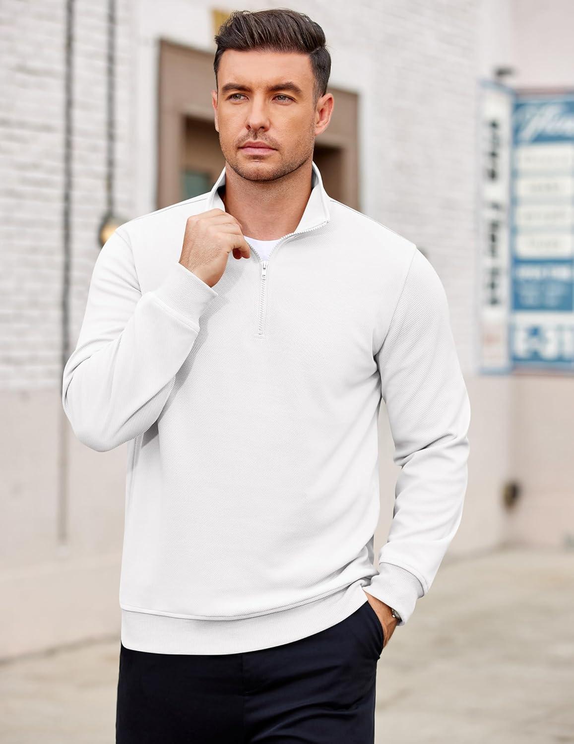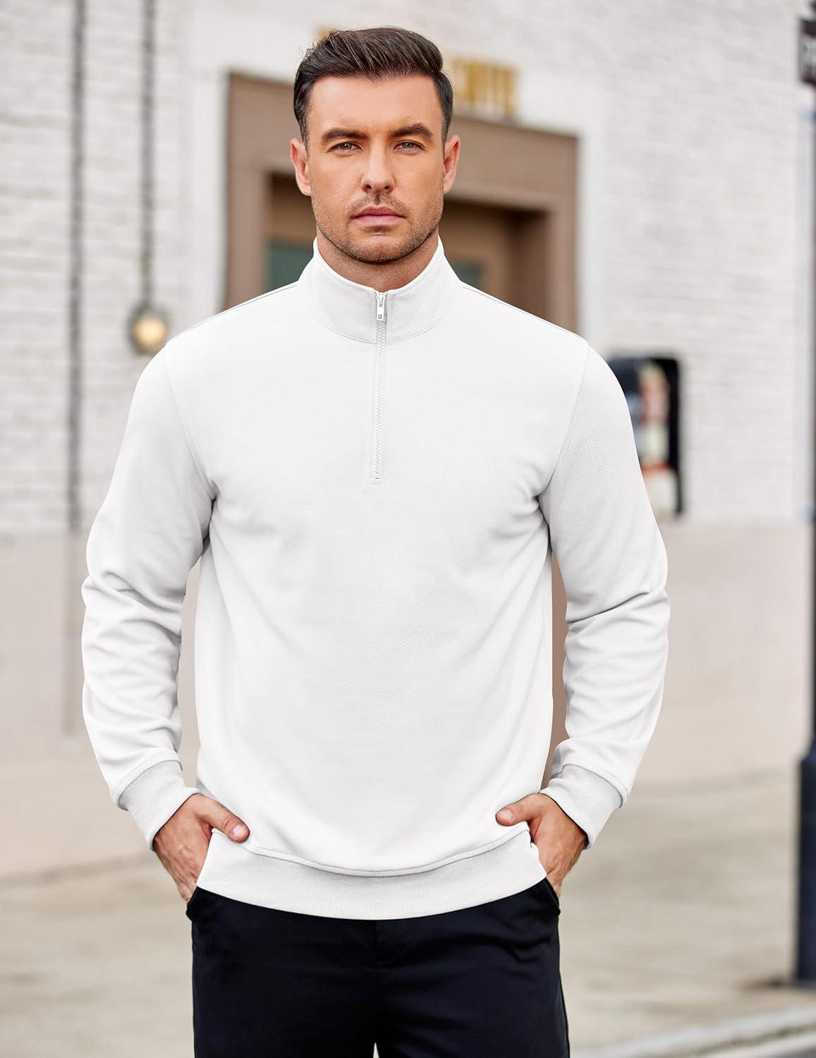 COOFANDY Men’s Quarter Zip Pullover Mock Neck Lightweight Sweatshirt Long Sleeve Polo Shirt Business Casual Pullover Top(White)