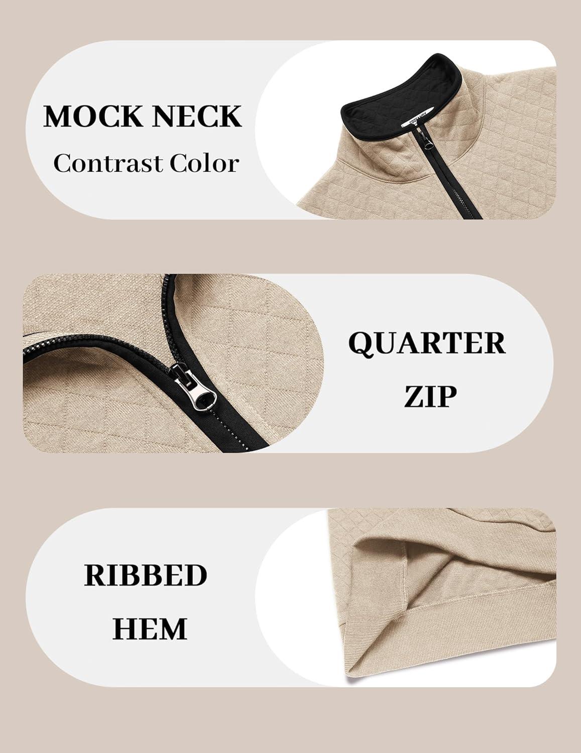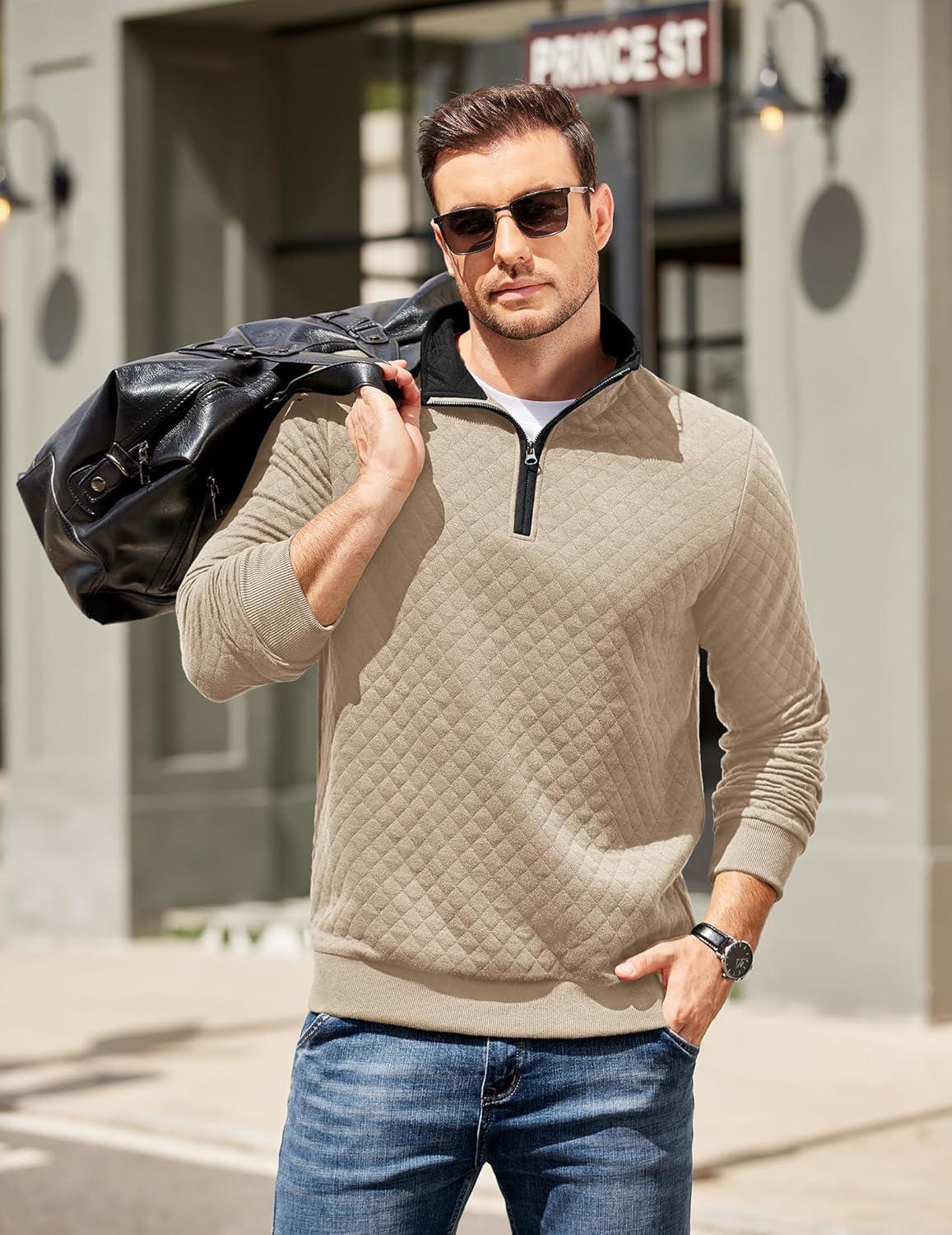 COOFANDY Mens Quarter Zip Pullover Mock Neck Quilted Sweatshirt Casual Long Sleeve Polo Sweater(Khaki)