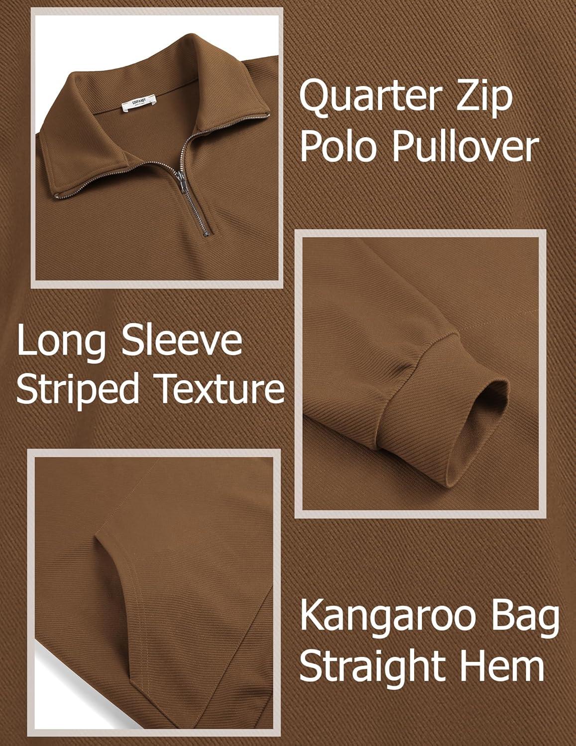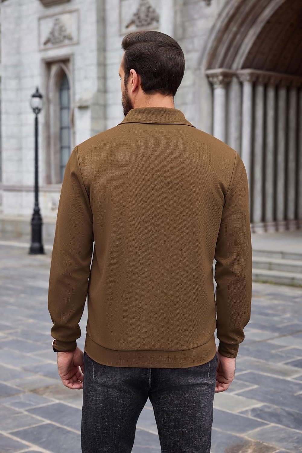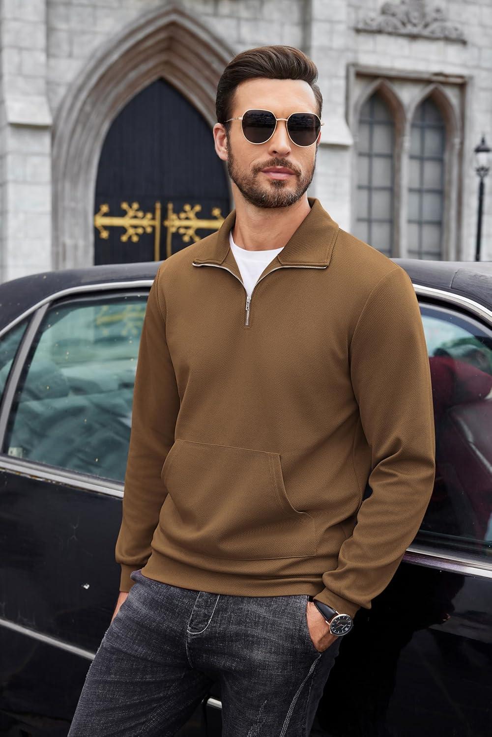 COOFANDY Mens Quarter Zip Pullover Mock Neck Sweatshirt Long Sleeve Sweater Polo Half Zip Pullover with Pocket(Brown)