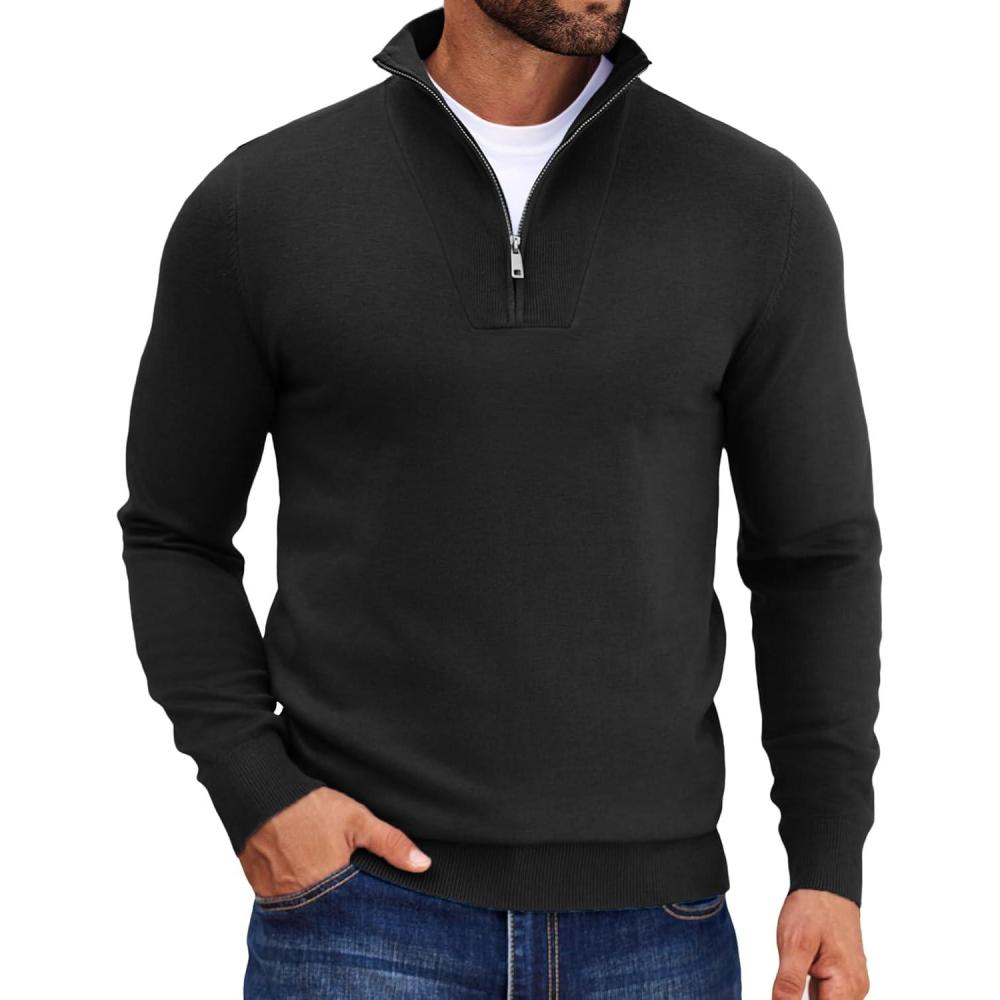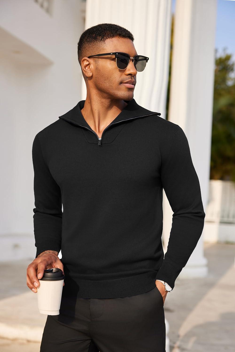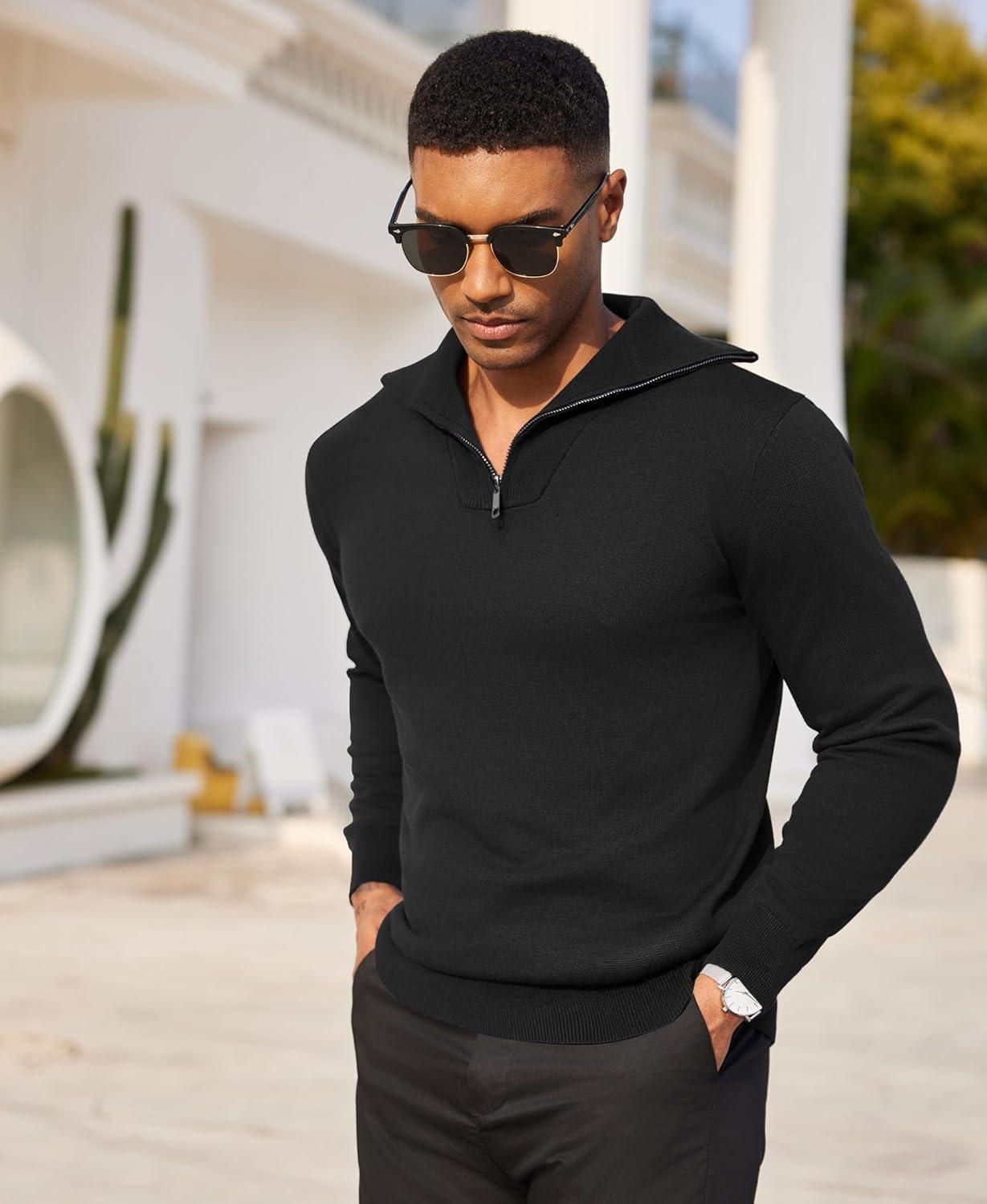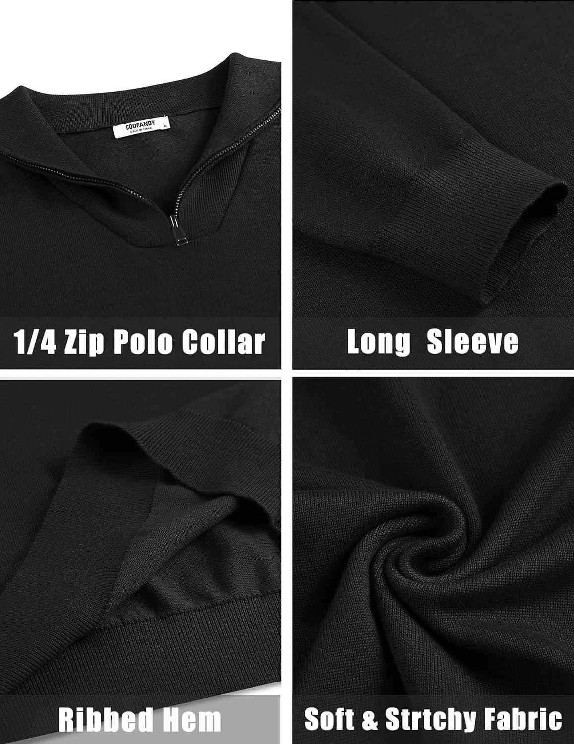 COOFANDY Mens Quarter Zip Pullover Quilted Pullover Casual Knit Long Sleeve Mock Neck Sweater Polo(Black)