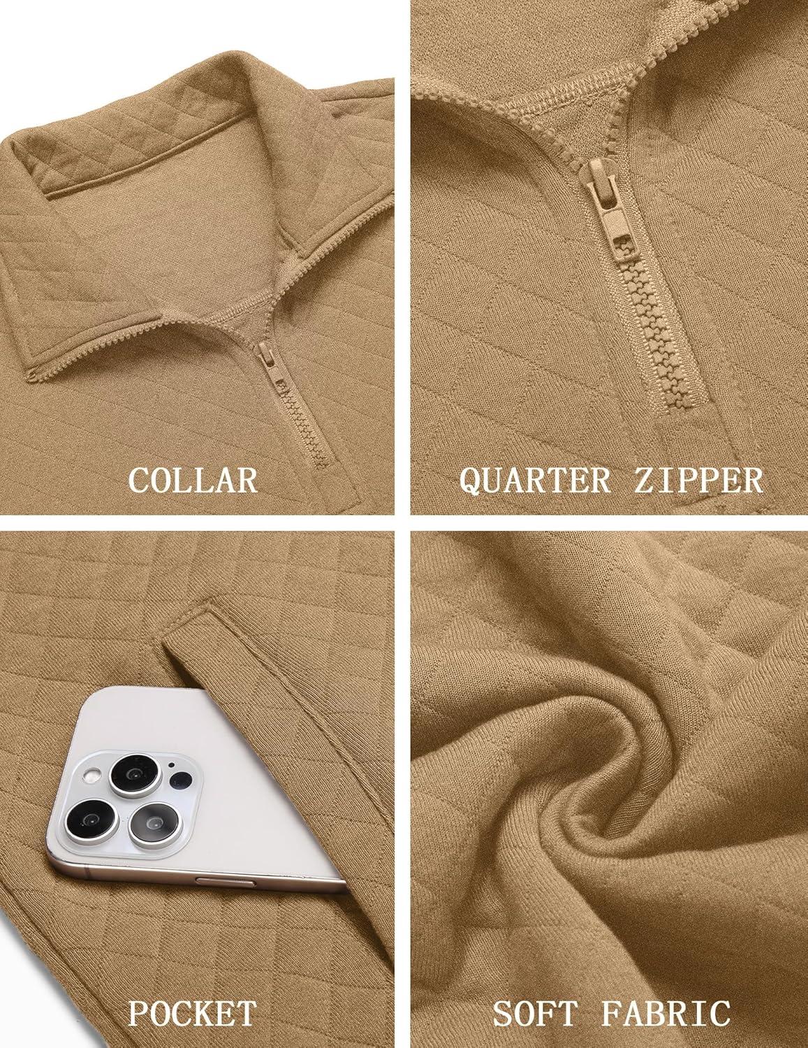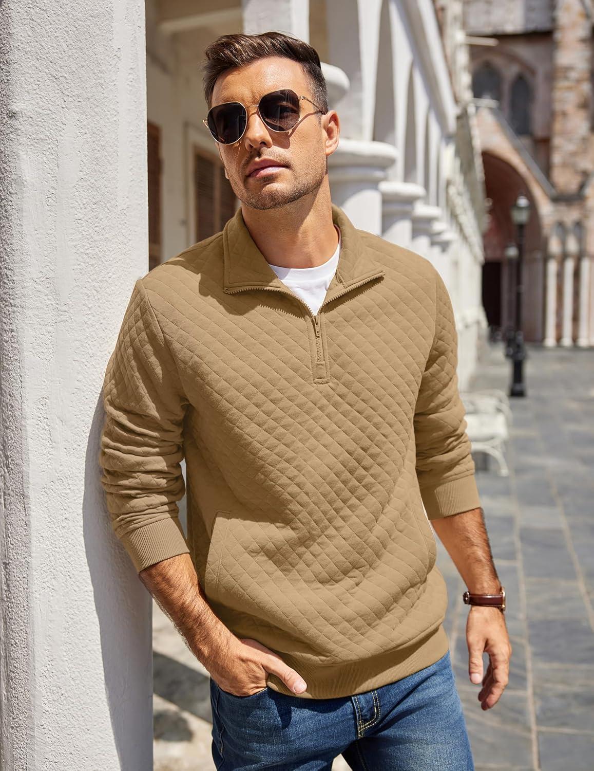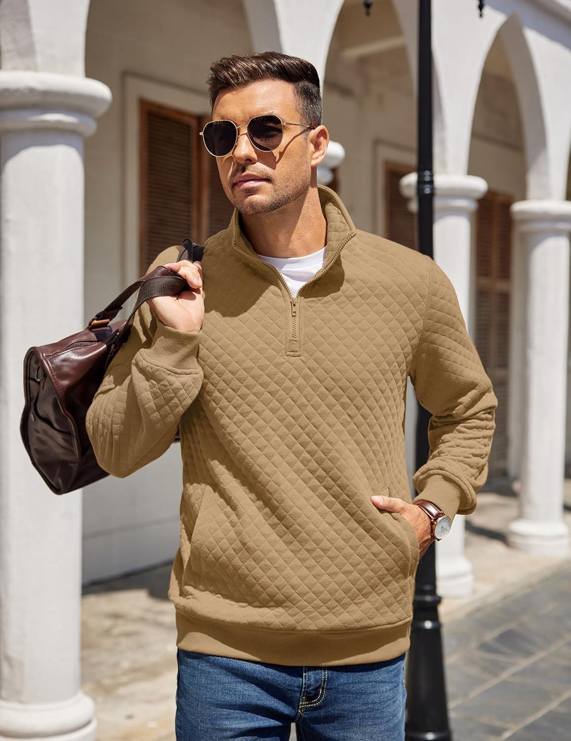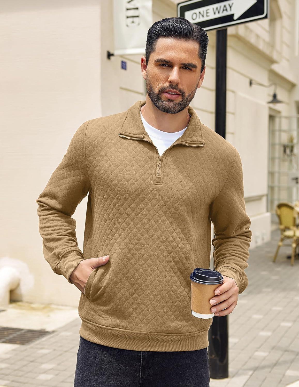 Don’t miss out on our limited-time offer: buy COOFANDY Mens Quarter Zip Pullover Quilted Sweatshirt Knit Long Sleeve Mock Neck Sweater Polo with Pocket(Camel), get {accessory} free!
