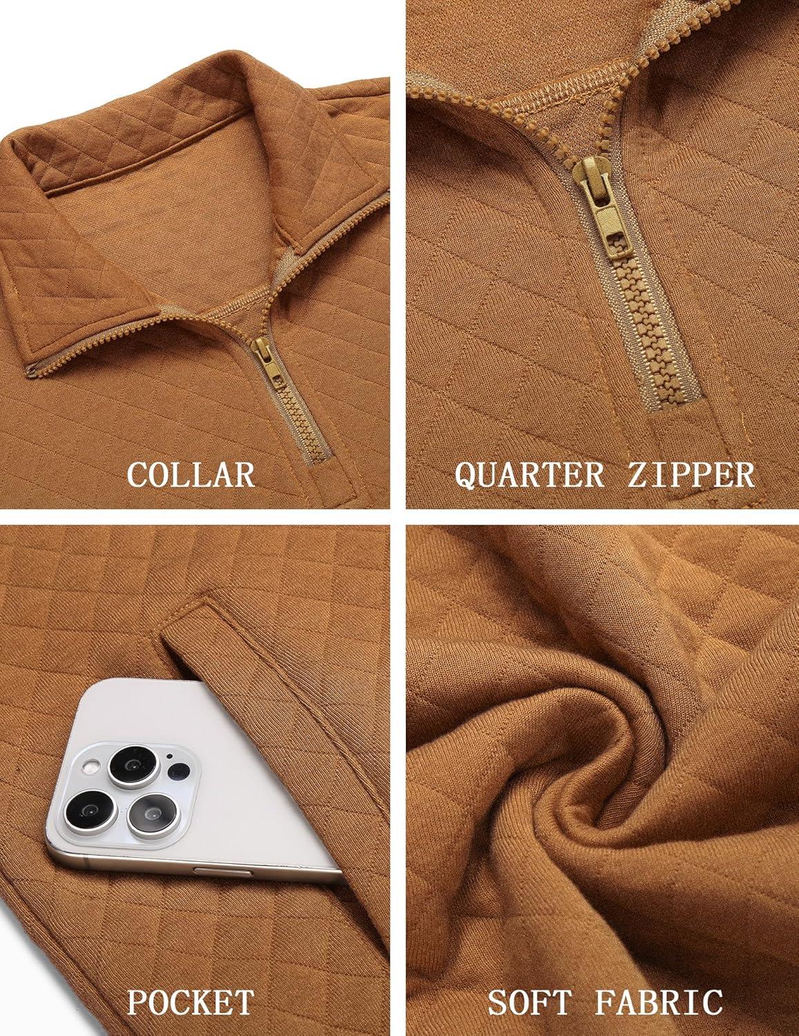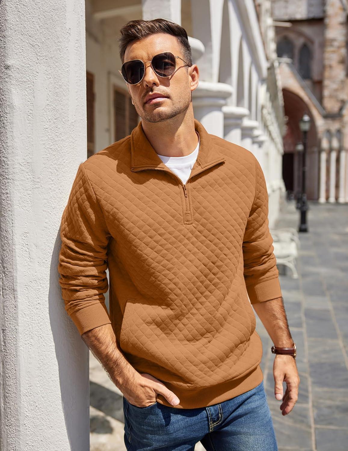 COOFANDY Mens Quarter Zip Pullover Quilted Sweatshirt Knit Long Sleeve Mock Neck Sweater Polo with Pocket(Light Brown)