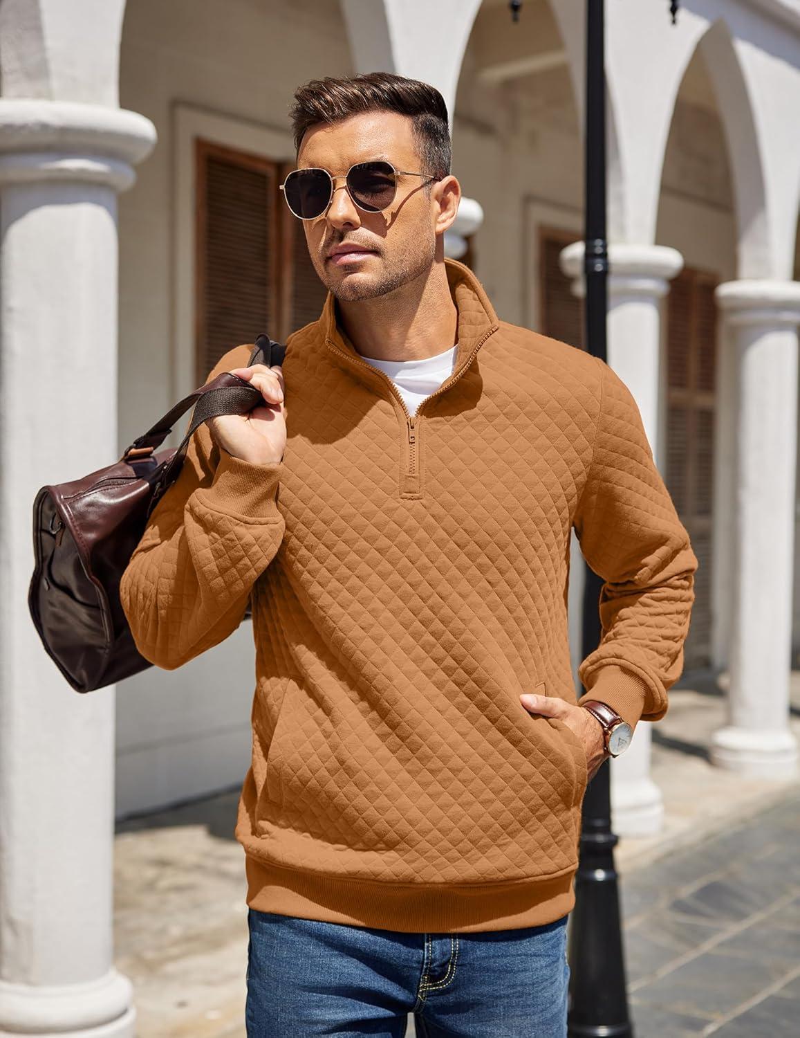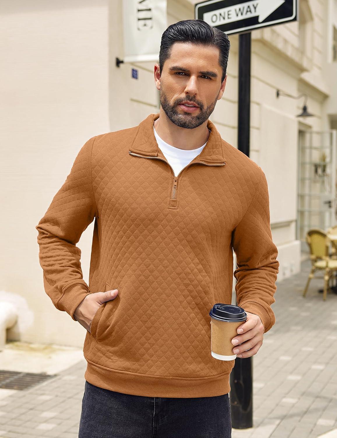 imageCOOFANDY Mens Quarter Zip Pullover Quilted Sweatshirt Knit Long Sleeve Mock Neck Sweater Polo with PocketLight Brown