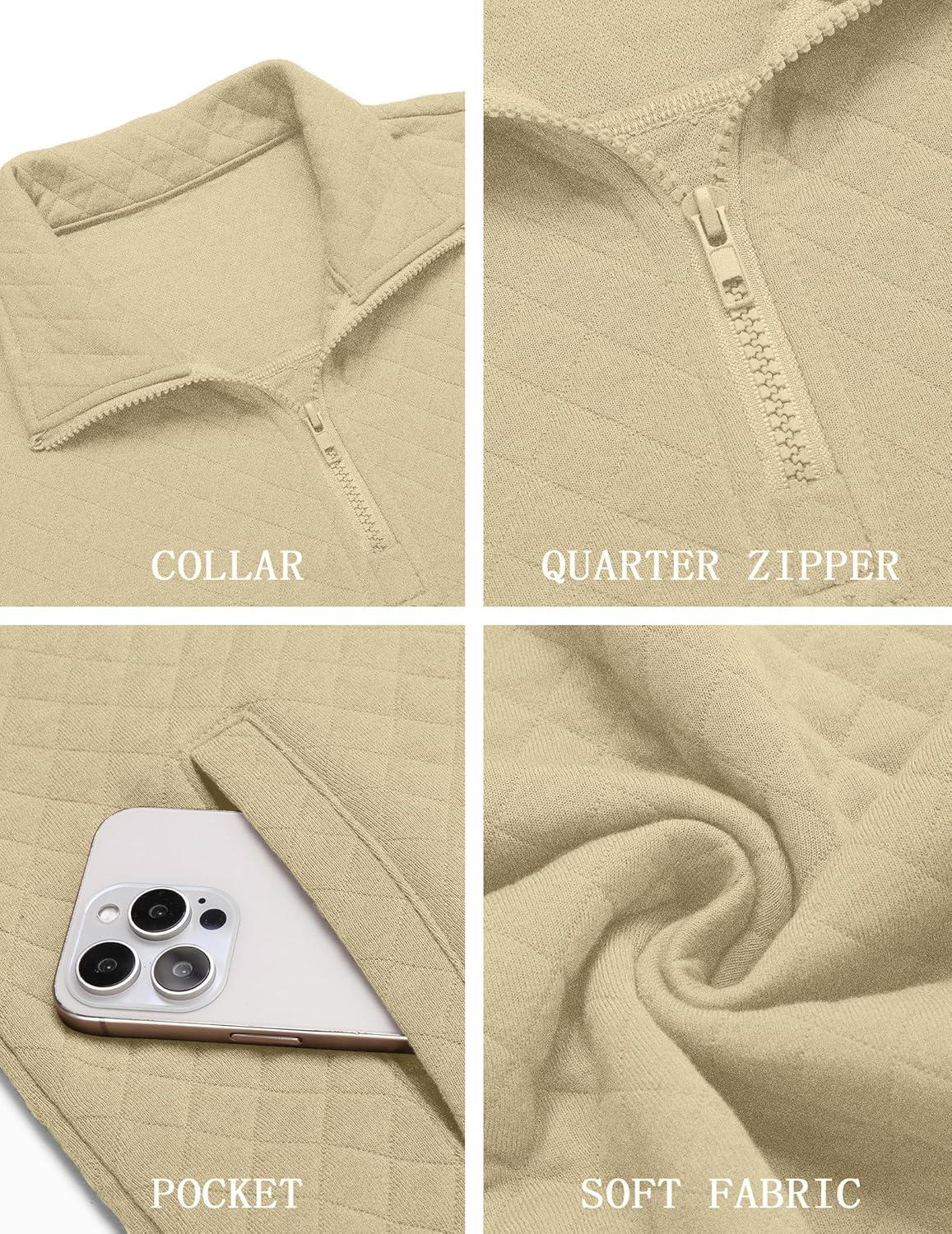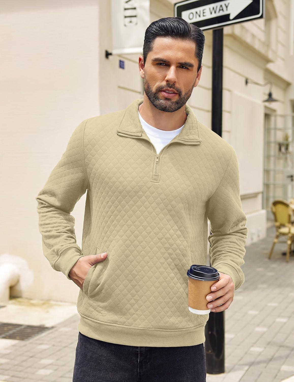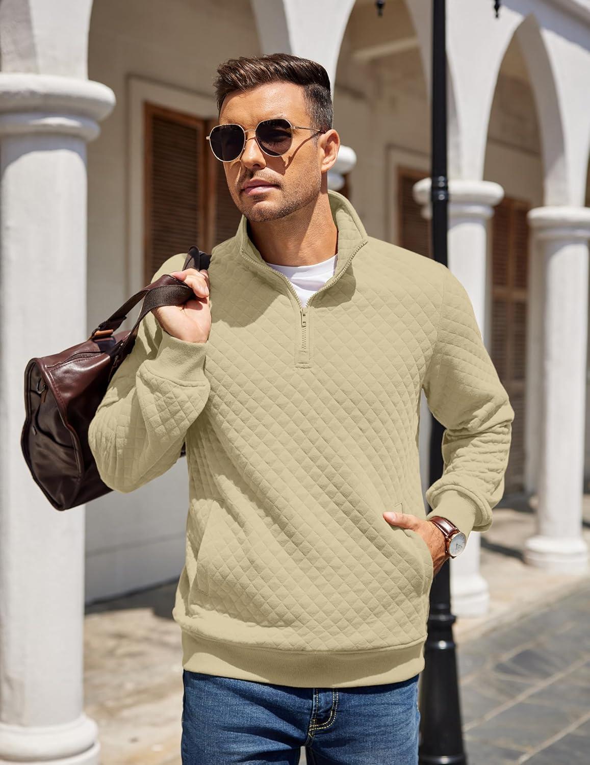 COOFANDY Mens Quarter Zip Pullover Quilted Sweatshirt Knit Long Sleeve Mock Neck Sweater Polo with Pocket(Light Khaki)