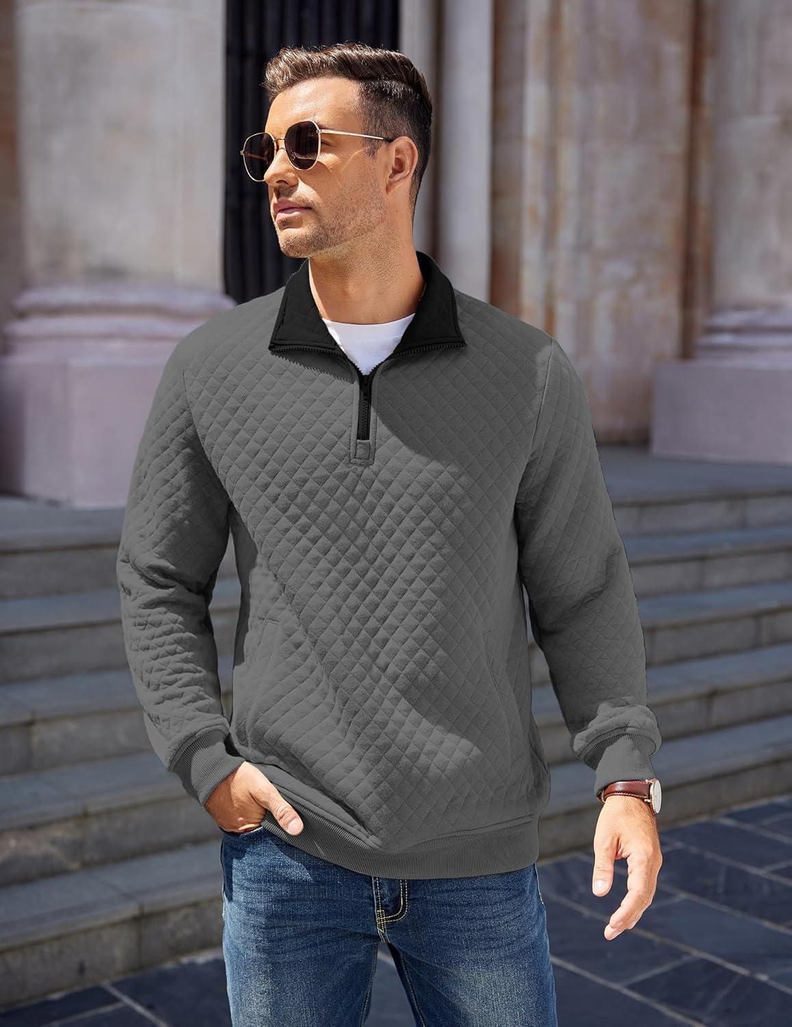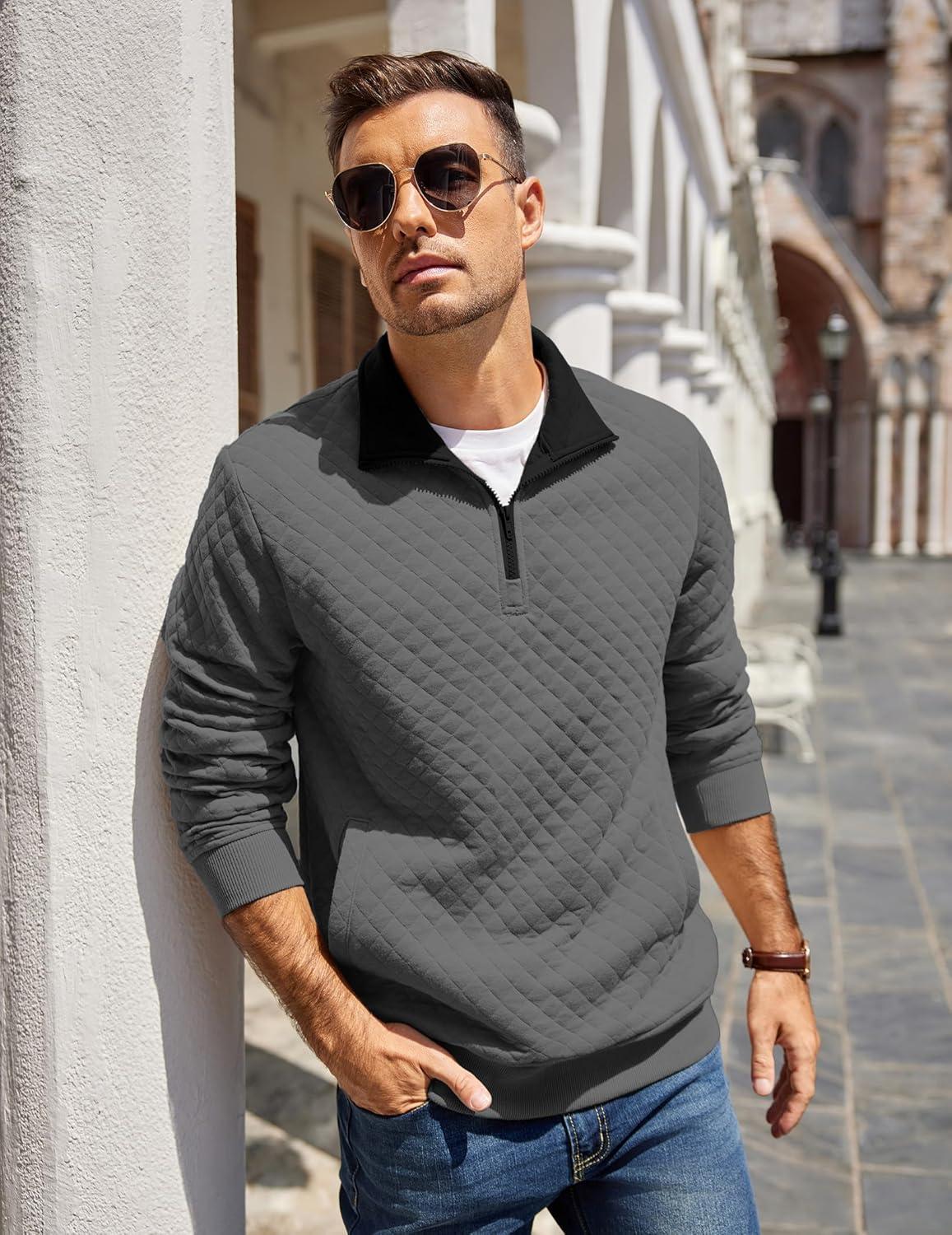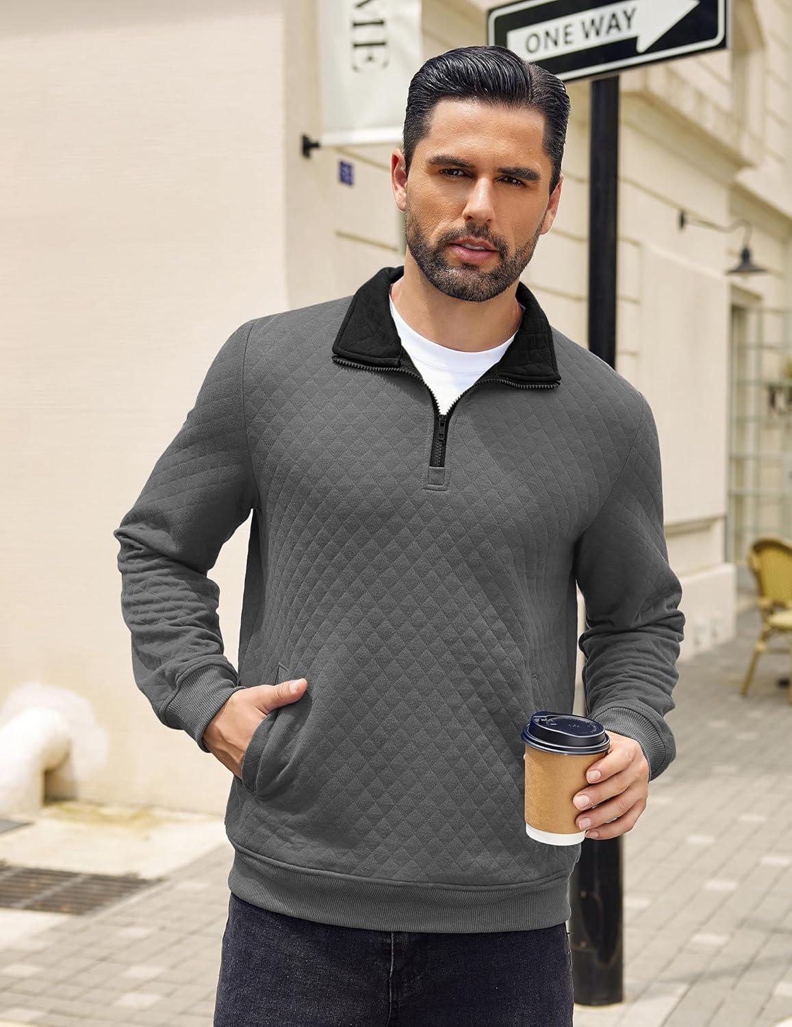 COOFANDY Mens Quarter Zip Pullover Quilted Sweatshirt Knit Long Sleeve Mock Neck Sweater Polo with Pocket(Z-contrast Gray/Black)