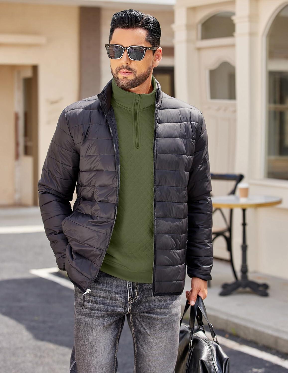 COOFANDY Mens Quarter Zip Pullover Casual Long Sleeve Quilted Sweatshirt Mock Neck Polo Sweater with Pocket(All Black)