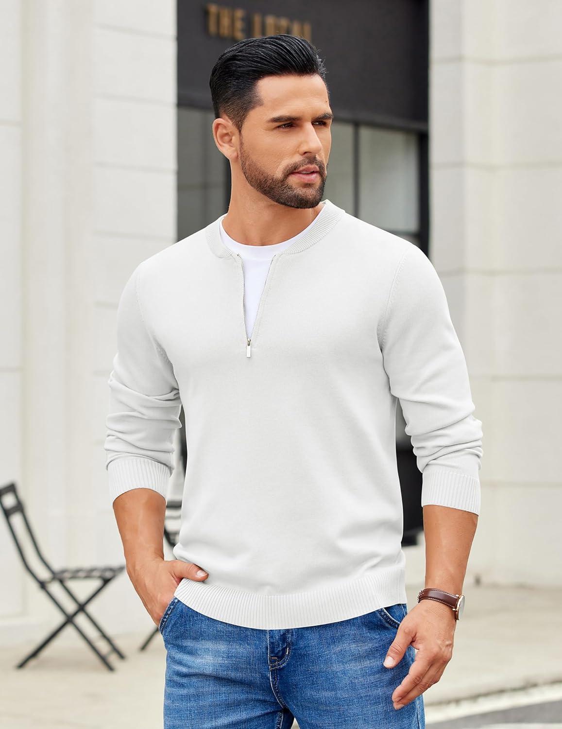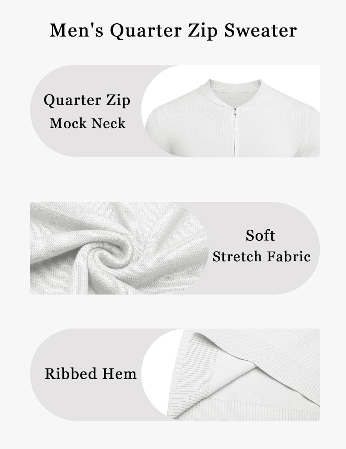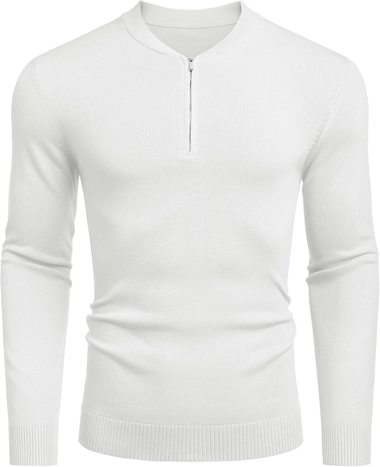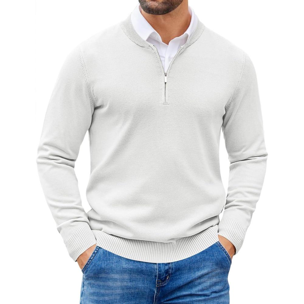 COOFANDY Men’s Quarter Zip Pullover Slim Fit Dress Sweaters Lightweight Mock Neck Knit Sweater(White)