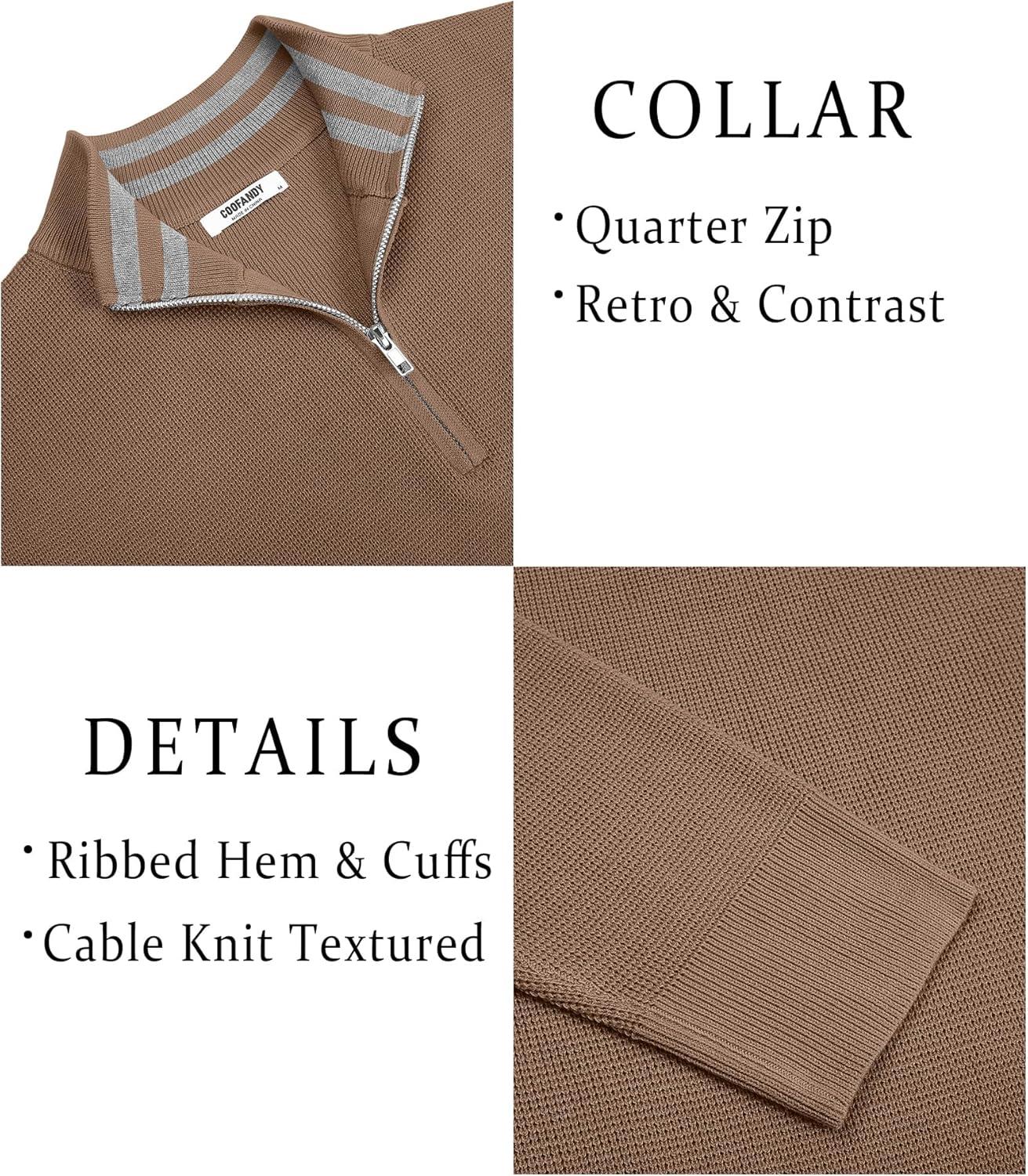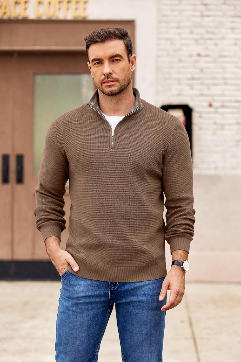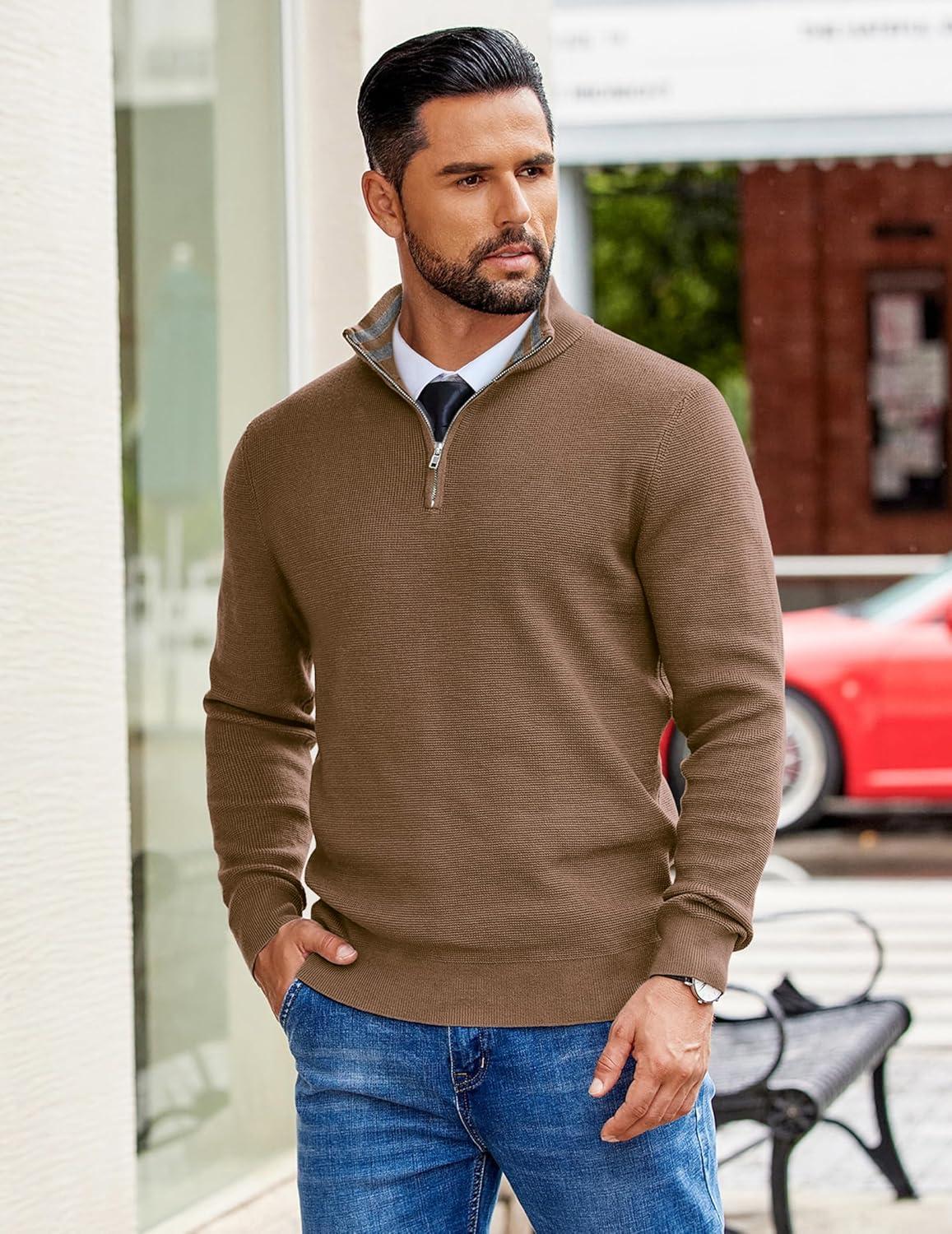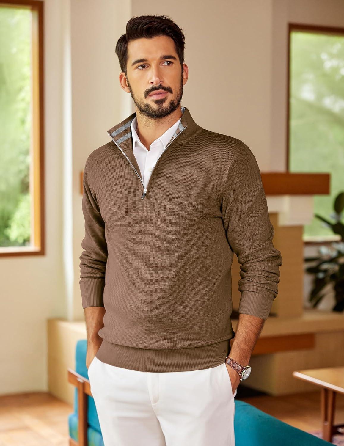 COOFANDY Mens Quarter Zip Pullover Slim Fit Lightweight Sweater Casual Mock Neck Knit Polo Sweater(Ash Brown)