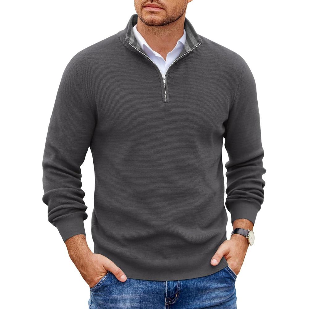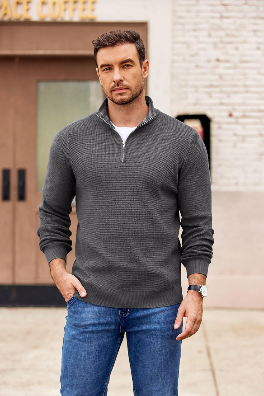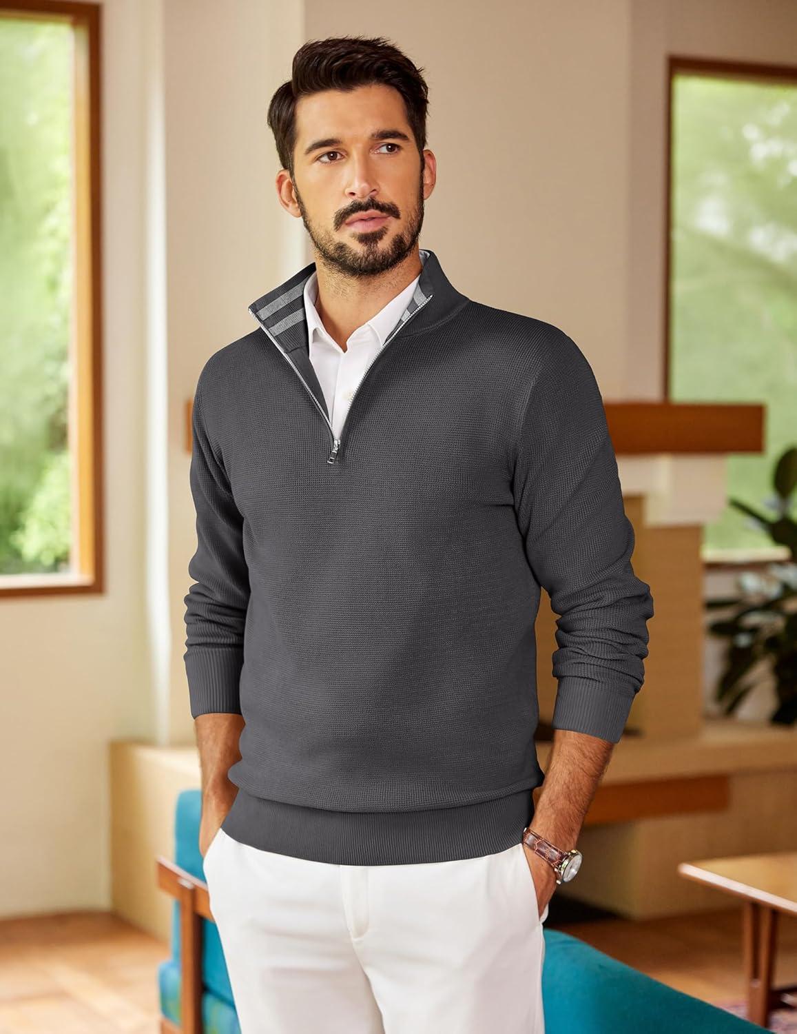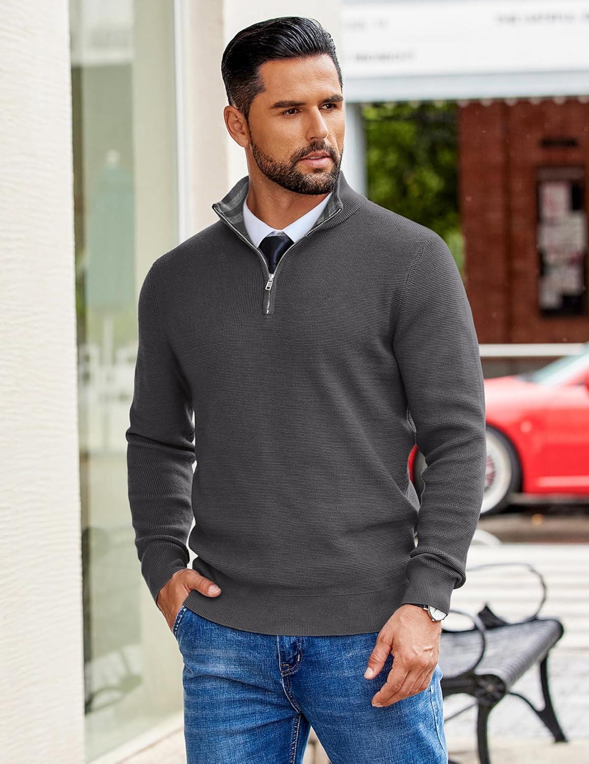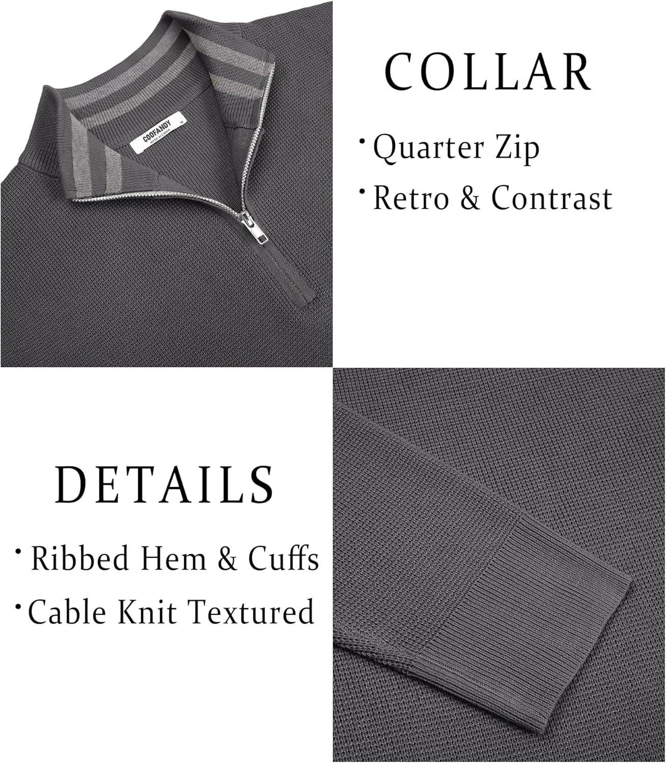 COOFANDY Mens Quarter Zip Pullover Slim Fit Lightweight Sweater Casual Mock Neck Knit Polo Sweater(Dark Gray)