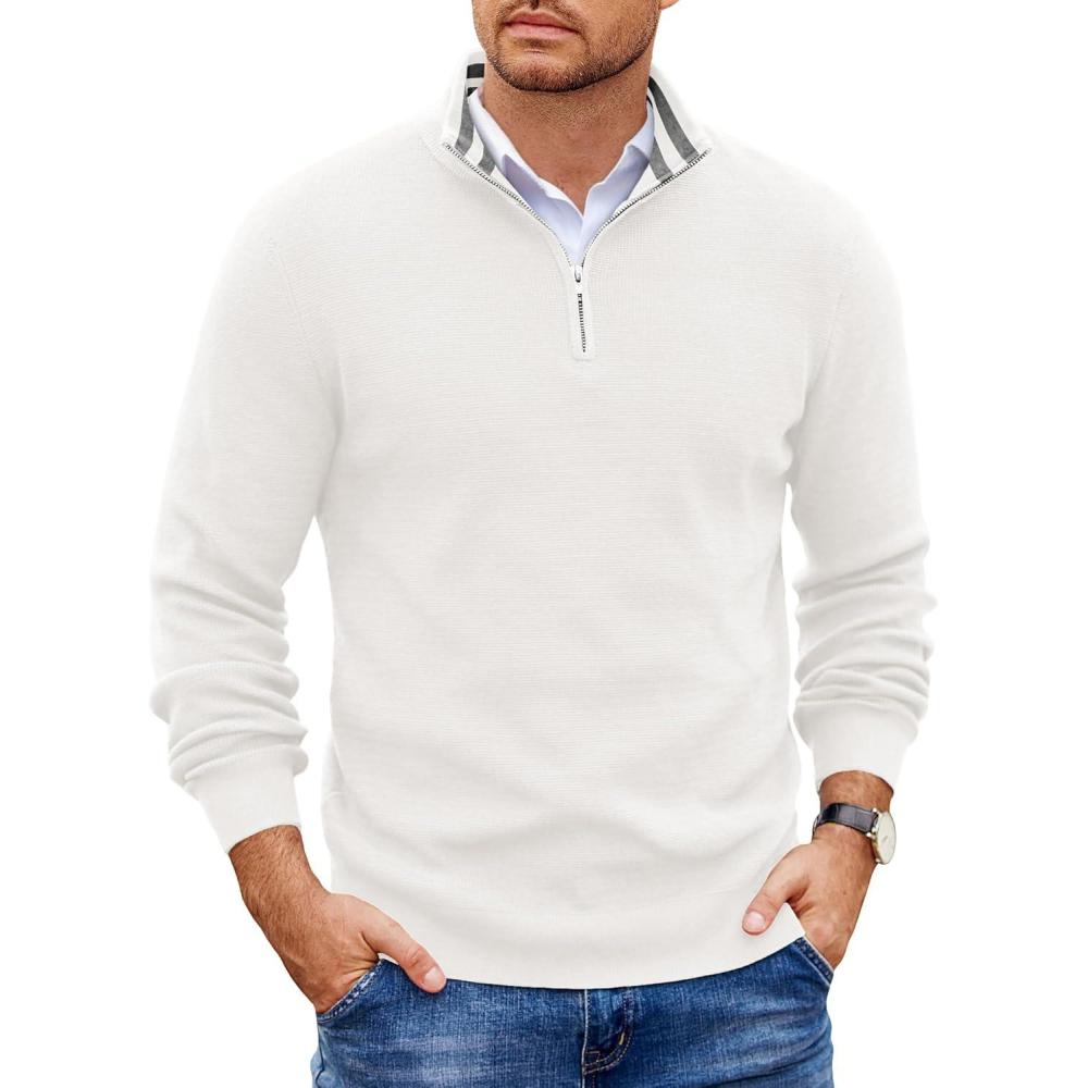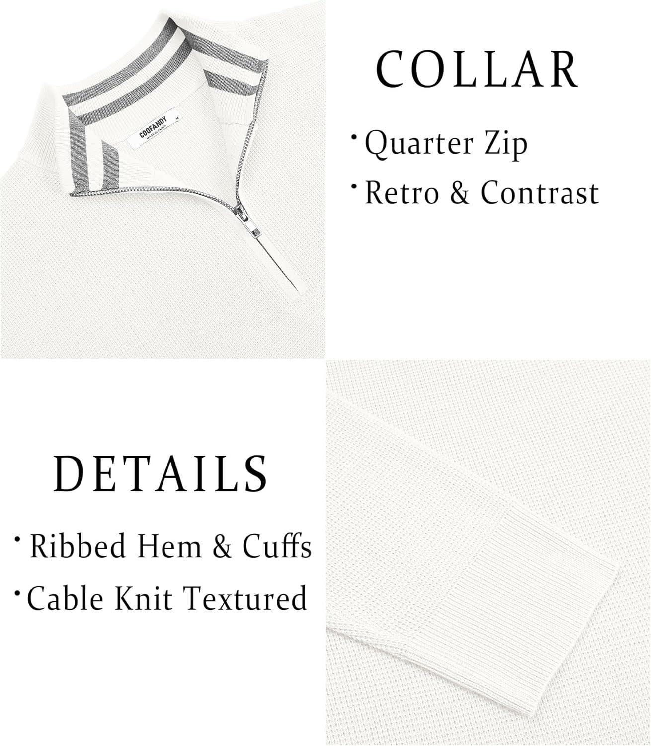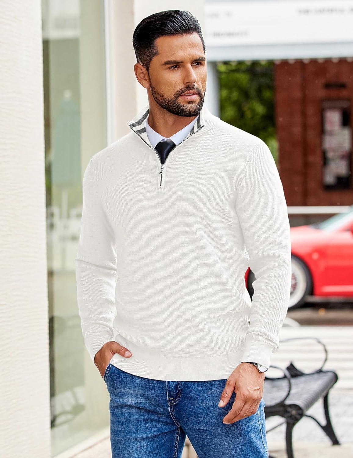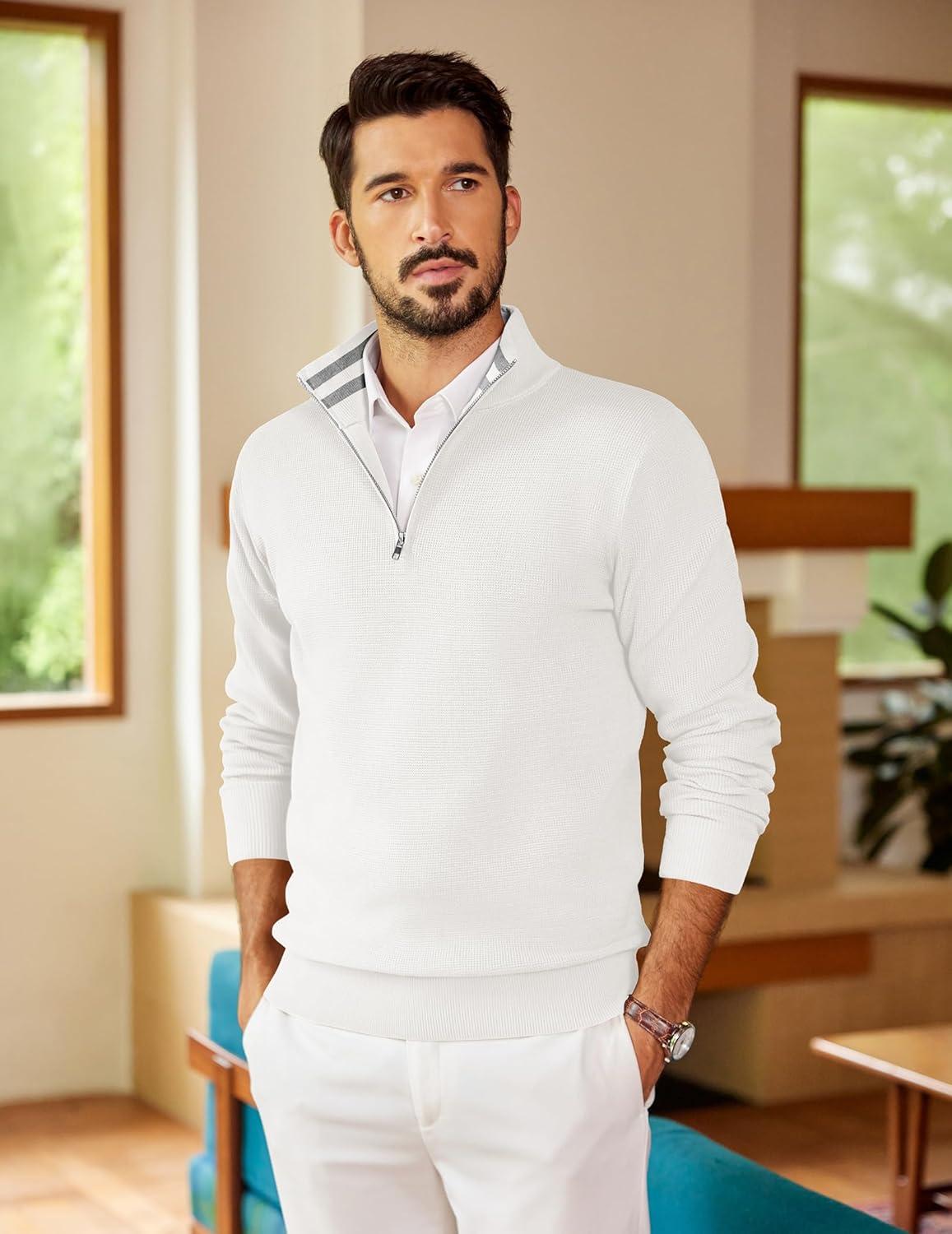 COOFANDY Mens Quarter Zip Pullover Slim Fit Lightweight Sweater Casual Mock Neck Knit Polo Sweater(White)
