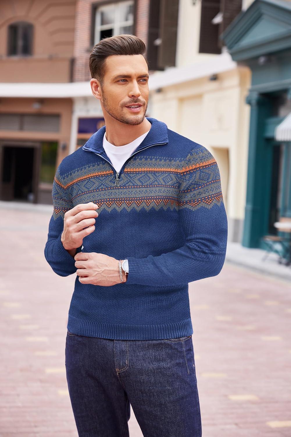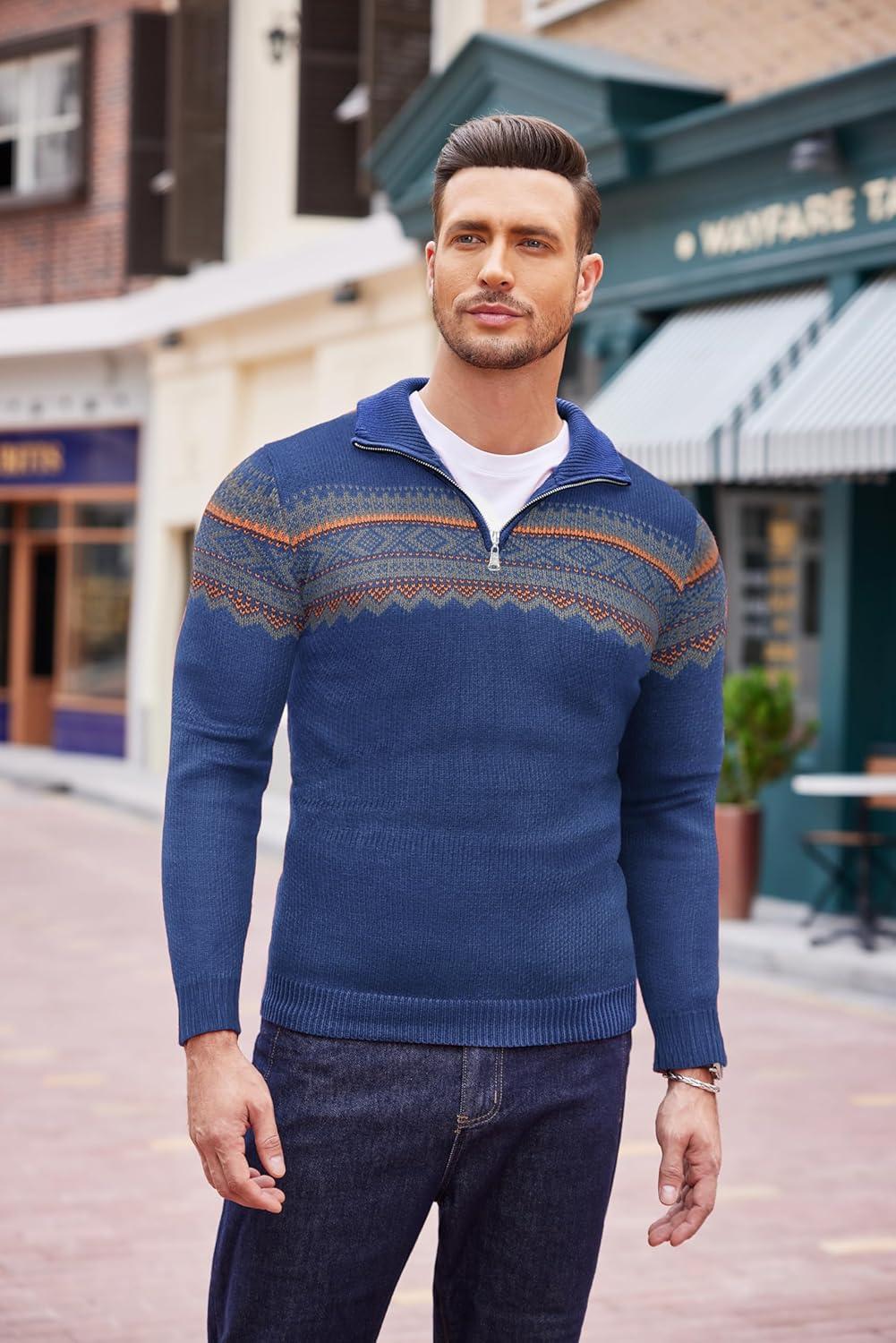 COOFANDY Men's Quarter Zip Pullover Sweater Casual Zip Up Polo Sweater Knit(Pat9 Royal Blue)
