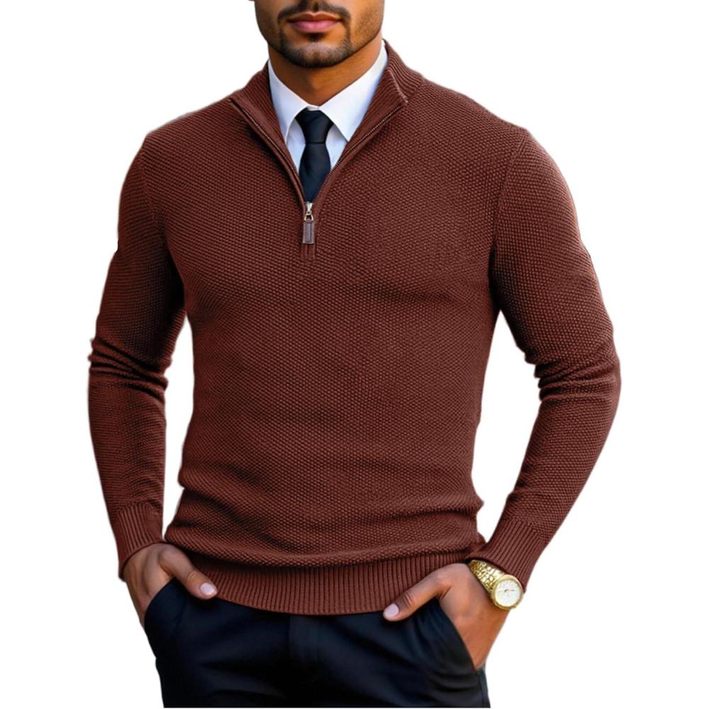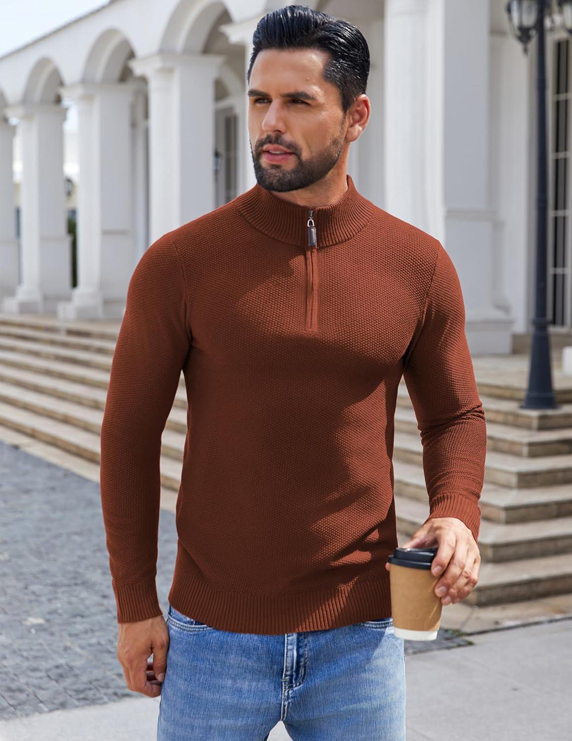 COOFANDY Men's Quarter Zip Pullover Sweater Slim Fit Knit Mock Neck Polo Sweaters(Terracotta)